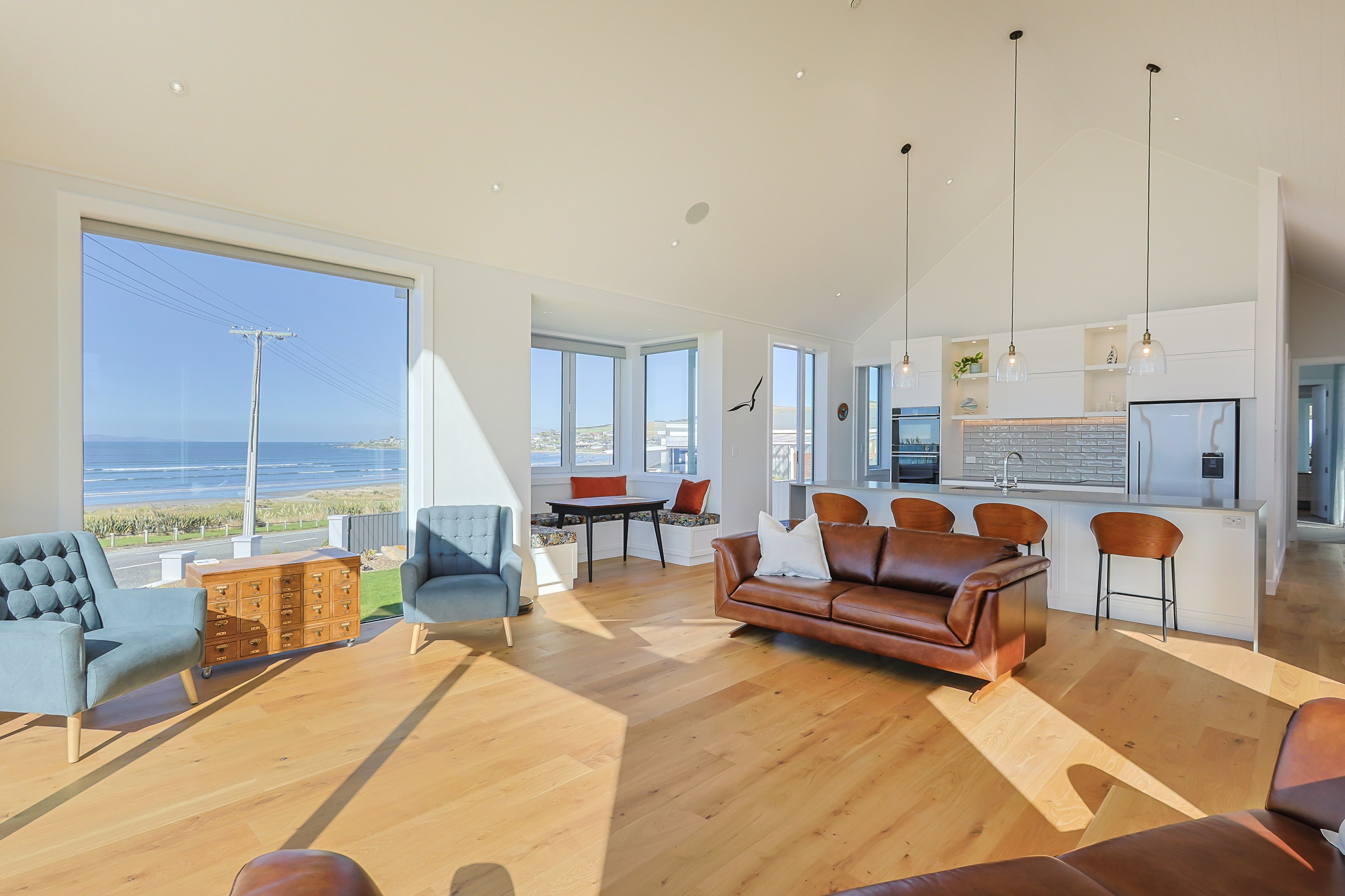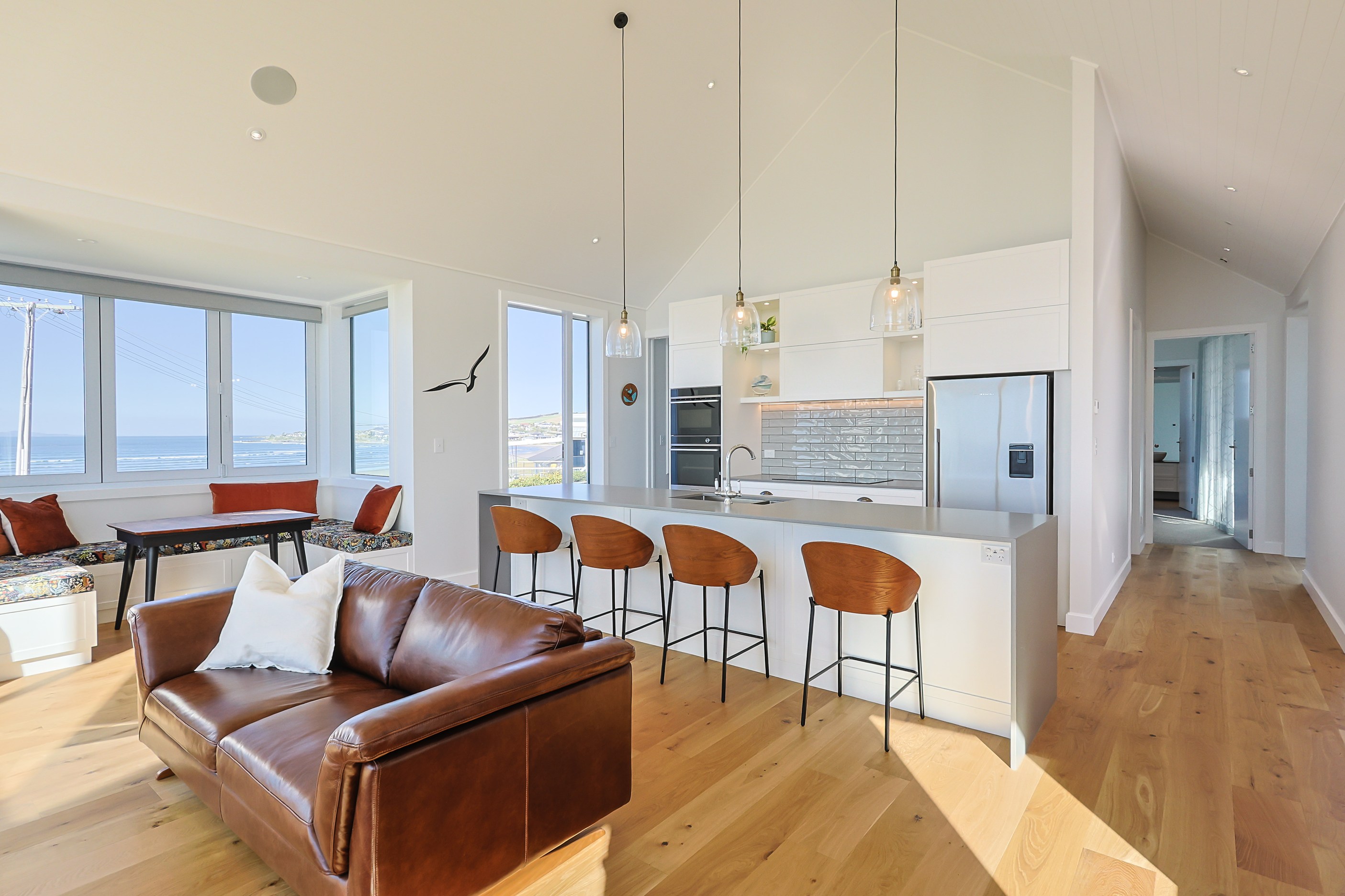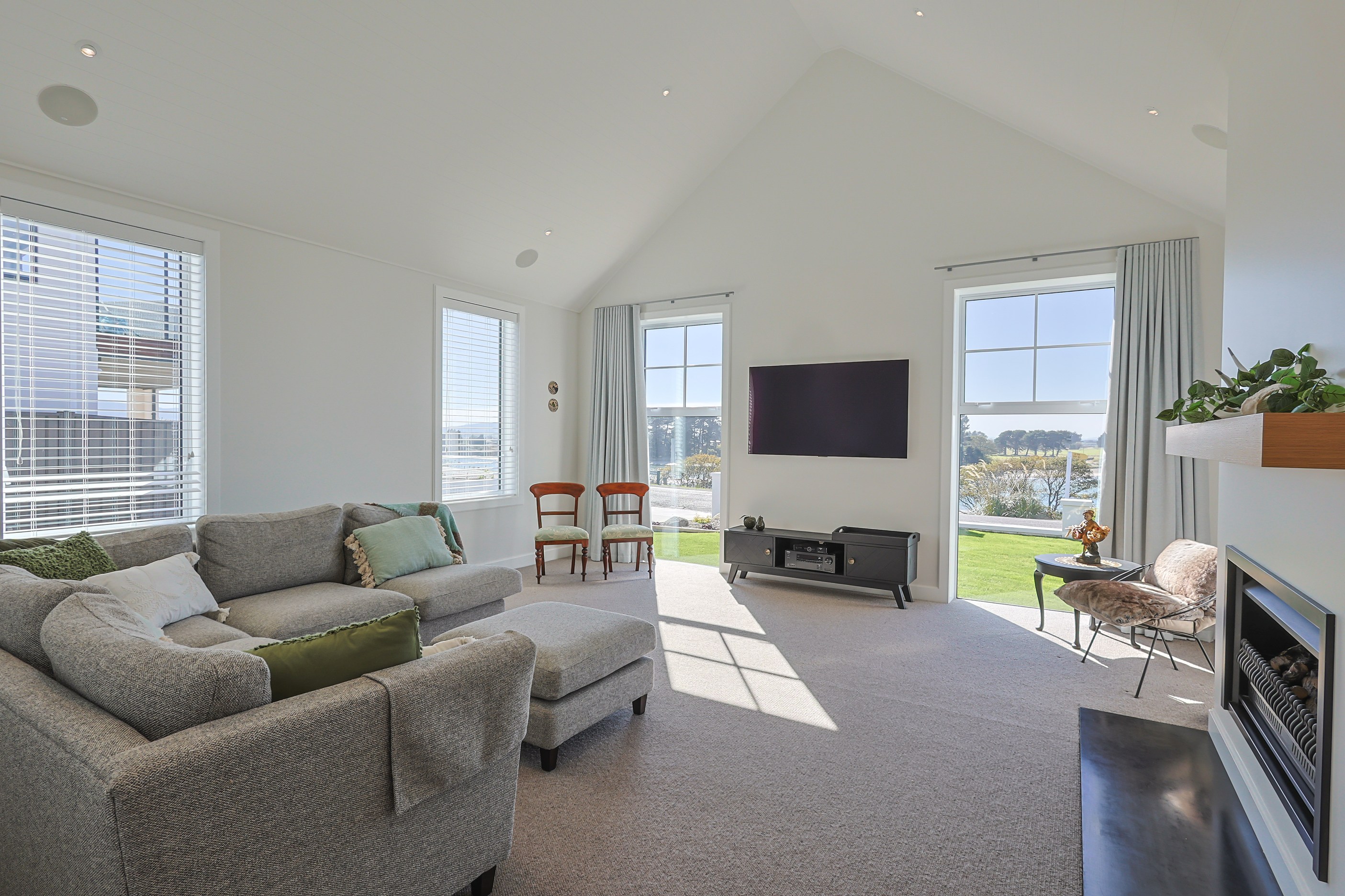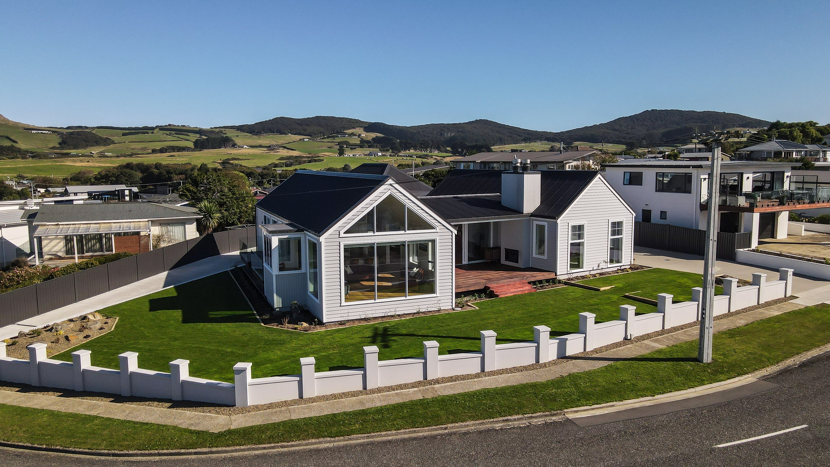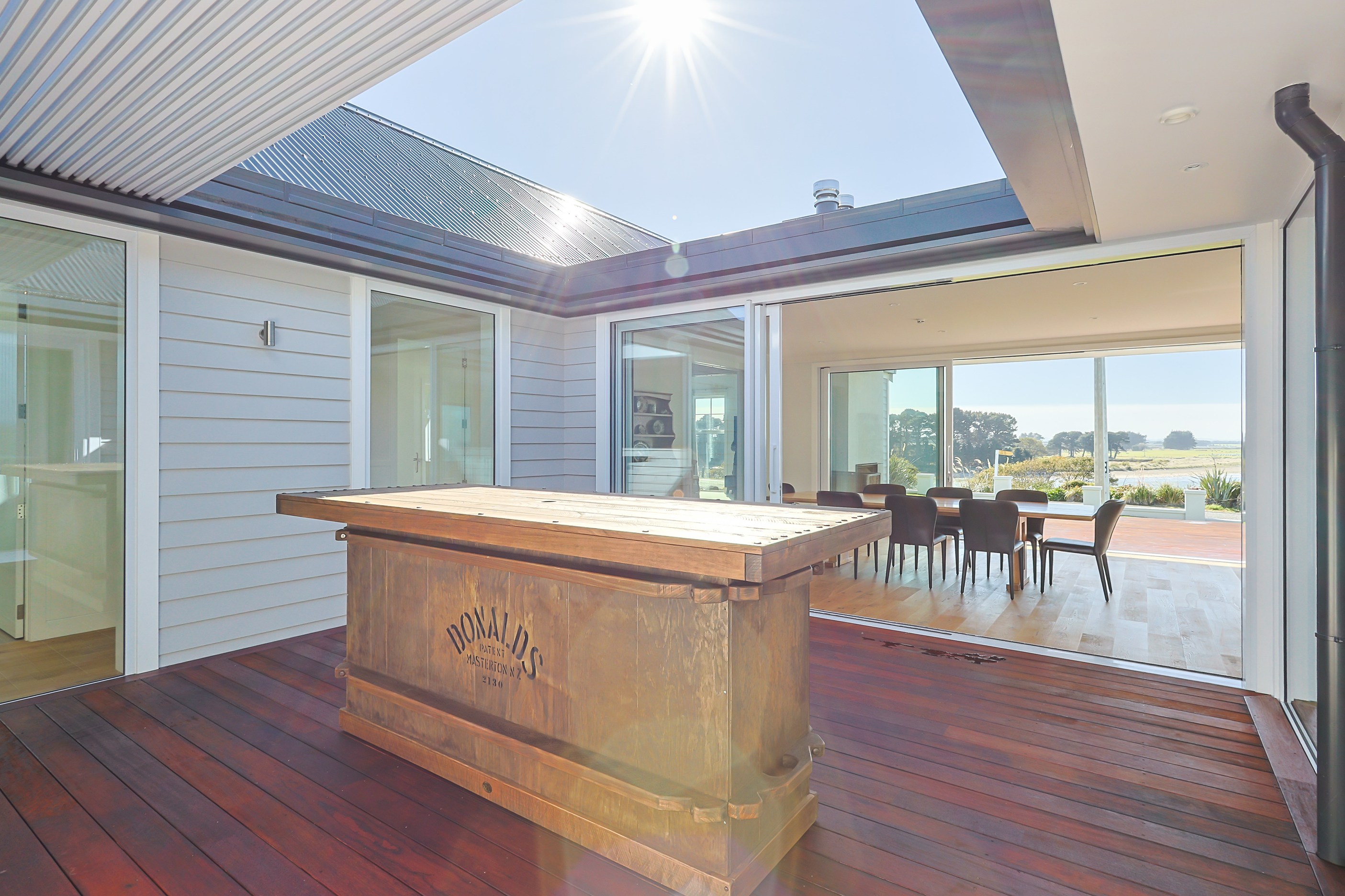 How do you do justice to a wedge-shaped site with 180-degree sea views? Exactly what the owners of this house did — with the help of trusted local builders. This 366sqm weatherboard home comprises two linked pavilions that open fan-like to views of Taramea Bay and the Aparima Estuary. Thoughtful, clever architecture, including use of coast-hardy materials, provides beautiful outdoor places in which to drink in the views. Out front a sheltered deck with an outdoor fire invites year-round relaxation, but there are plenty of other tucked-away nooks. One is a spa deck out the back; another is a central courtyard with louvre roof – an oasis at the heart of the home.