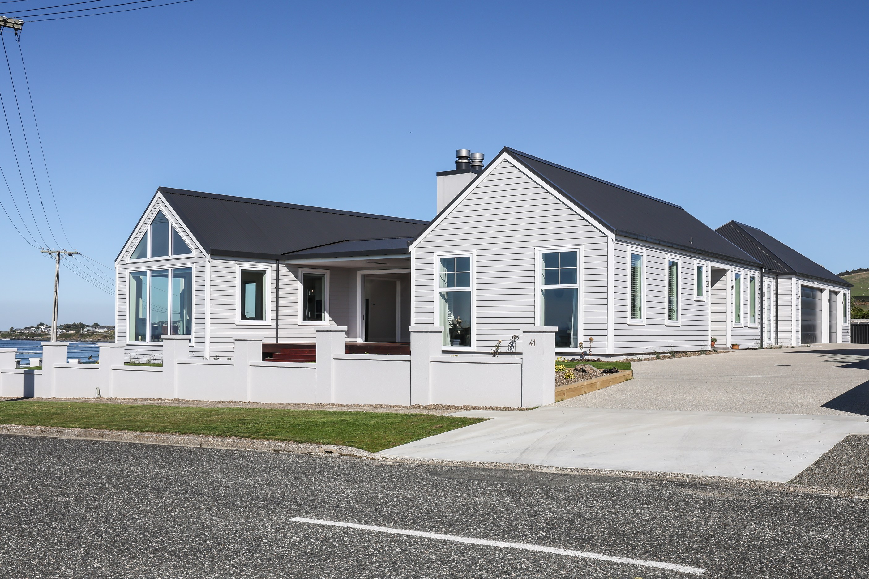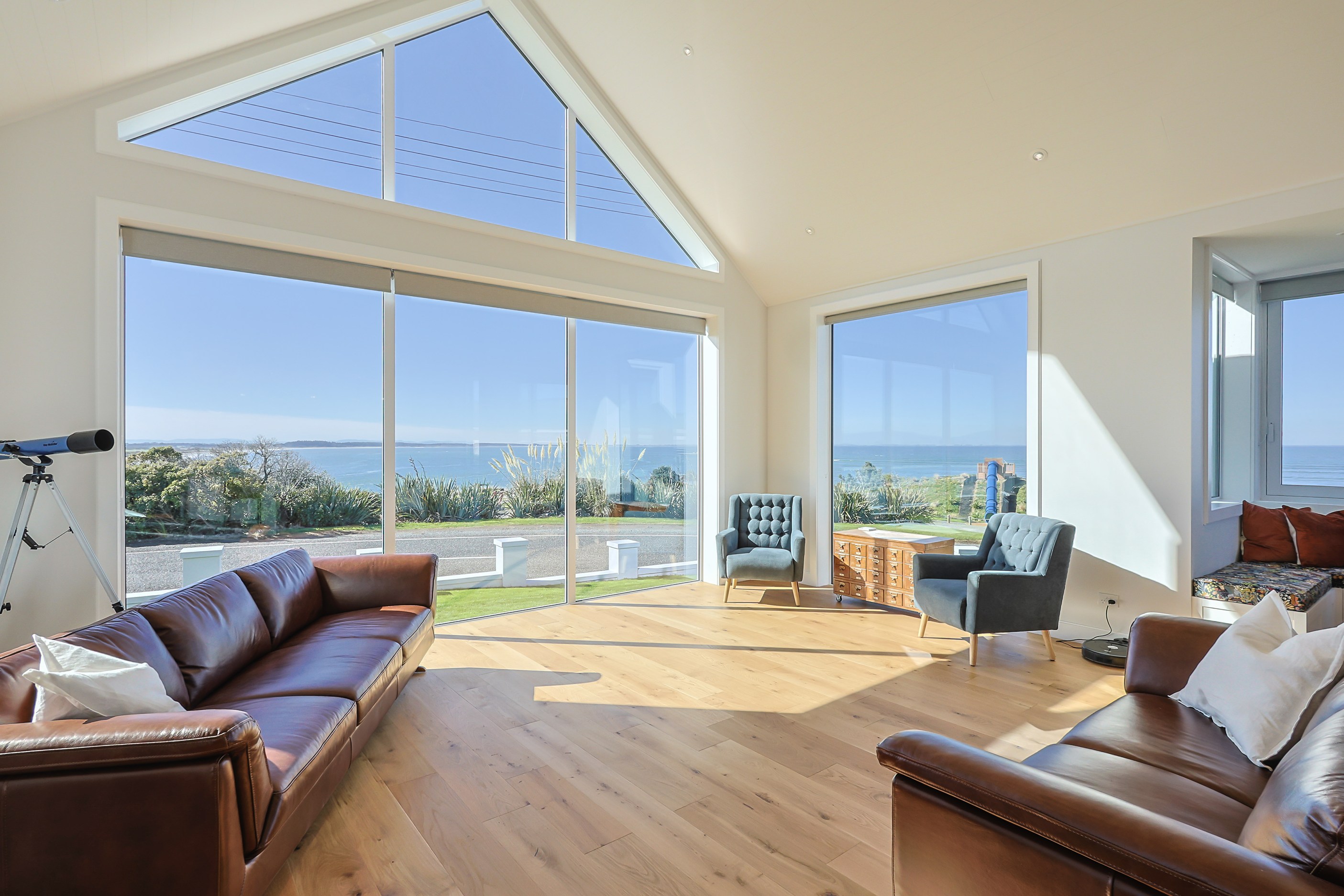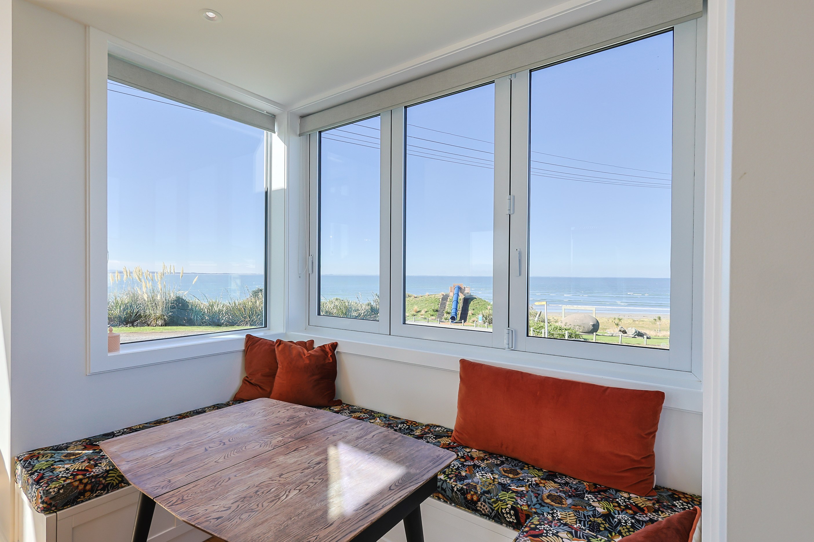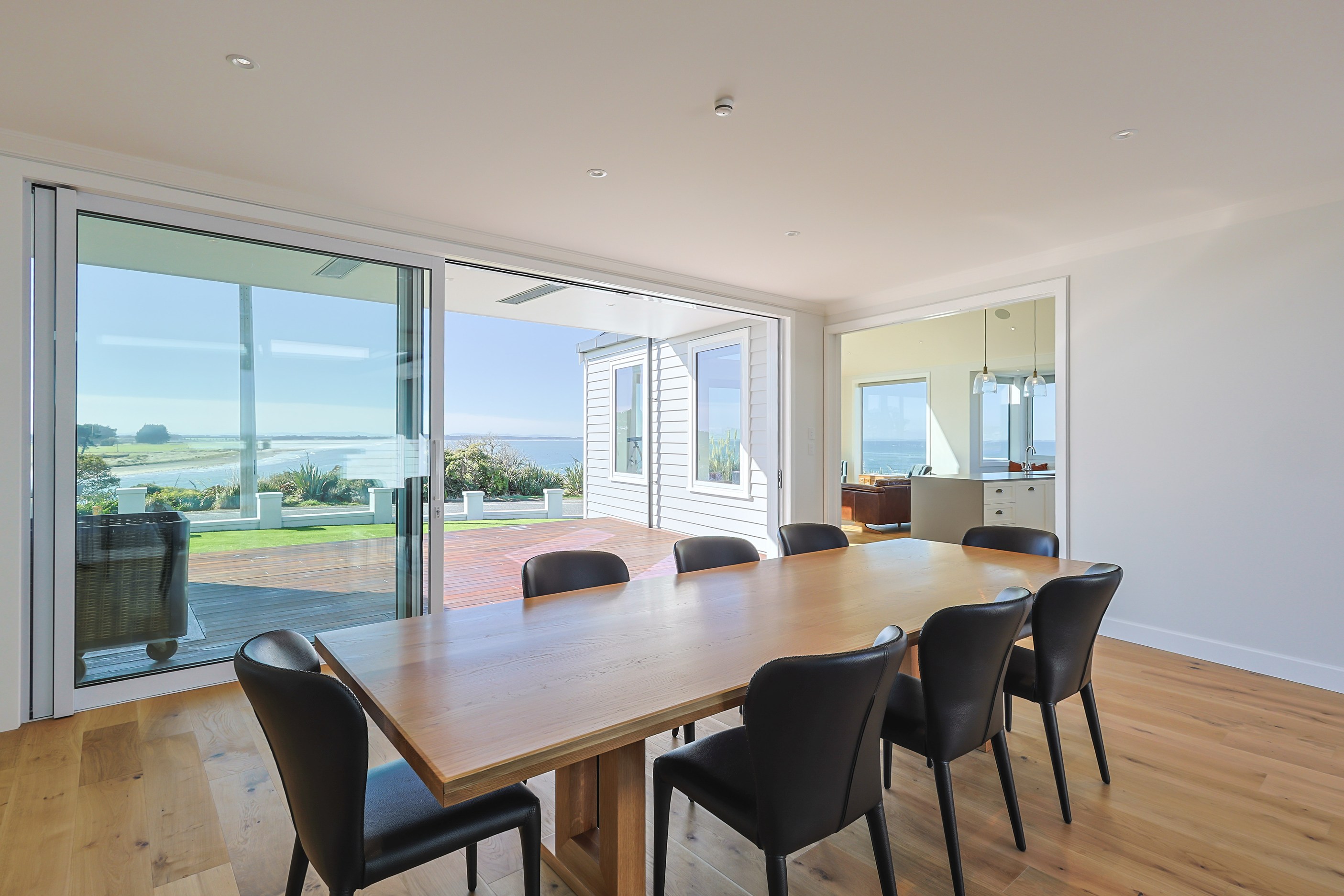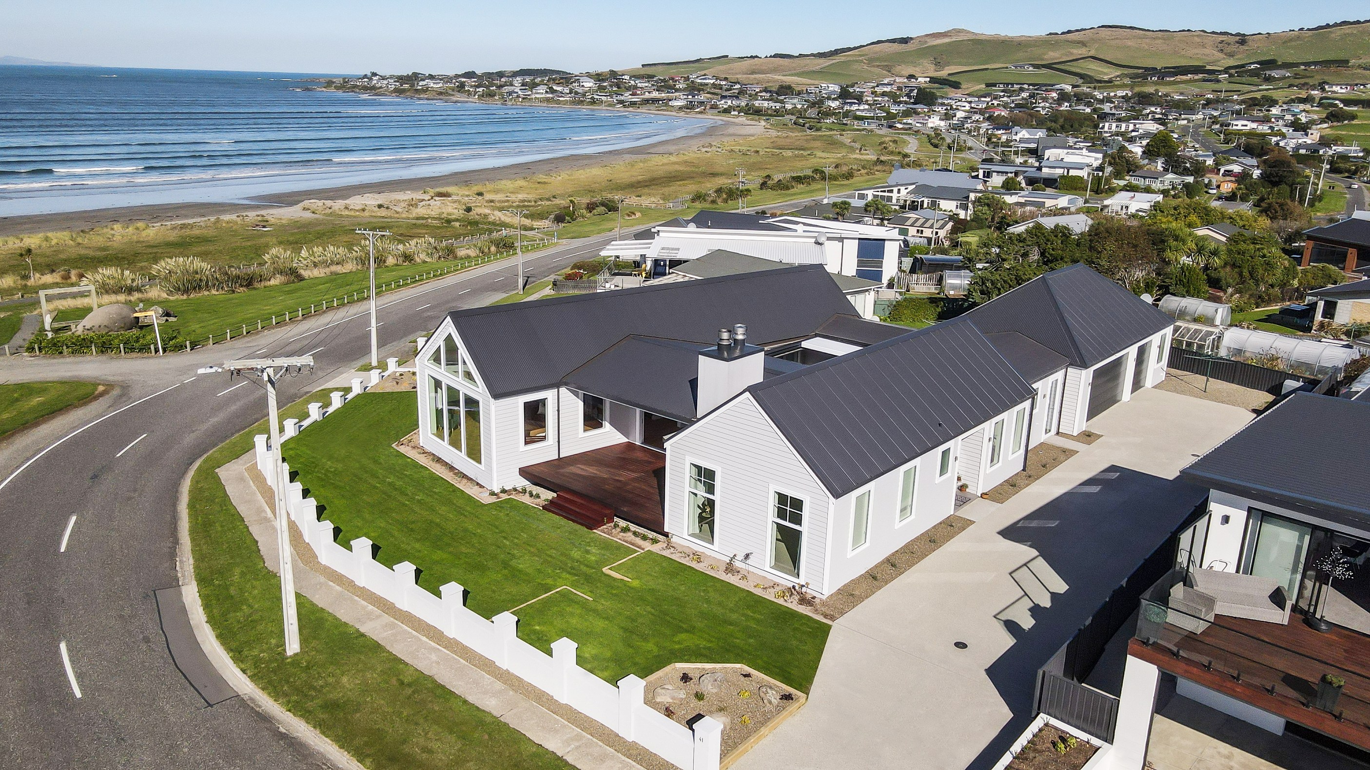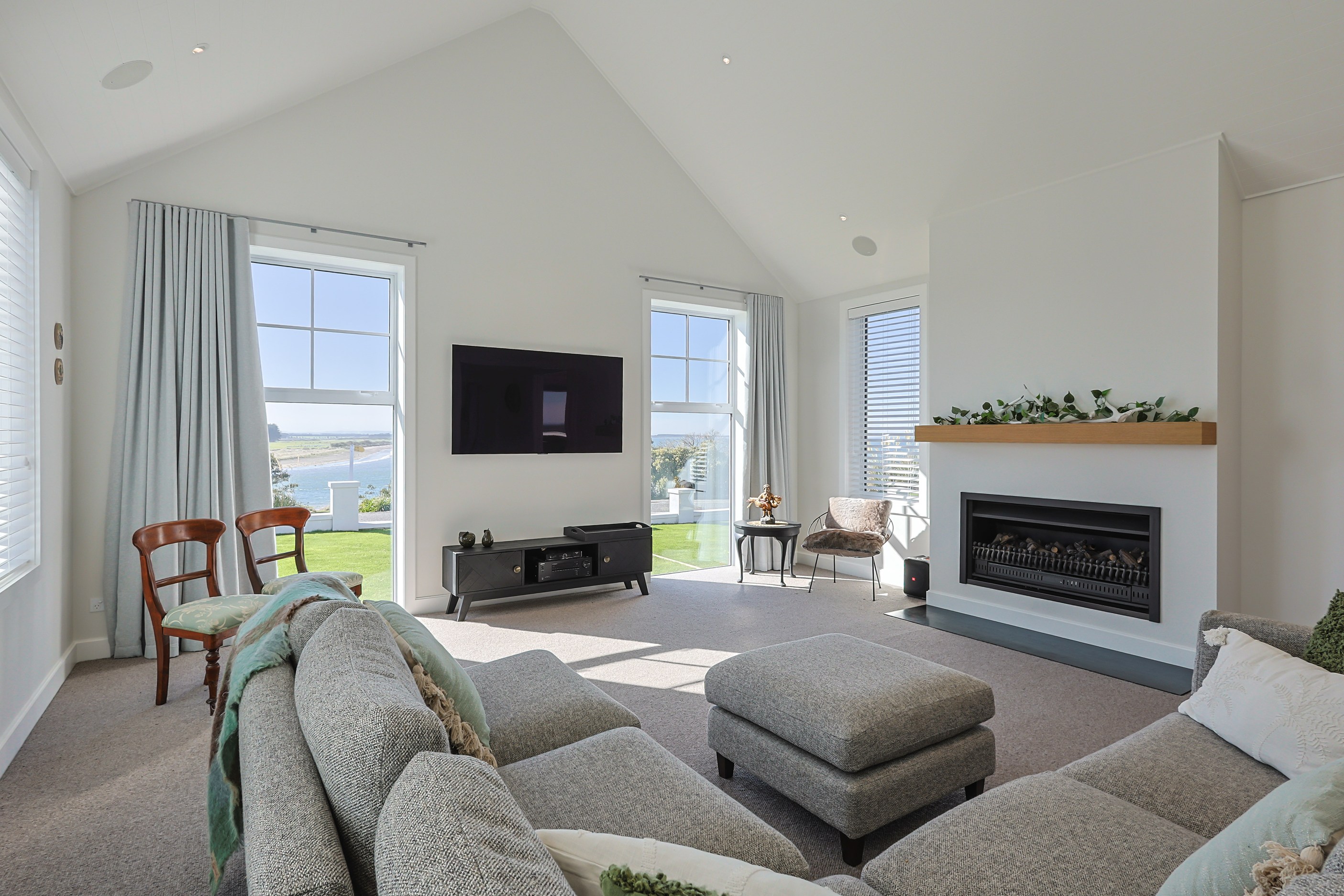 How do you do justice to a wedge-shaped site with 180-degree sea views? Exactly what the owners of this house did — with the help of trusted local builders. This 366sqm weatherboard home comprises two linked pavilions that open fan-like to views of Taramea Bay and the Aparima Estuary. Thoughtful, clever architecture, including use of coast-hardy materials, provides beautiful outdoor places in which to drink in the views. Out front a sheltered deck with an outdoor fire invites year-round relaxation, but there are plenty of other tucked-away nooks. One is a spa deck out the back; another is a central courtyard with louvre roof – an oasis at the heart of the home.