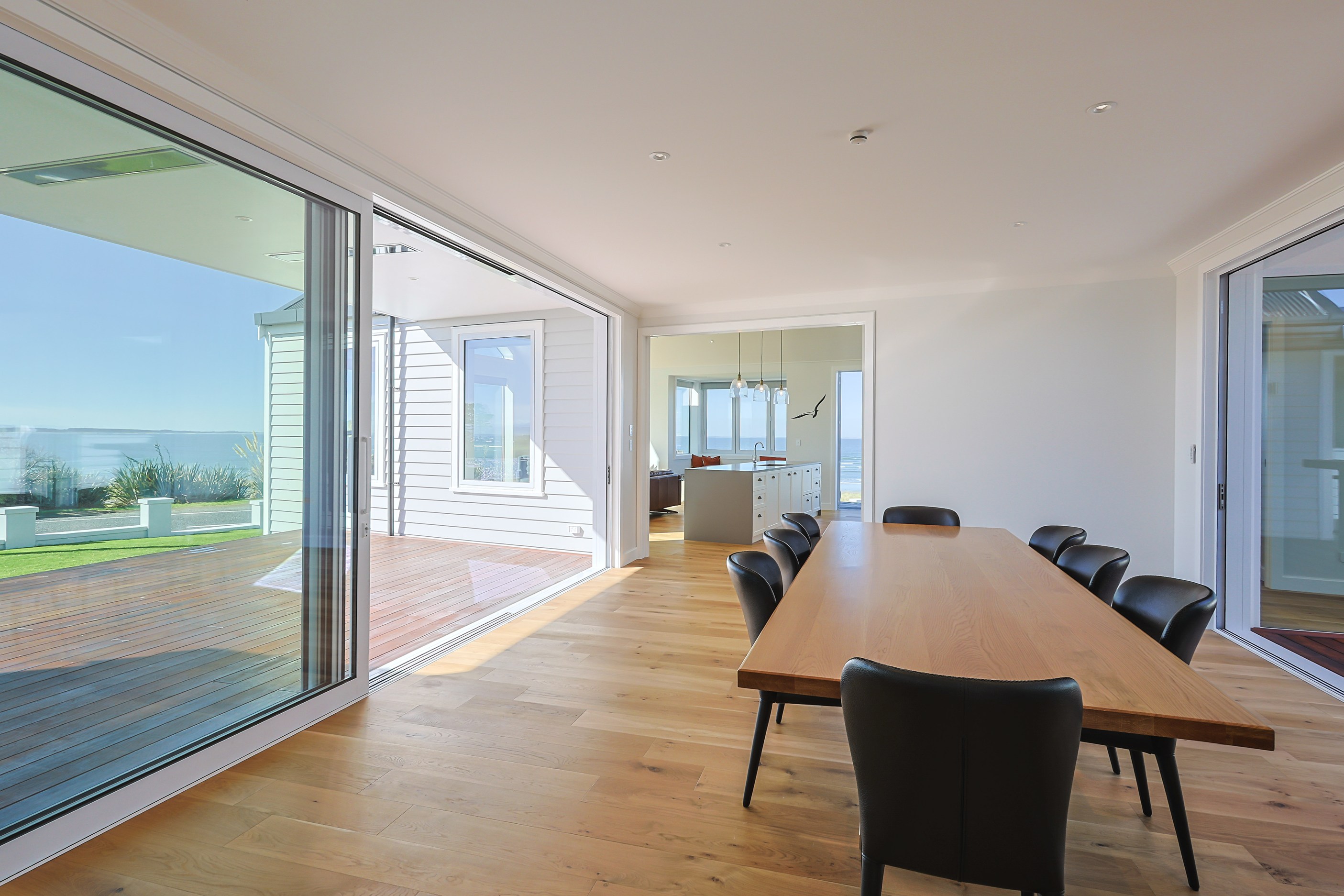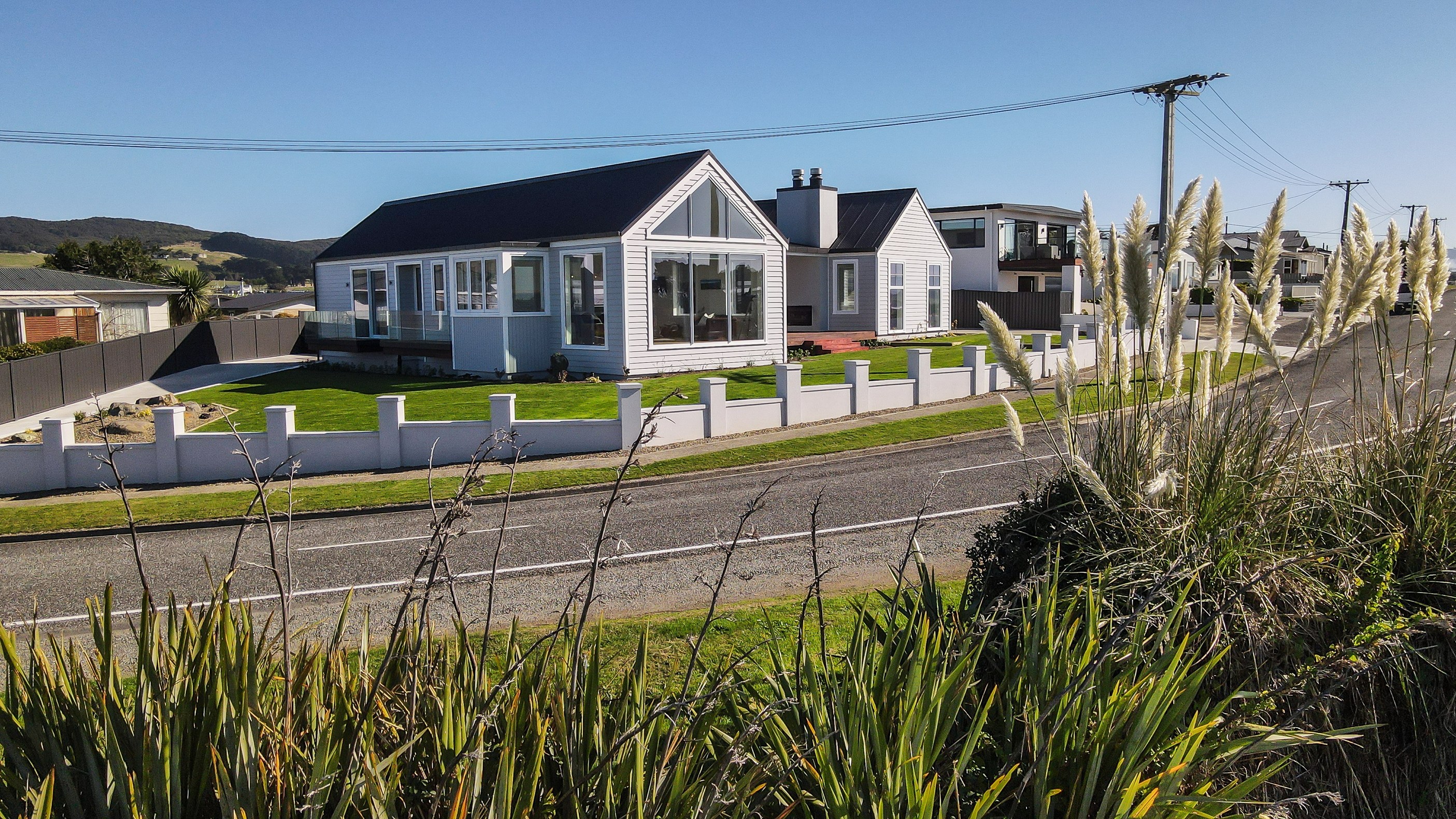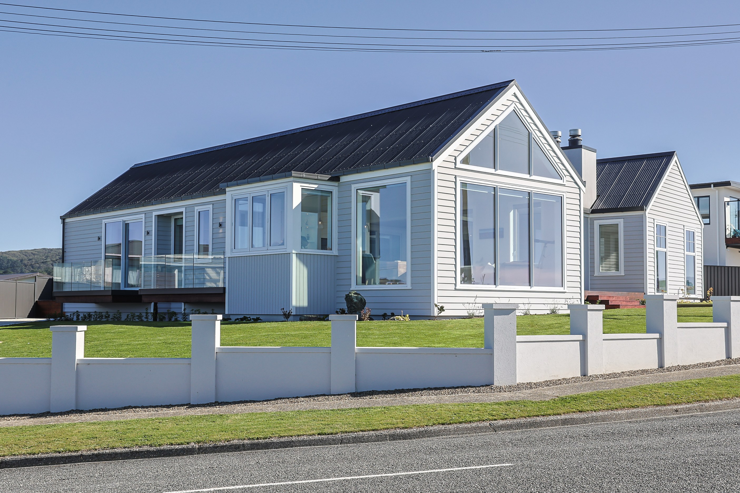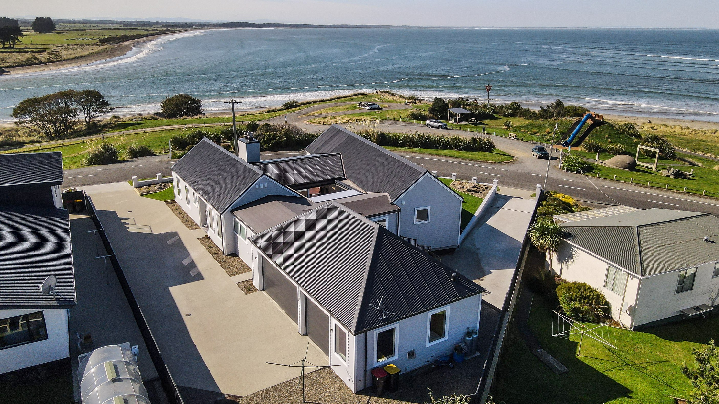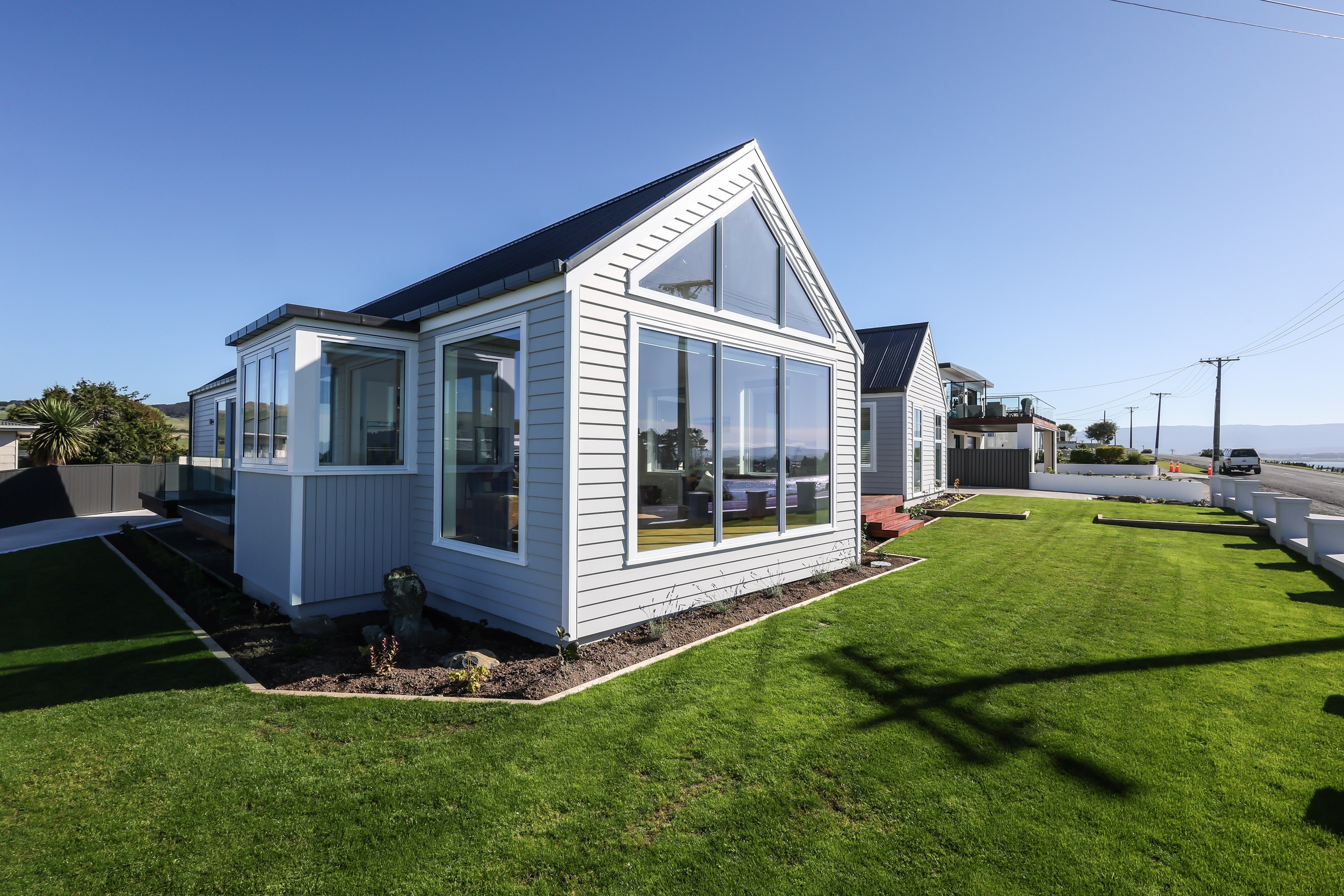 How do you do justice to a wedge-shaped site with 180-degree sea views? Exactly what the owners of this house did — with the help of trusted local builders. This 366sqm weatherboard home comprises two linked pavilions that open fan-like to views of Taramea Bay and the Aparima Estuary. Thoughtful, clever architecture, including use of coast-hardy materials, provides beautiful outdoor places in which to drink in the views. Out front a sheltered deck with an outdoor fire invites year-round relaxation, but there are plenty of other tucked-away nooks. One is a spa deck out the back; another is a central courtyard with louvre roof – an oasis at the heart of the home.