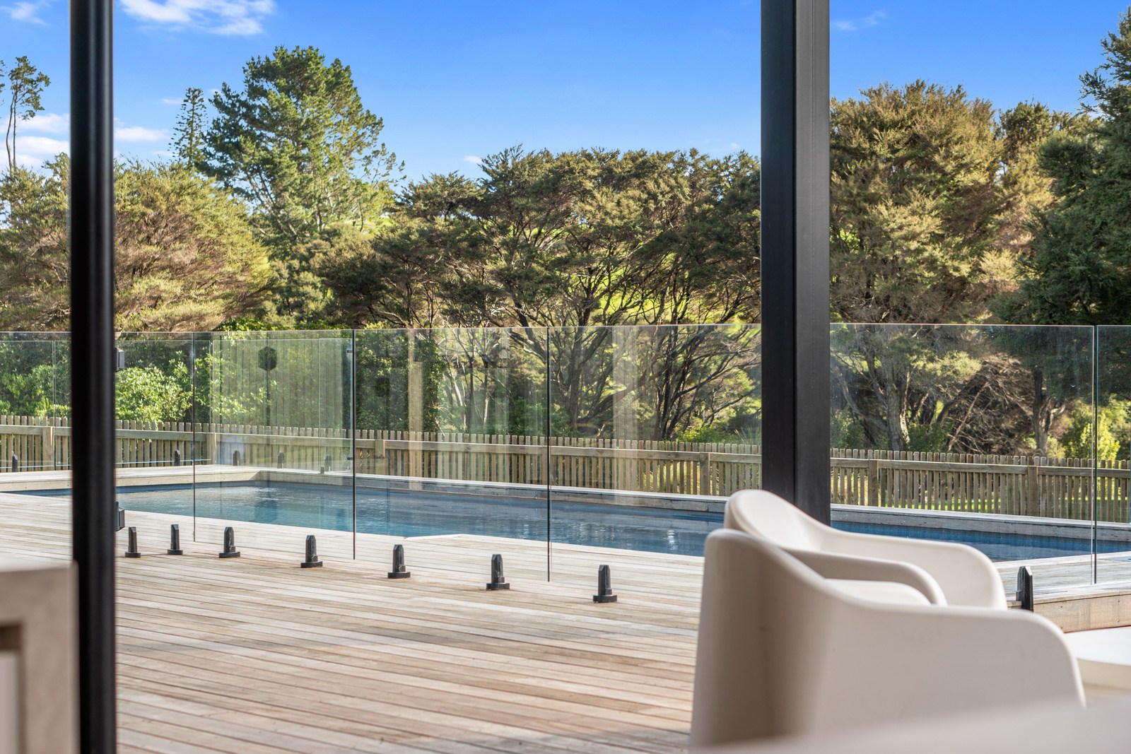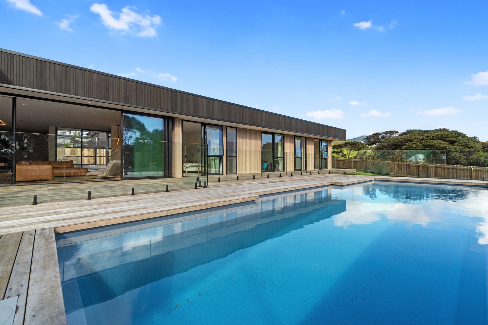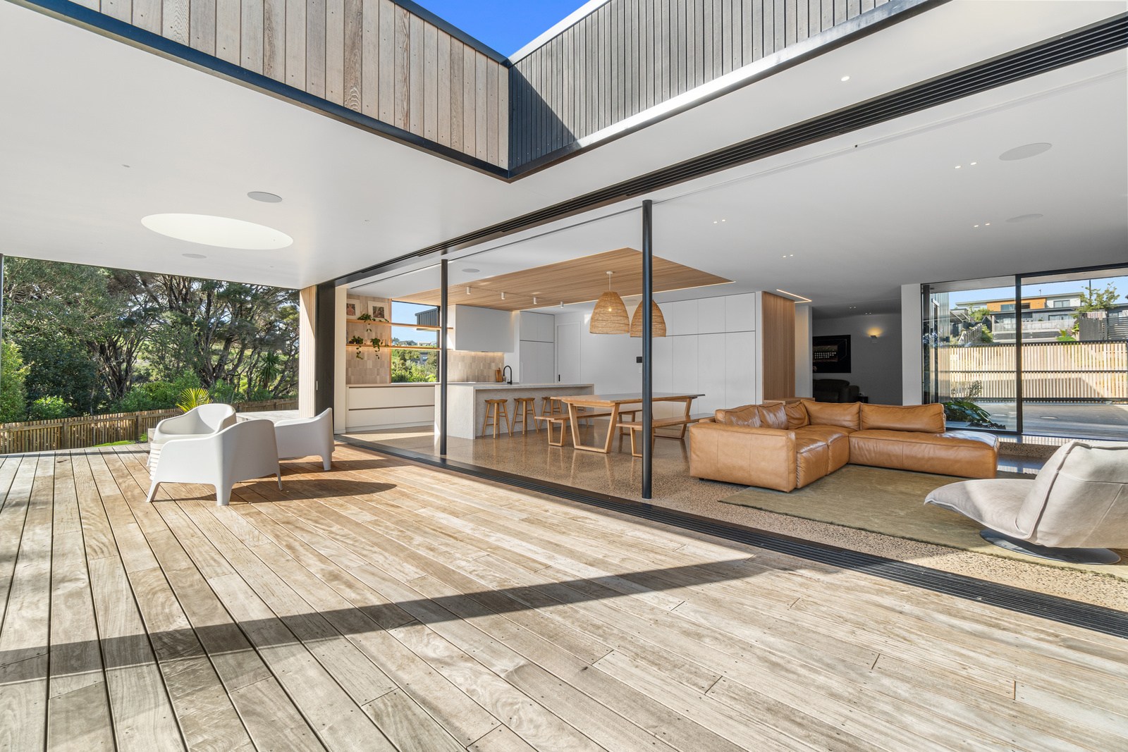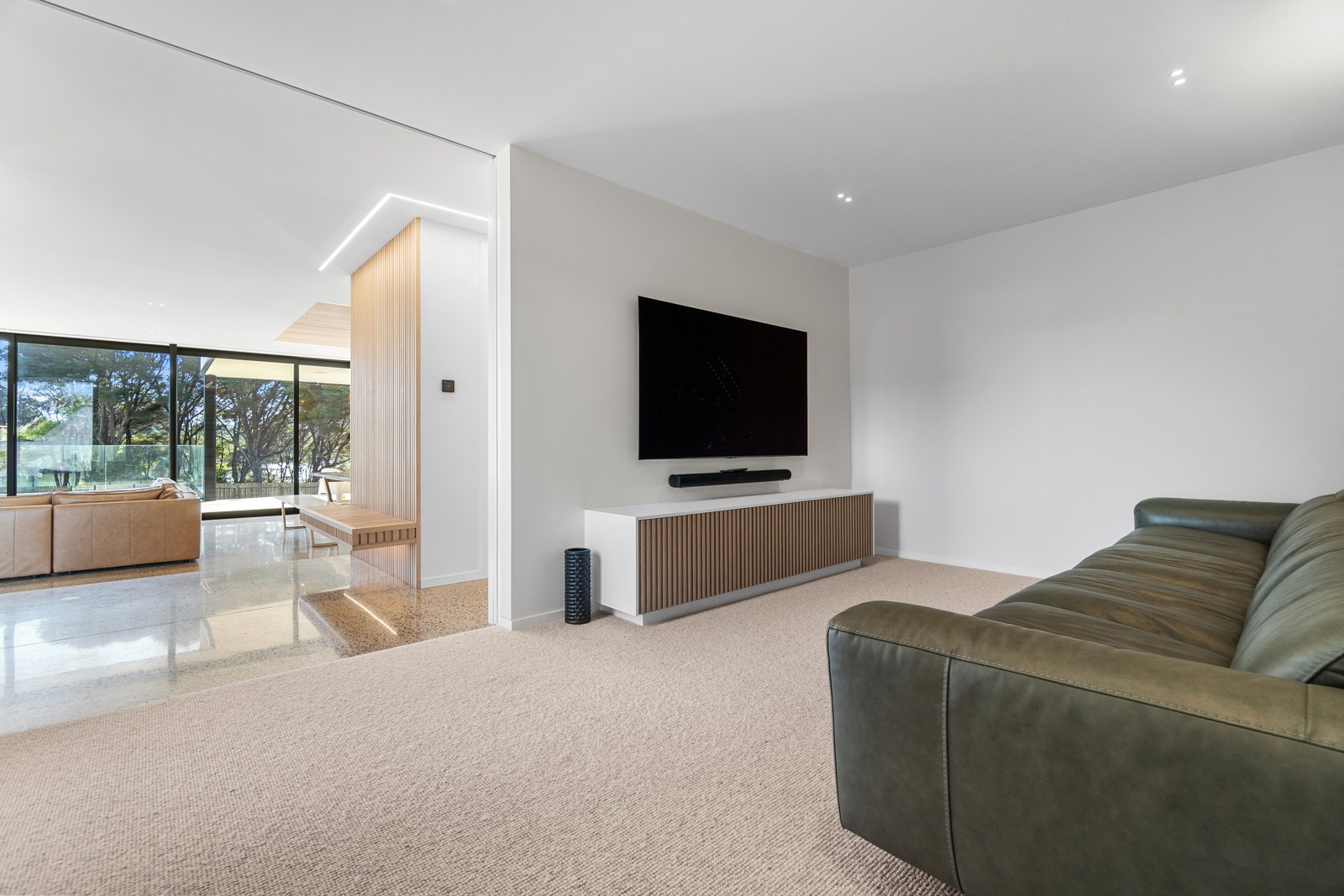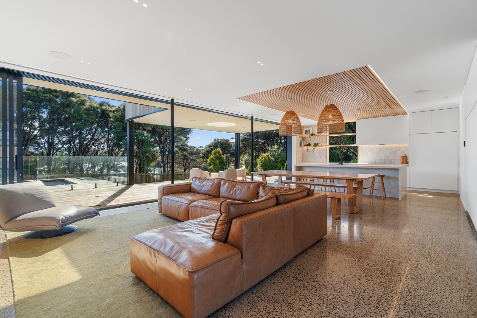 Hardwood decking stretches along the seafacing length of the home, some of it covered, and extends out to an in-ground pool. It also winds around the northern side of the house providing a private outdoor space that flows from the main bedroom suite. On the opposite side, it turns the corner and links the southern end of the main building with the garage and an attached room with bathroom and laundry. Nominally a “man cave”, it also enjoys timber decking. The heart of this lovely home is the vast open-plan communal space with kitchen, dining and living spaces, plus a separate media room. Polished concrete floors and timber detailing translate to a sleek, industrial aesthetic. It’s an interior oasis. Three bedrooms, an office and a tiled family bathroom with a bath can be found on one side, while the main suite with ensuite are on the other. This is prime peninsula living.