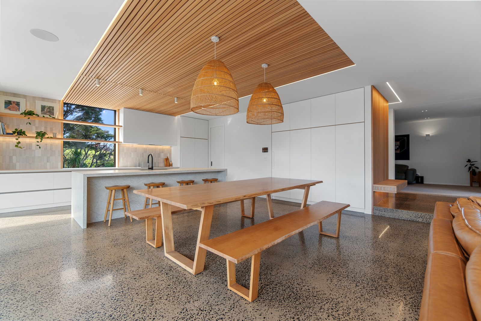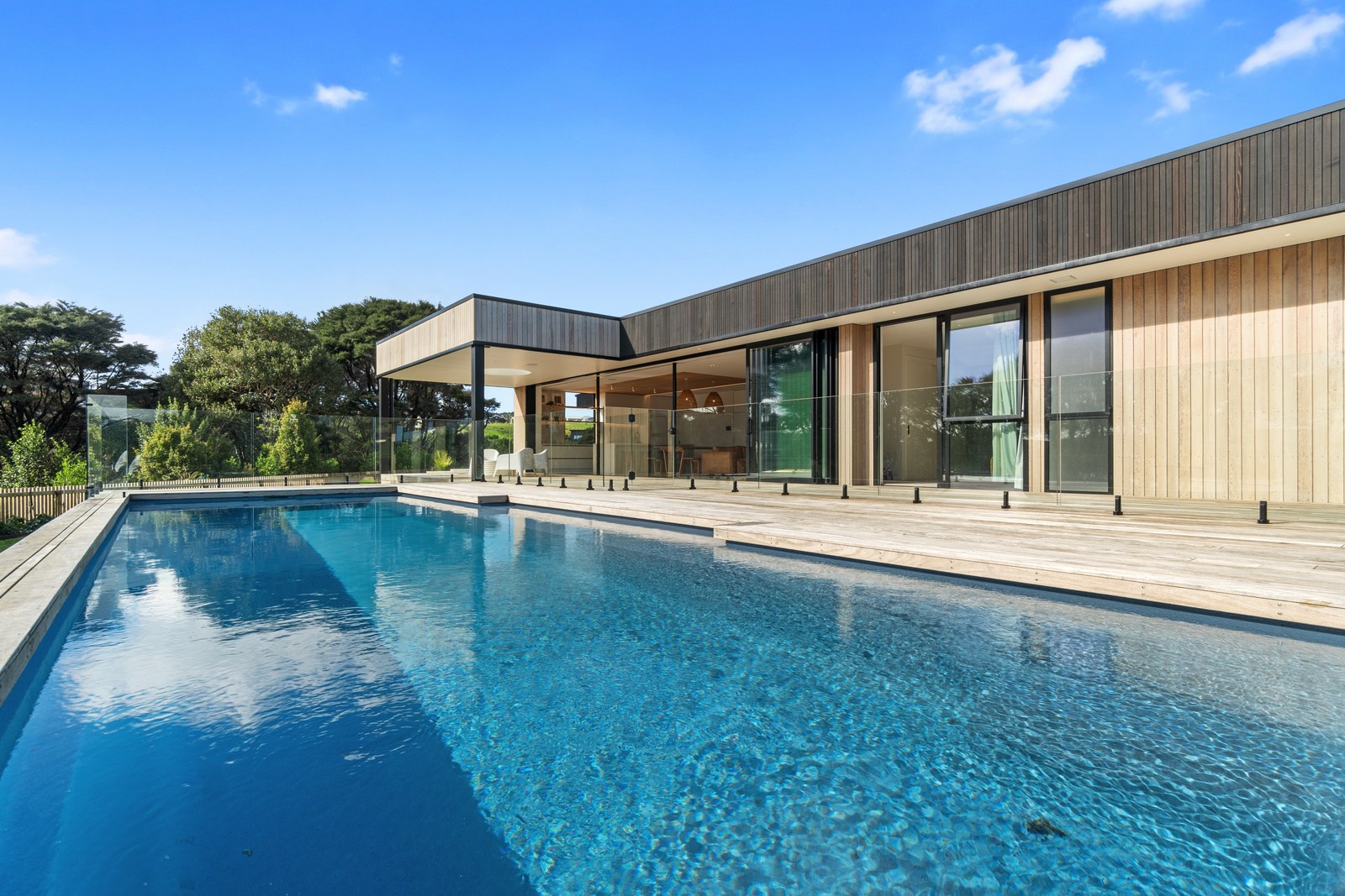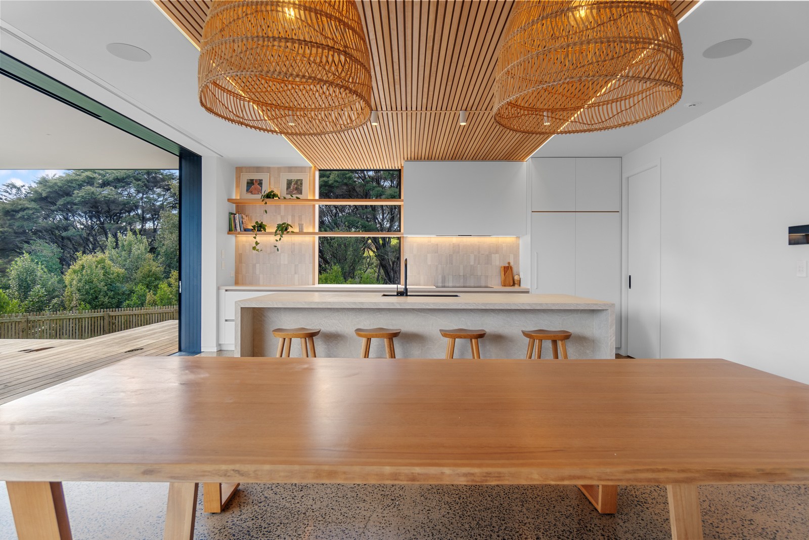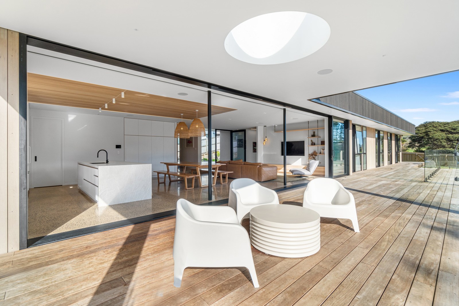Hardwood decking stretches along the seafacing length of the home, some of it covered, and extends out to an in-ground pool. It also winds around the northern side of the house providing a private outdoor space that flows from the main bedroom suite. On the opposite side, it turns the corner and links the southern end of the main building with the garage and an attached room with bathroom and laundry. Nominally a “man cave”, it also enjoys timber decking. The heart of this lovely home is the vast open-plan communal space with kitchen, dining and living spaces, plus a separate media room. Polished concrete floors and timber detailing translate to a sleek, industrial aesthetic. It’s an interior oasis. Three bedrooms, an office and a tiled family bathroom with a bath can be found on one side, while the main suite with ensuite are on the other. This is prime peninsula living.