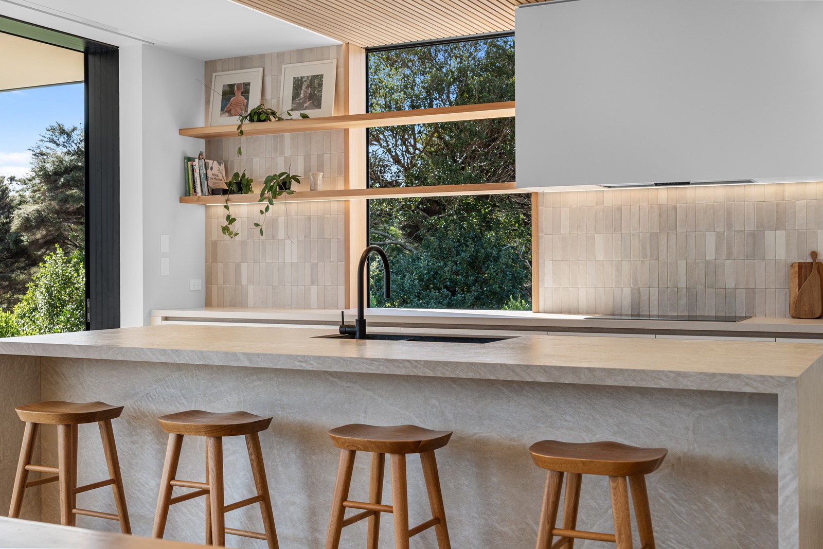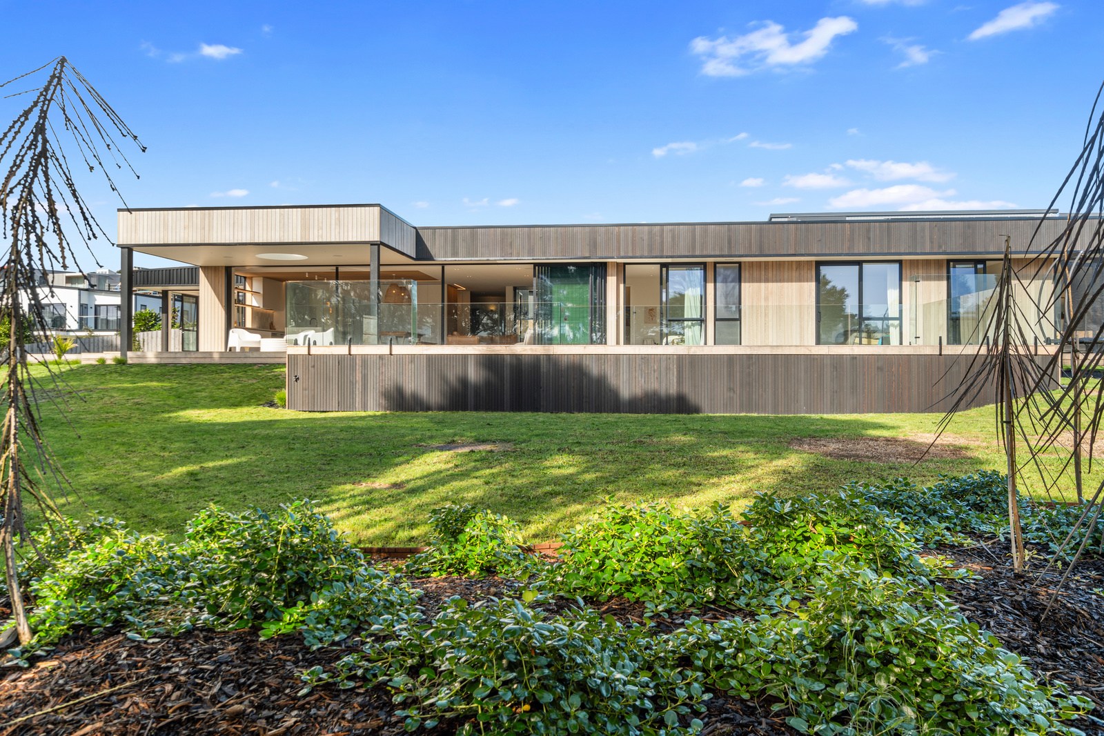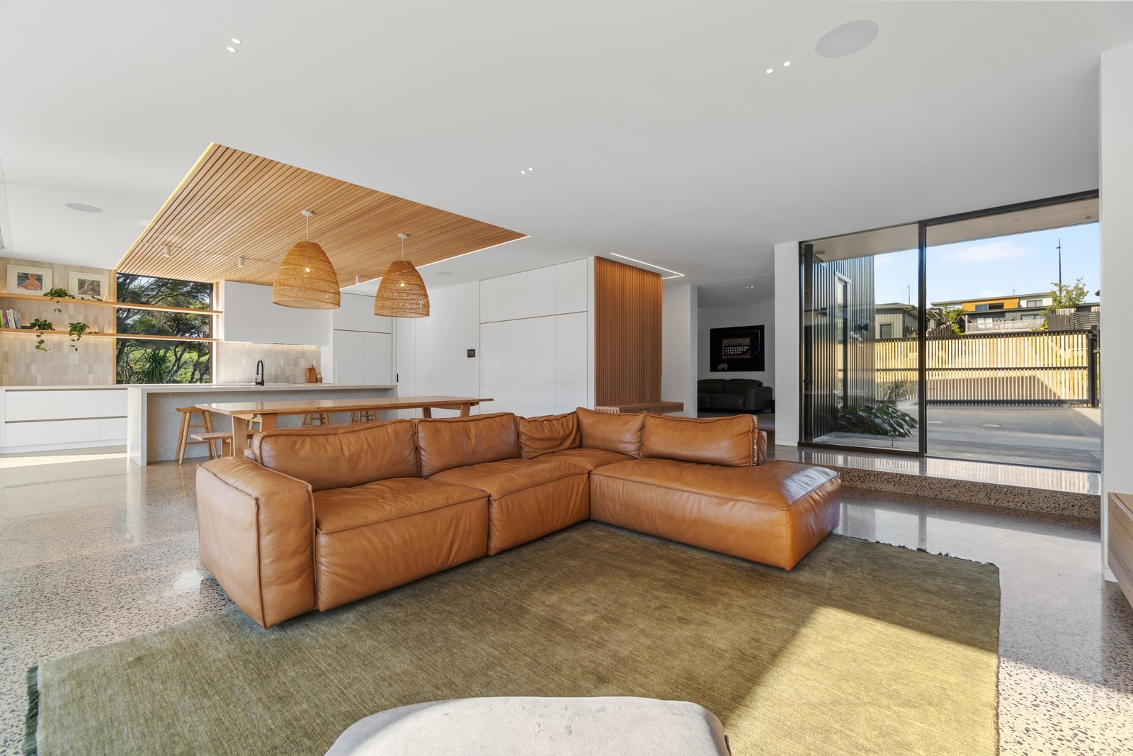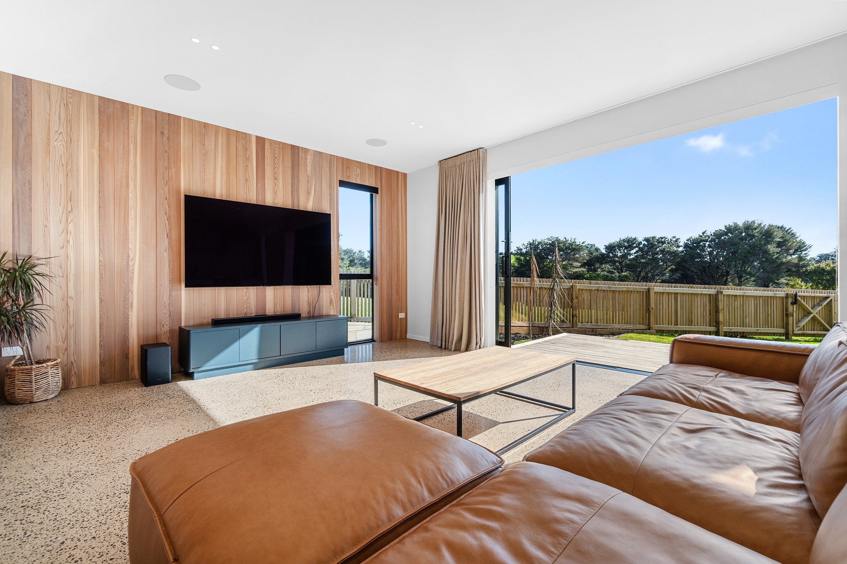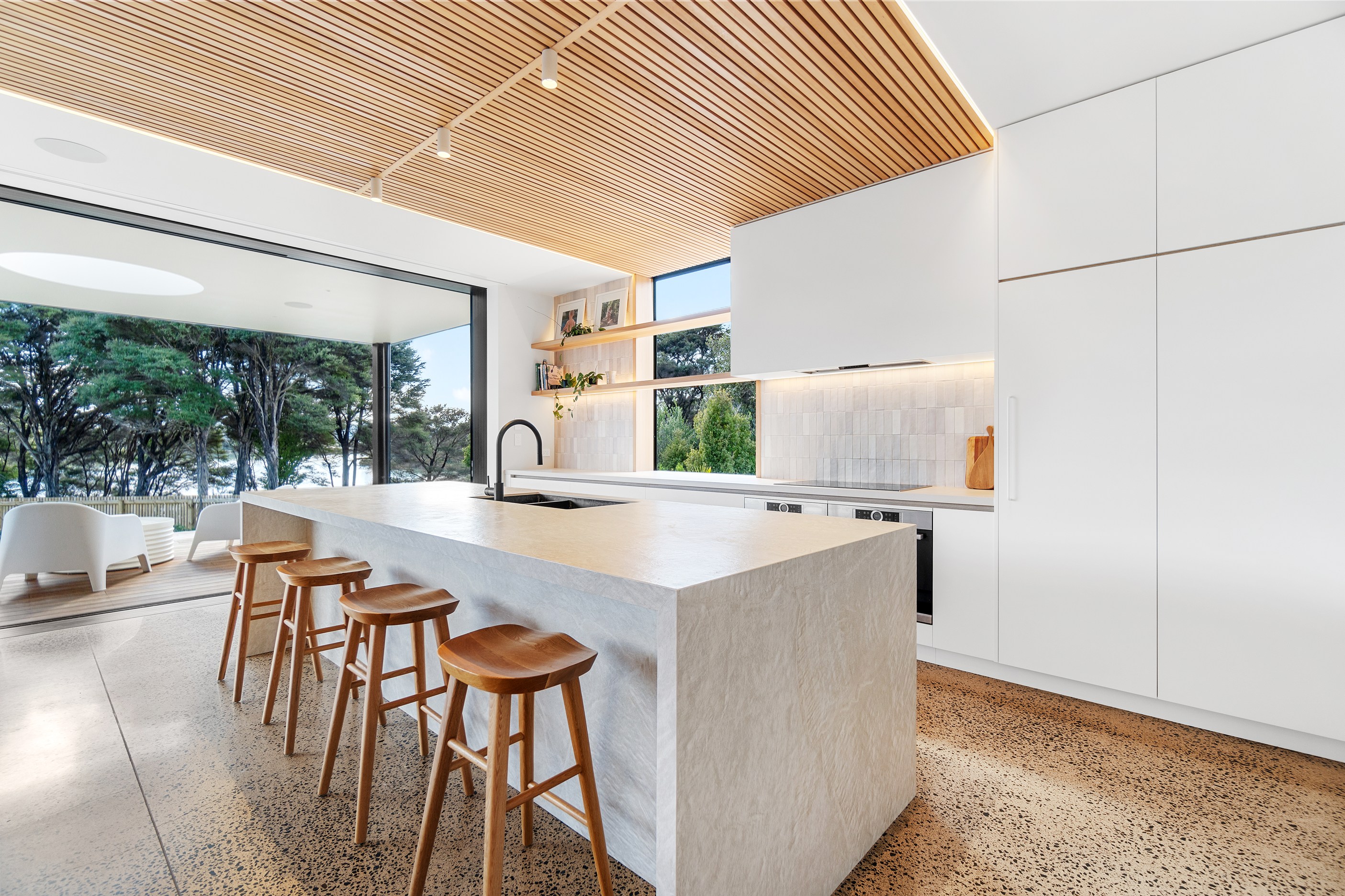 Hardwood decking stretches along the seafacing length of the home, some of it covered, and extends out to an in-ground pool. It also winds around the northern side of the house providing a private outdoor space that flows from the main bedroom suite. On the opposite side, it turns the corner and links the southern end of the main building with the garage and an attached room with bathroom and laundry. Nominally a “man cave”, it also enjoys timber decking. The heart of this lovely home is the vast open-plan communal space with kitchen, dining and living spaces, plus a separate media room. Polished concrete floors and timber detailing translate to a sleek, industrial aesthetic. It’s an interior oasis. Three bedrooms, an office and a tiled family bathroom with a bath can be found on one side, while the main suite with ensuite are on the other. This is prime peninsula living.
