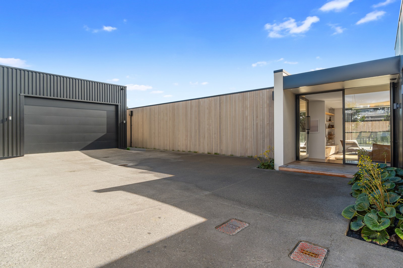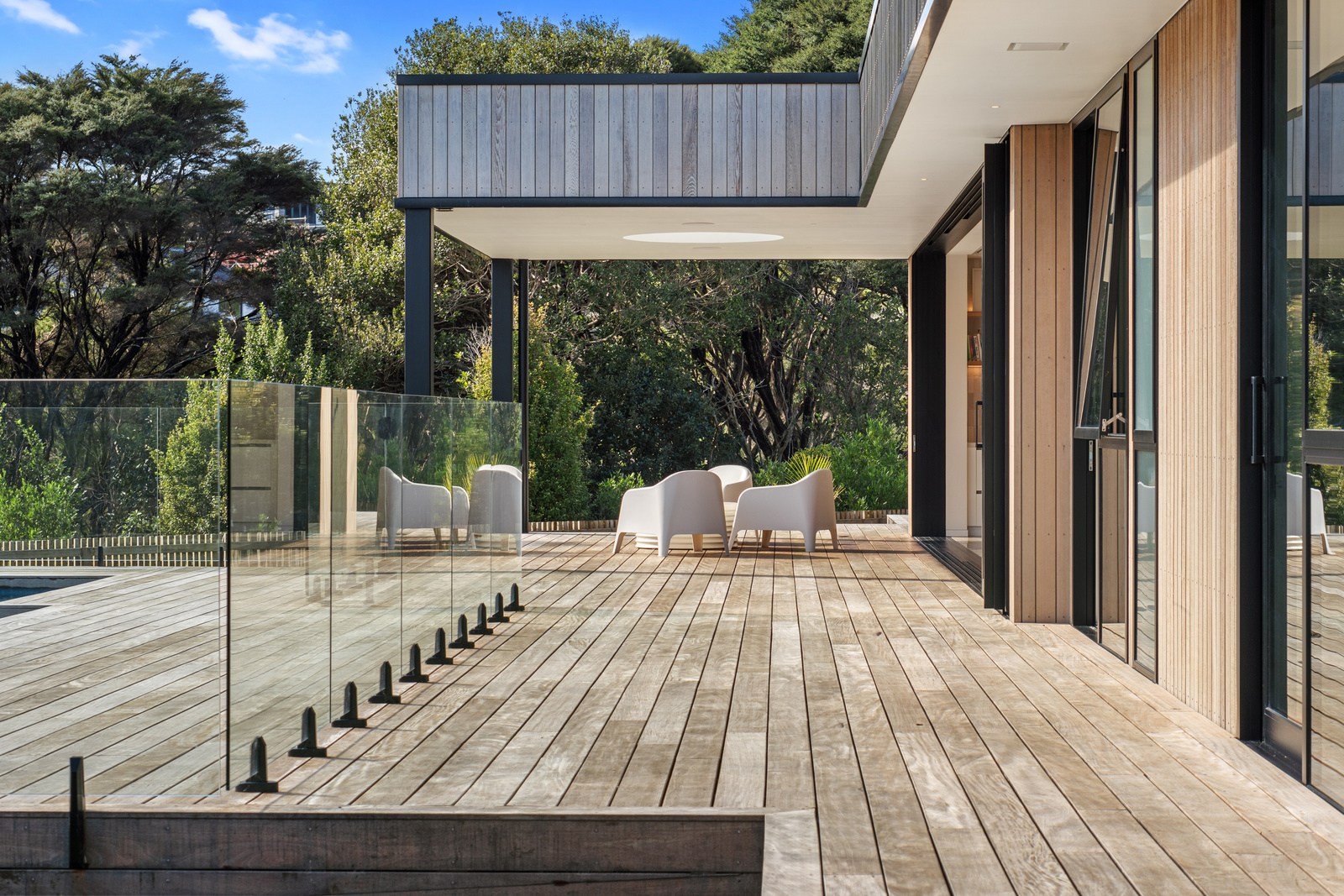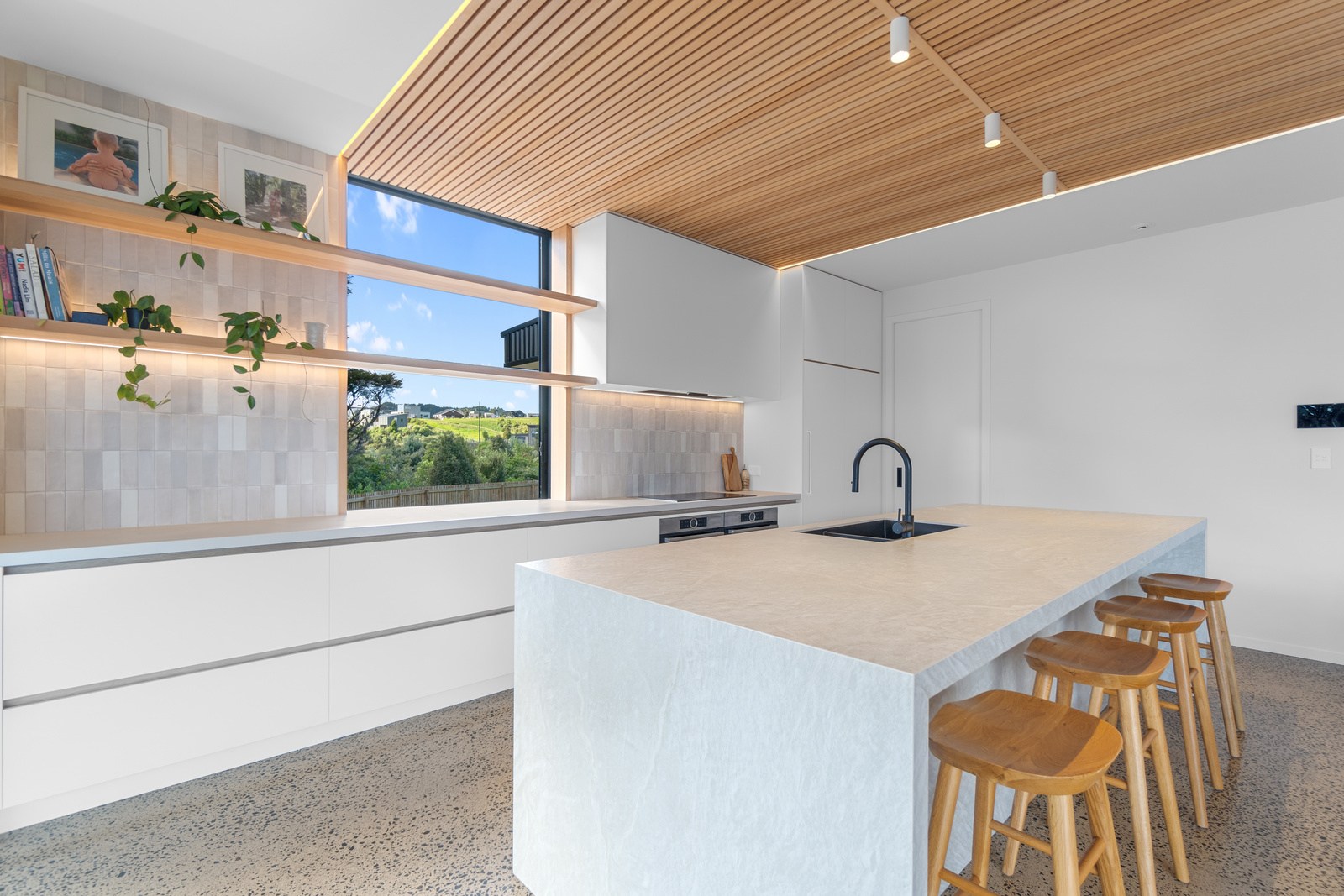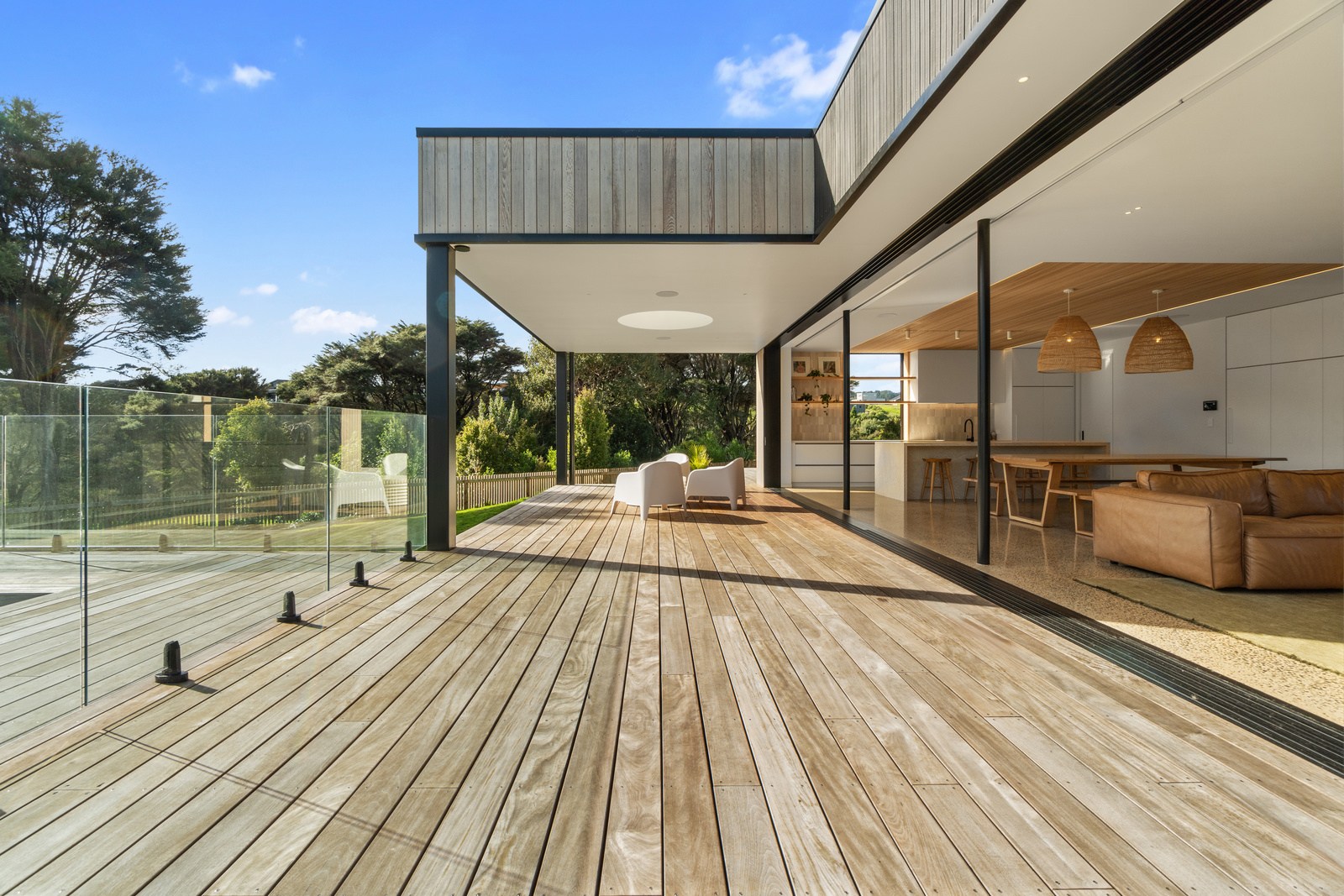 Hardwood decking stretches along the seafacing length of the home, some of it covered, and extends out to an in-ground pool. It also winds around the northern side of the house providing a private outdoor space that flows from the main bedroom suite. On the opposite side, it turns the corner and links the southern end of the main building with the garage and an attached room with bathroom and laundry. Nominally a “man cave”, it also enjoys timber decking. The heart of this lovely home is the vast open-plan communal space with kitchen, dining and living spaces, plus a separate media room. Polished concrete floors and timber detailing translate to a sleek, industrial aesthetic. It’s an interior oasis. Three bedrooms, an office and a tiled family bathroom with a bath can be found on one side, while the main suite with ensuite are on the other. This is prime peninsula living.