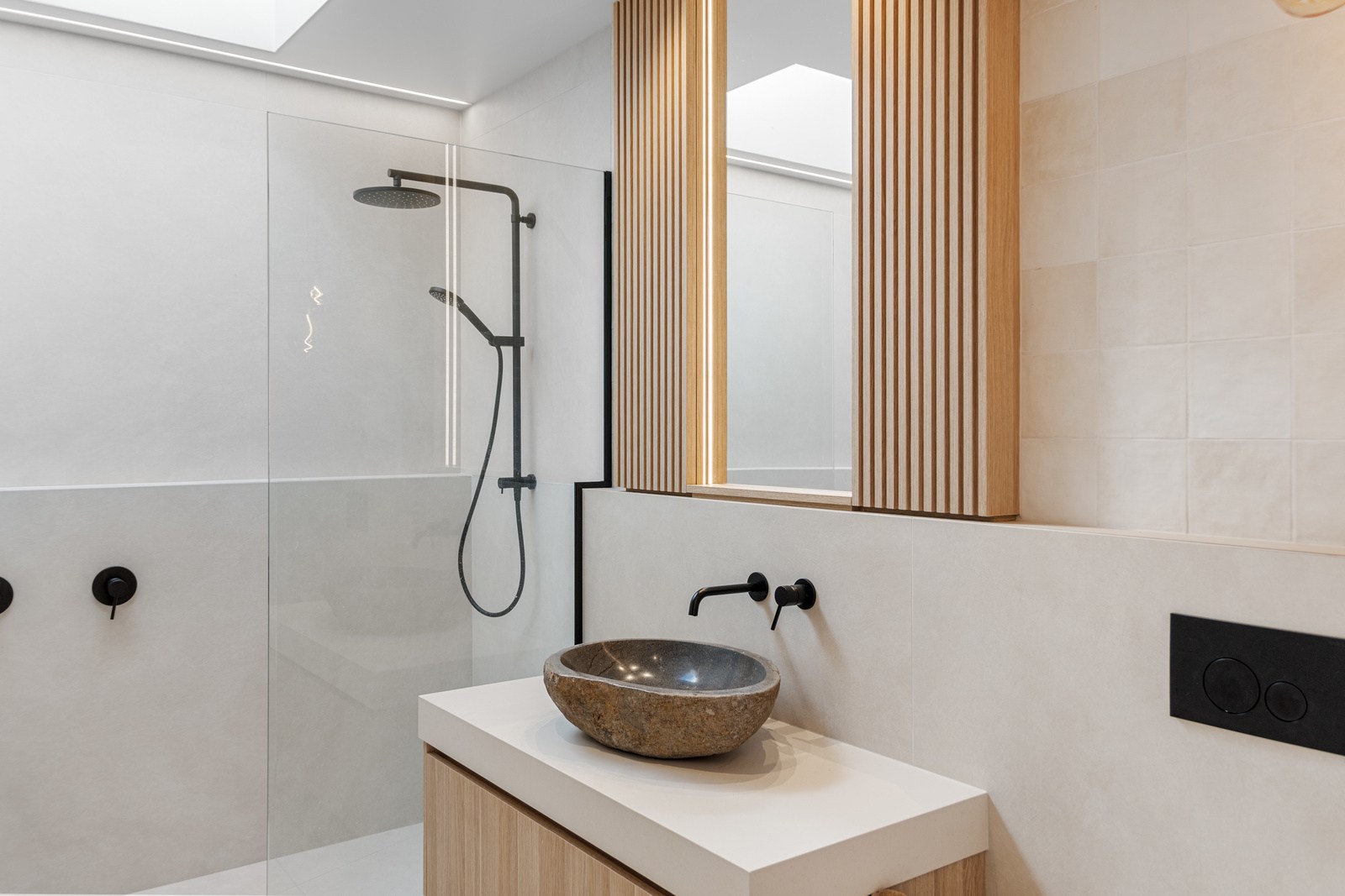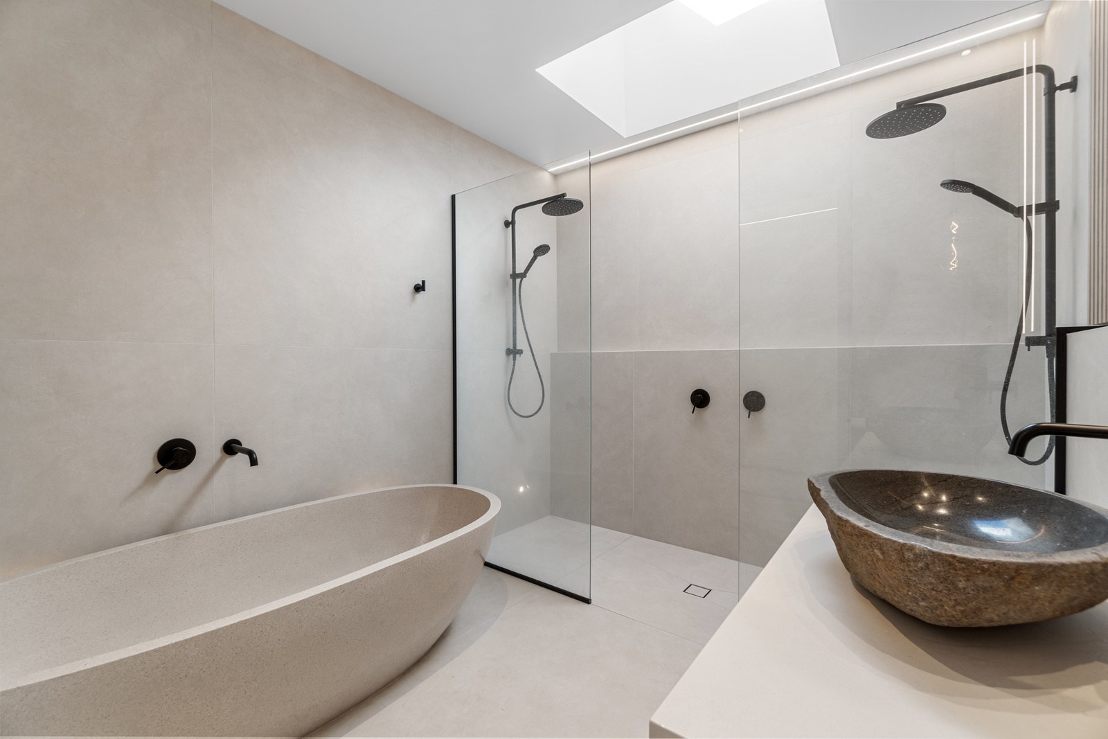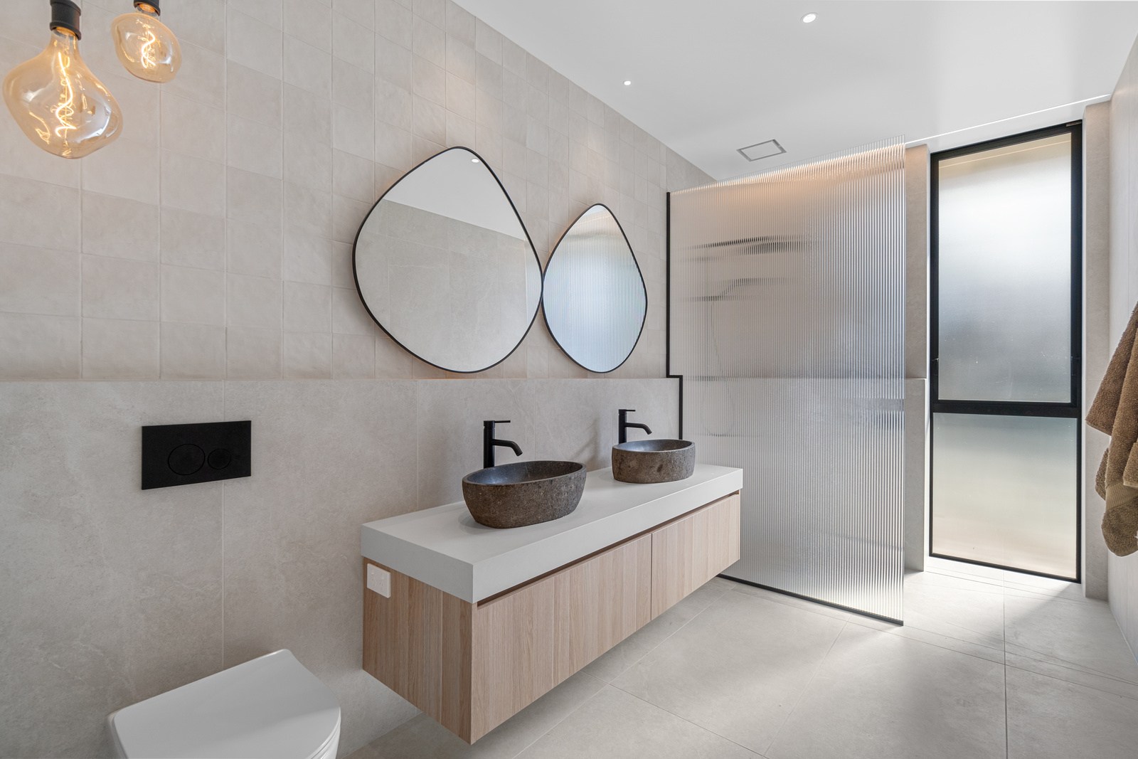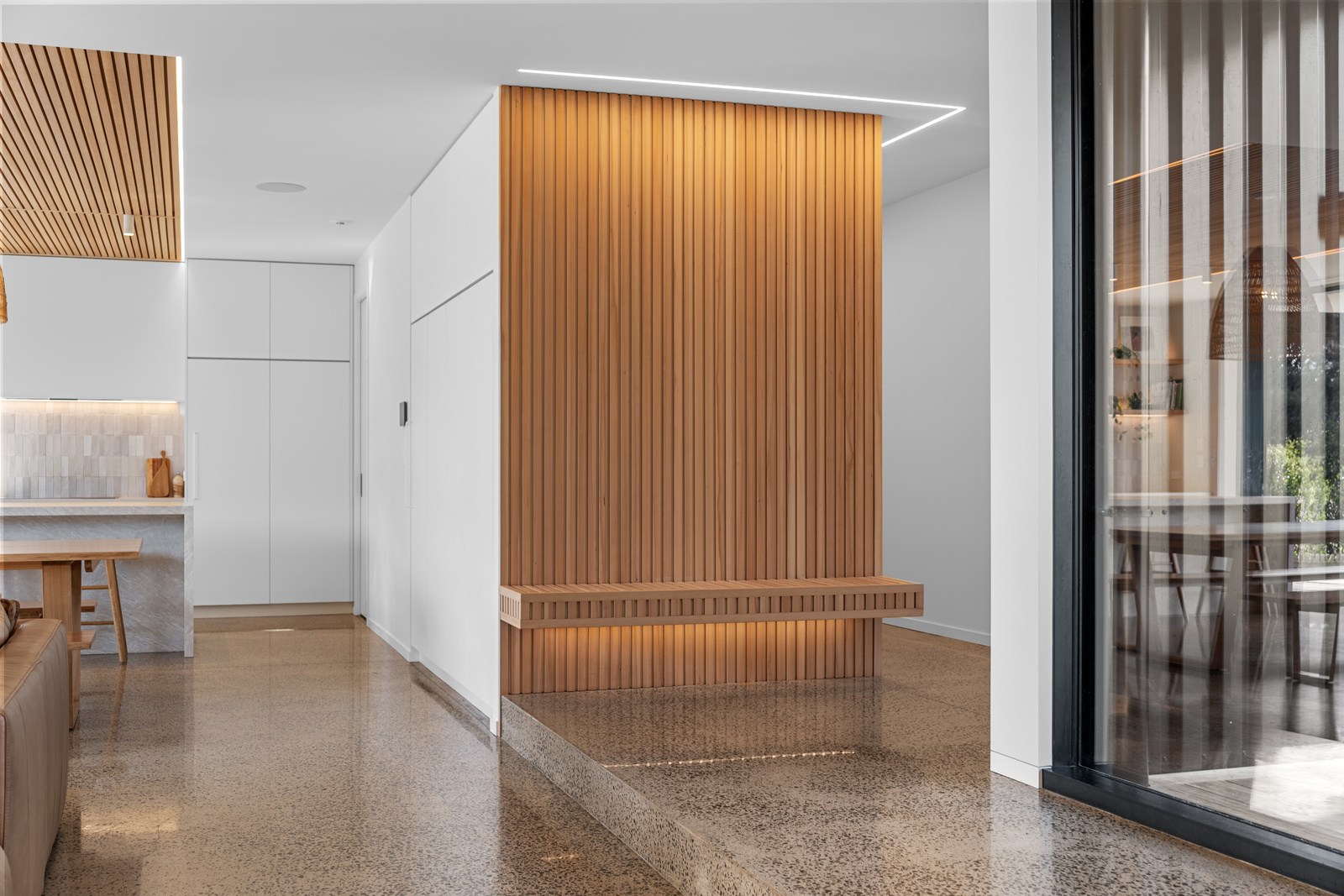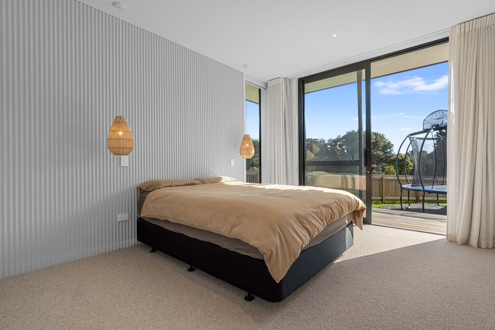 Hardwood decking stretches along the seafacing length of the home, some of it covered, and extends out to an in-ground pool. It also winds around the northern side of the house providing a private outdoor space that flows from the main bedroom suite. On the opposite side, it turns the corner and links the southern end of the main building with the garage and an attached room with bathroom and laundry. Nominally a “man cave”, it also enjoys timber decking. The heart of this lovely home is the vast open-plan communal space with kitchen, dining and living spaces, plus a separate media room. Polished concrete floors and timber detailing translate to a sleek, industrial aesthetic. It’s an interior oasis. Three bedrooms, an office and a tiled family bathroom with a bath can be found on one side, while the main suite with ensuite are on the other. This is prime peninsula living.