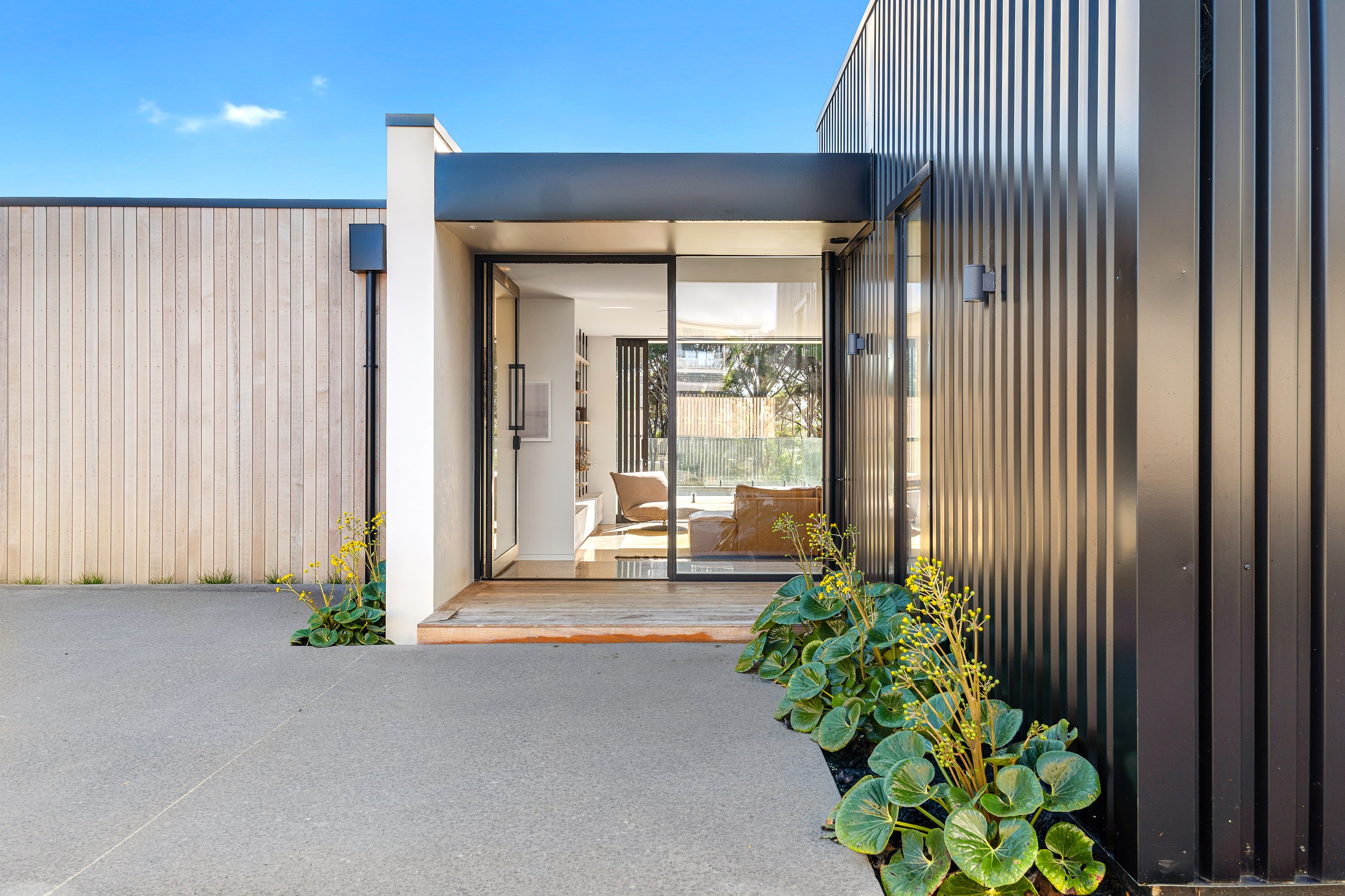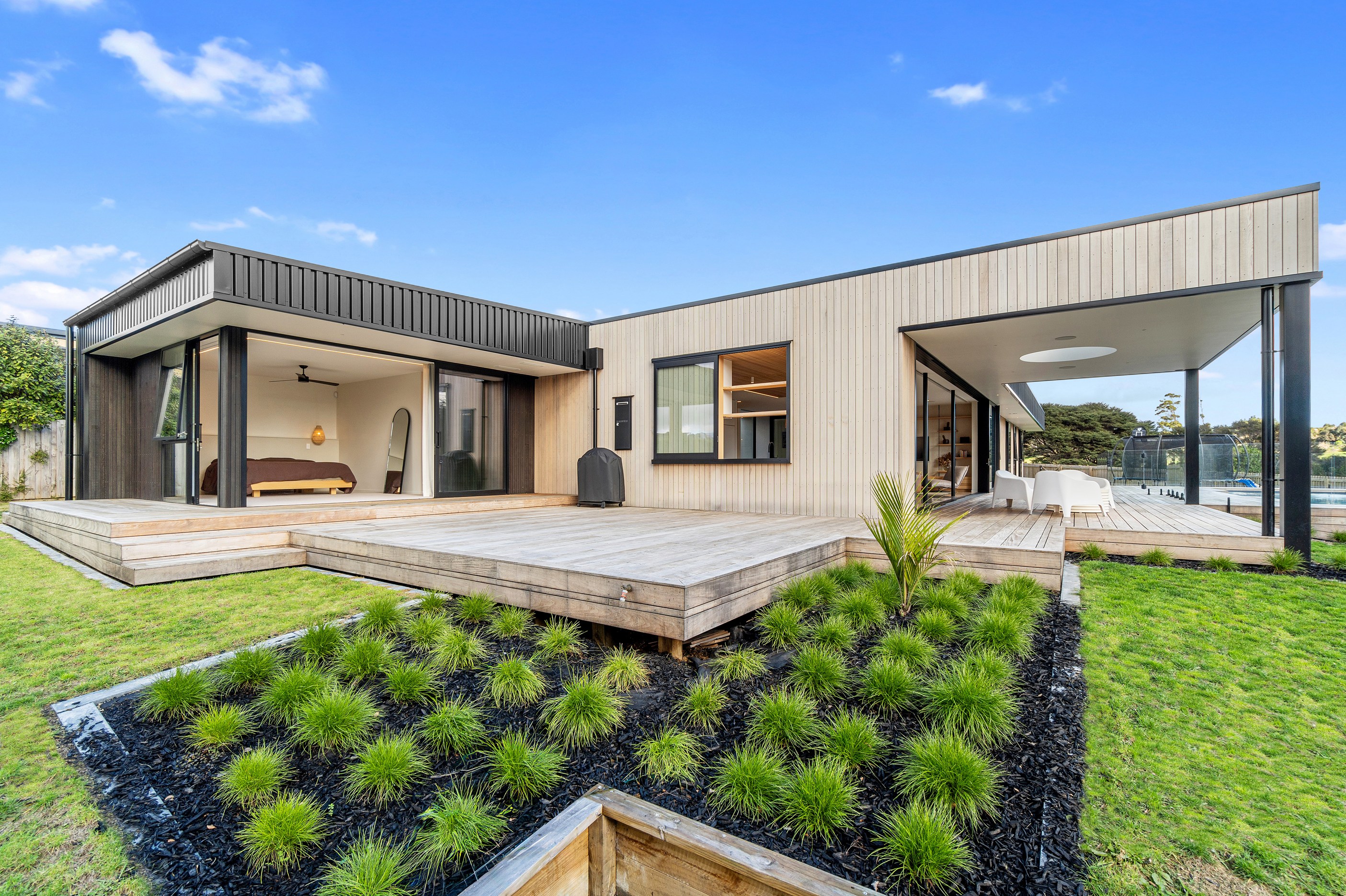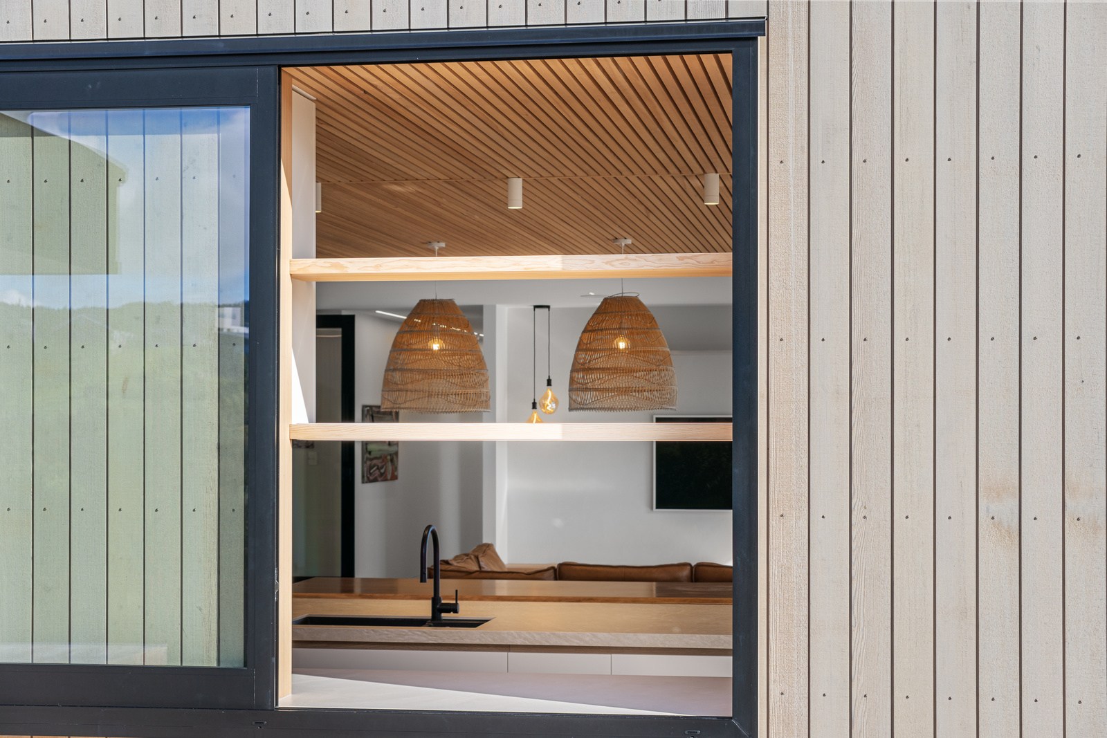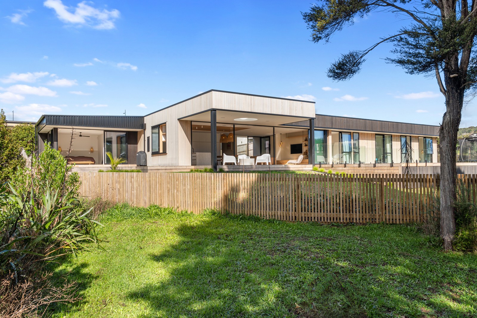 Near the tip of a tiny peninsula in Raglan’s inner harbour is a house that’s as special as its site. It takes in wide views of the water through a veil of coastal trees, sits next to a reserve, has four generous bedrooms and offers plenty of space for family time and relaxation. The 335sqm architectdesigned home lies long, low and unobtrusively on its section. Vertical cedar weatherboards and dark metal cladding ensure it merges into the landscape, rather than competing with it.
