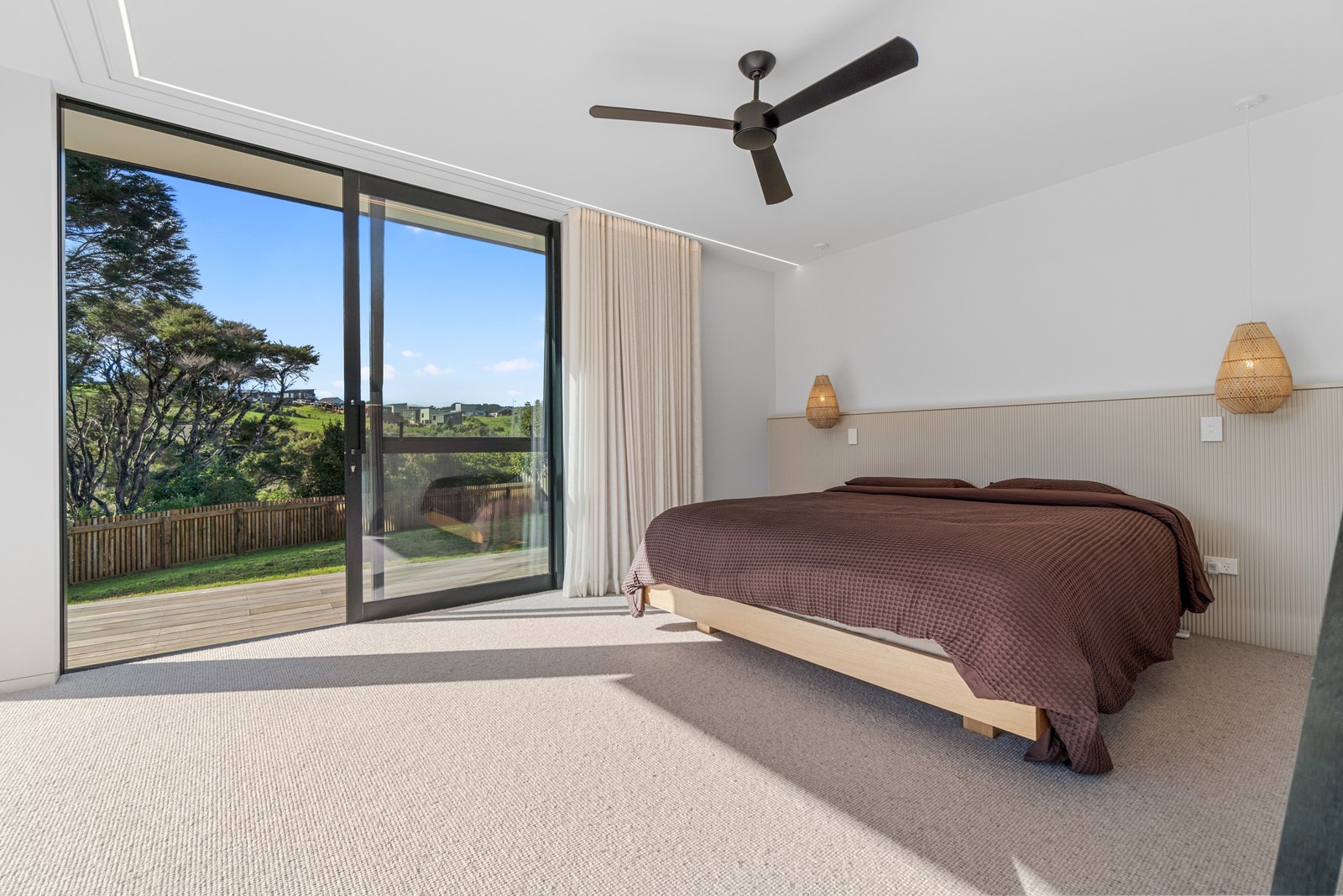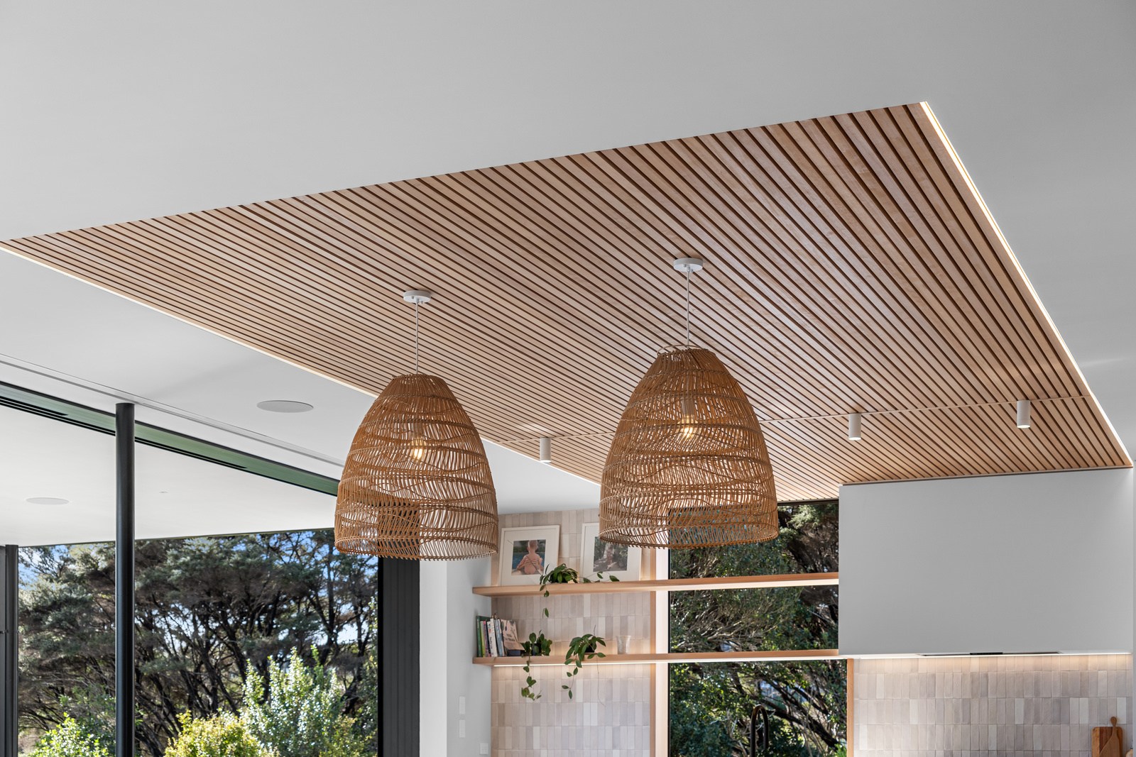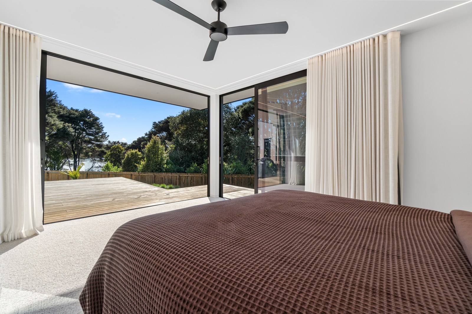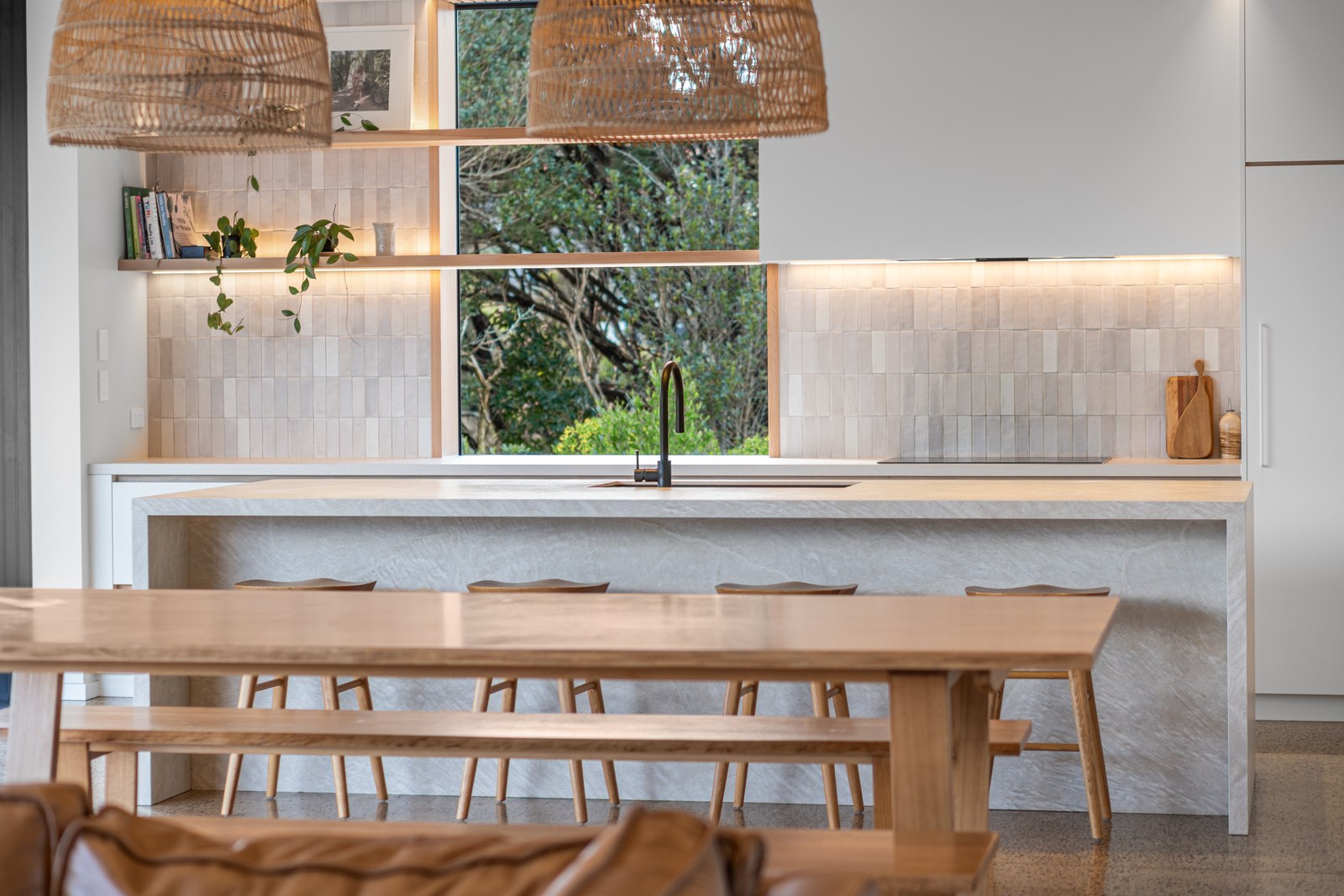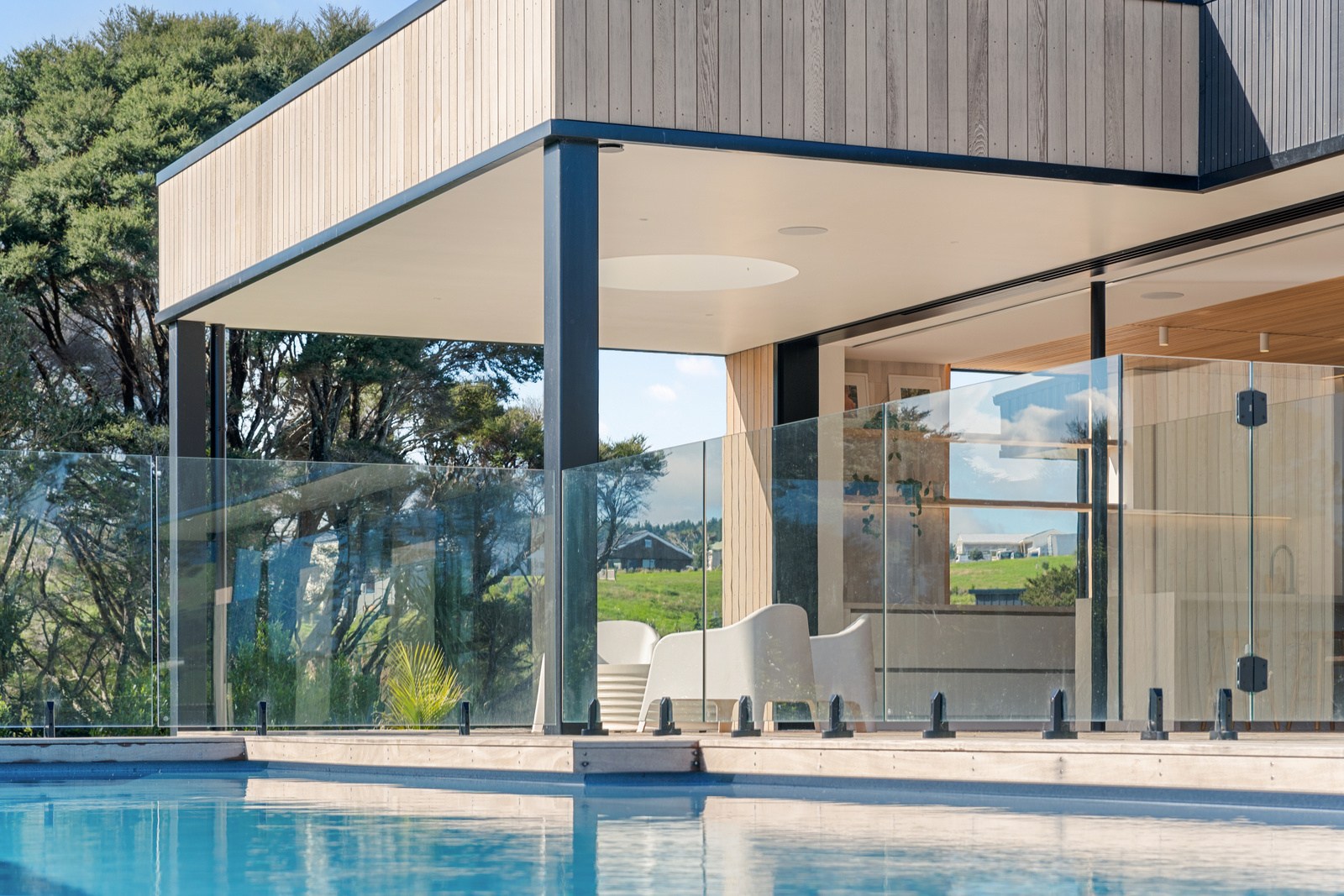Near the tip of a tiny peninsula in Raglan’s inner harbour is a house that’s as special as its site. It takes in wide views of the water through a veil of coastal trees, sits next to a reserve, has four generous bedrooms and offers plenty of space for family time and relaxation. The 335sqm architectdesigned home lies long, low and unobtrusively on its section. Vertical cedar weatherboards and dark metal cladding ensure it merges into the landscape, rather than competing with it.
