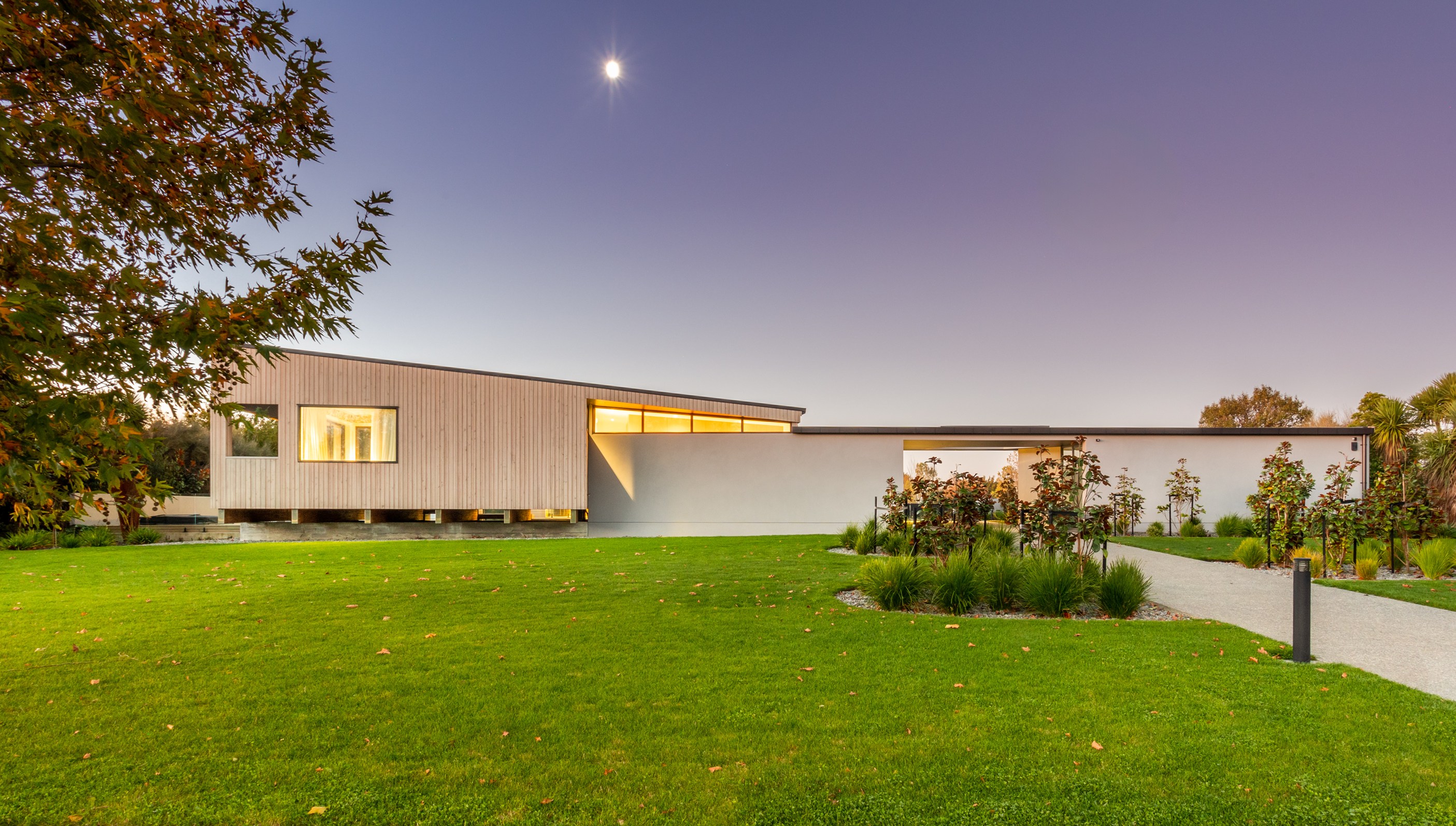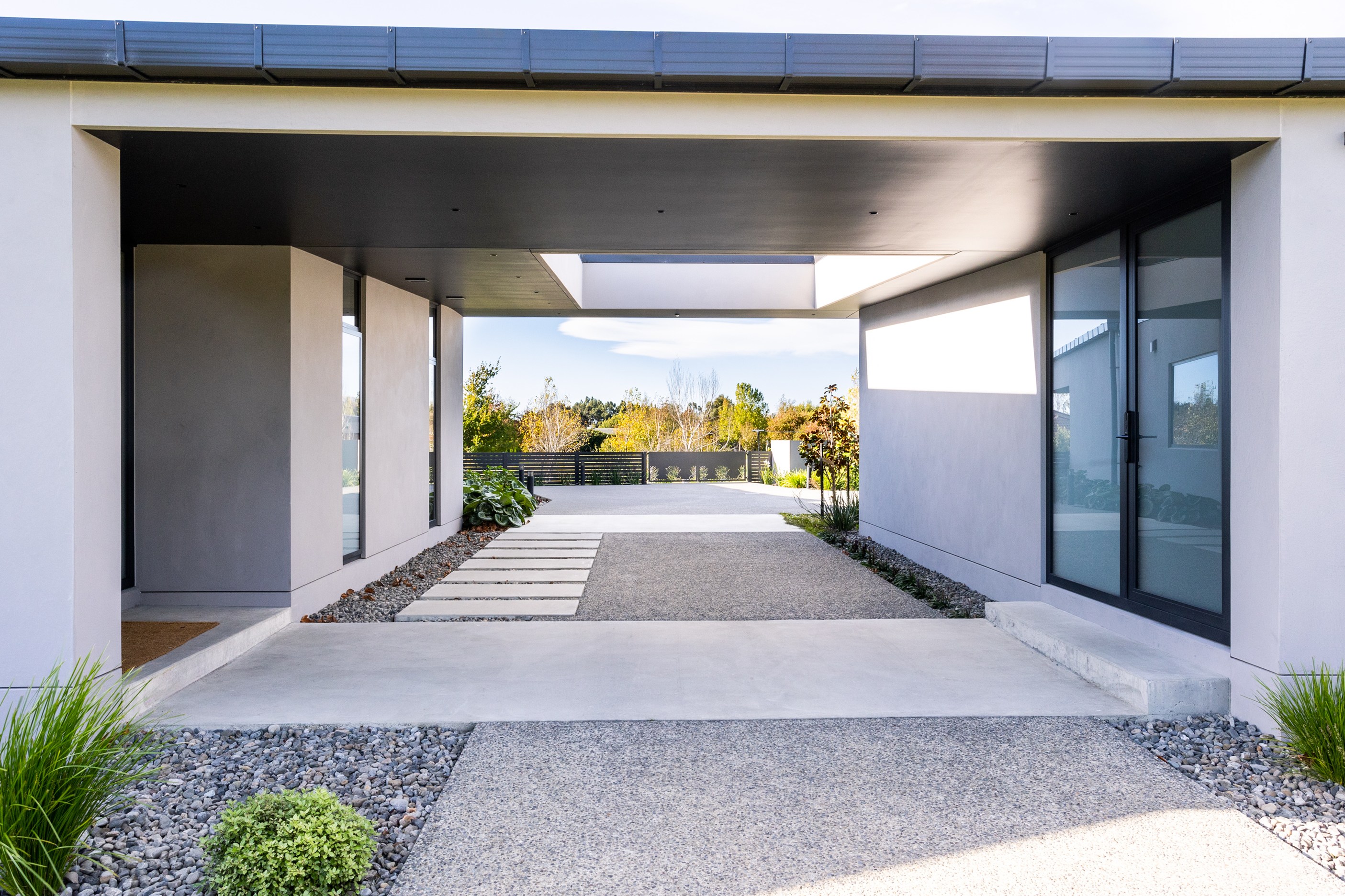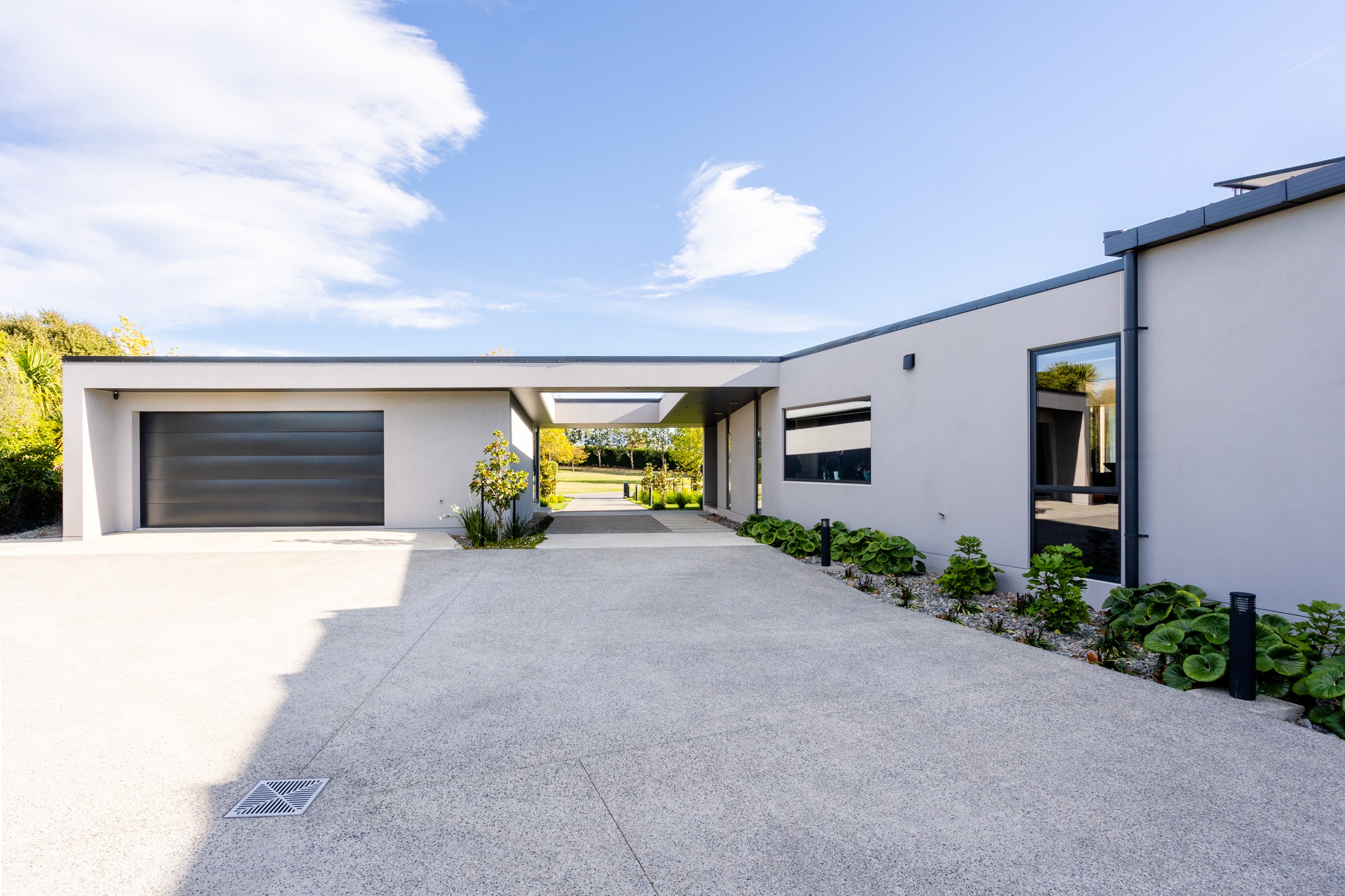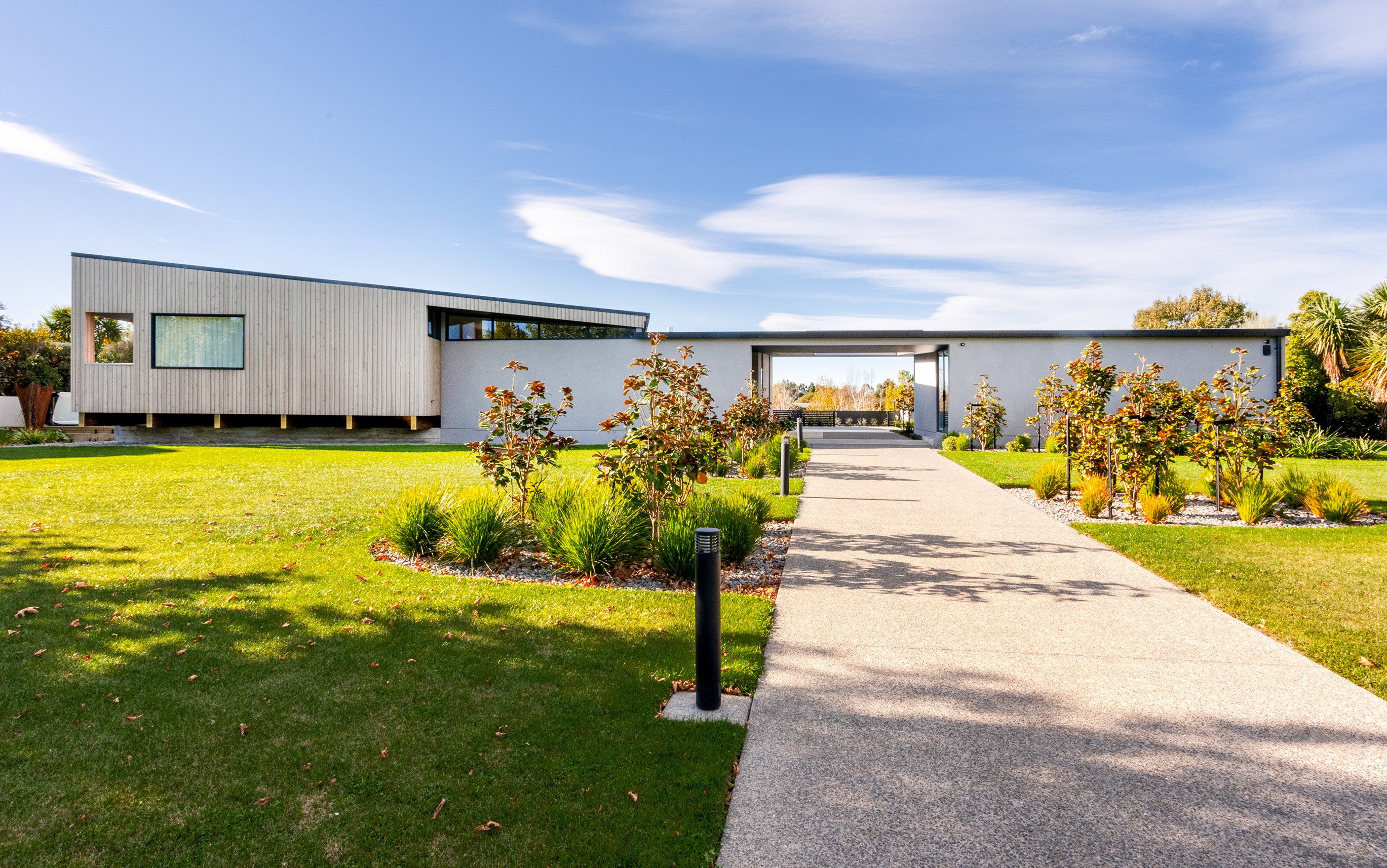 High style comes to a park-like Wairarapa estate in the form of this low-profile home. It’s one of those places that doesn’t shout its attributes from the rooftops, but nevertheless wows with its creativity and class. On approach, it presents as a simple ‘grey box’ with a drive-through opening that leads to the entrance on one side and a double garage on the other. Extending from and over the box is the main-bedroom wing on an elevated timber foundation and clad in vertical shiplap.