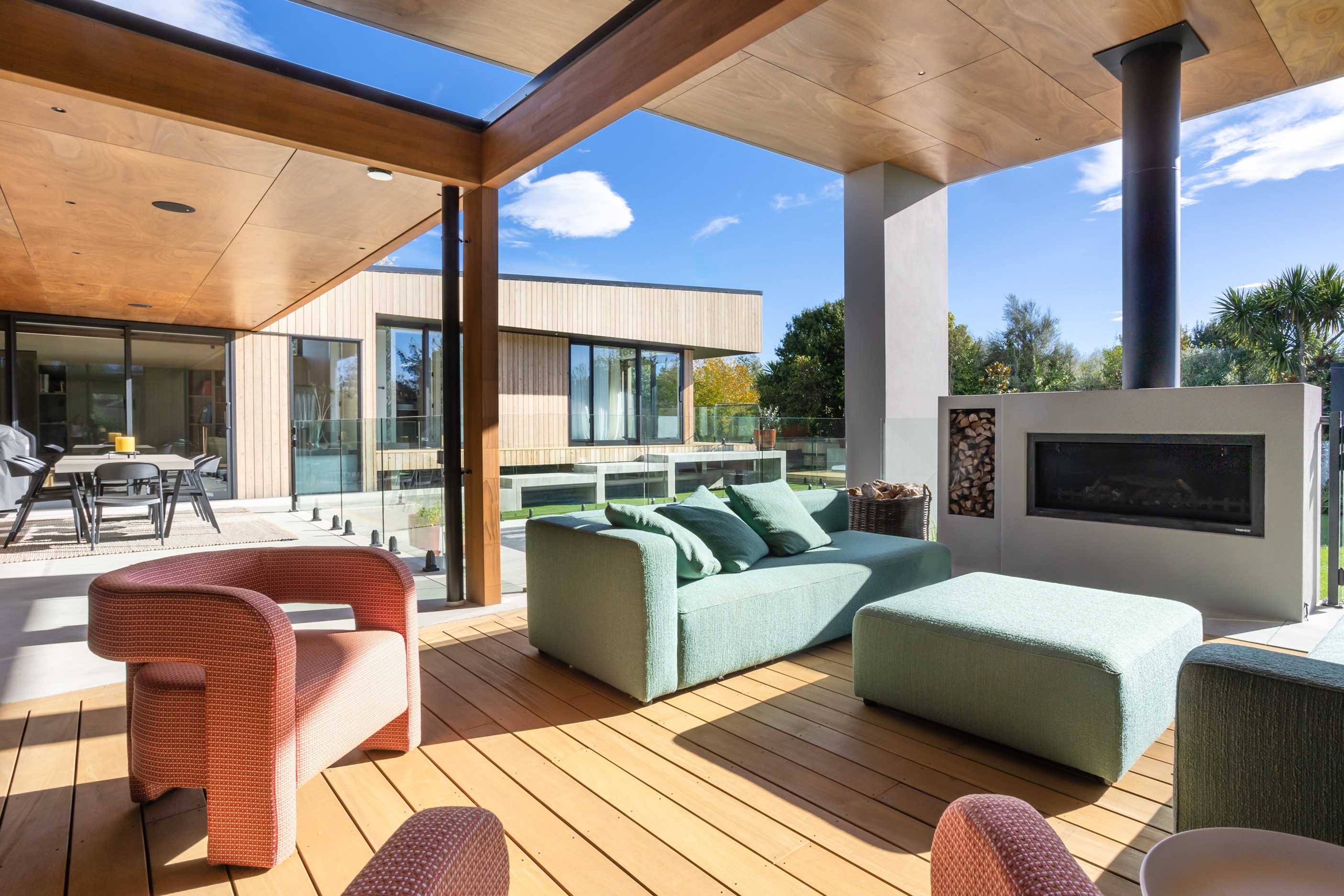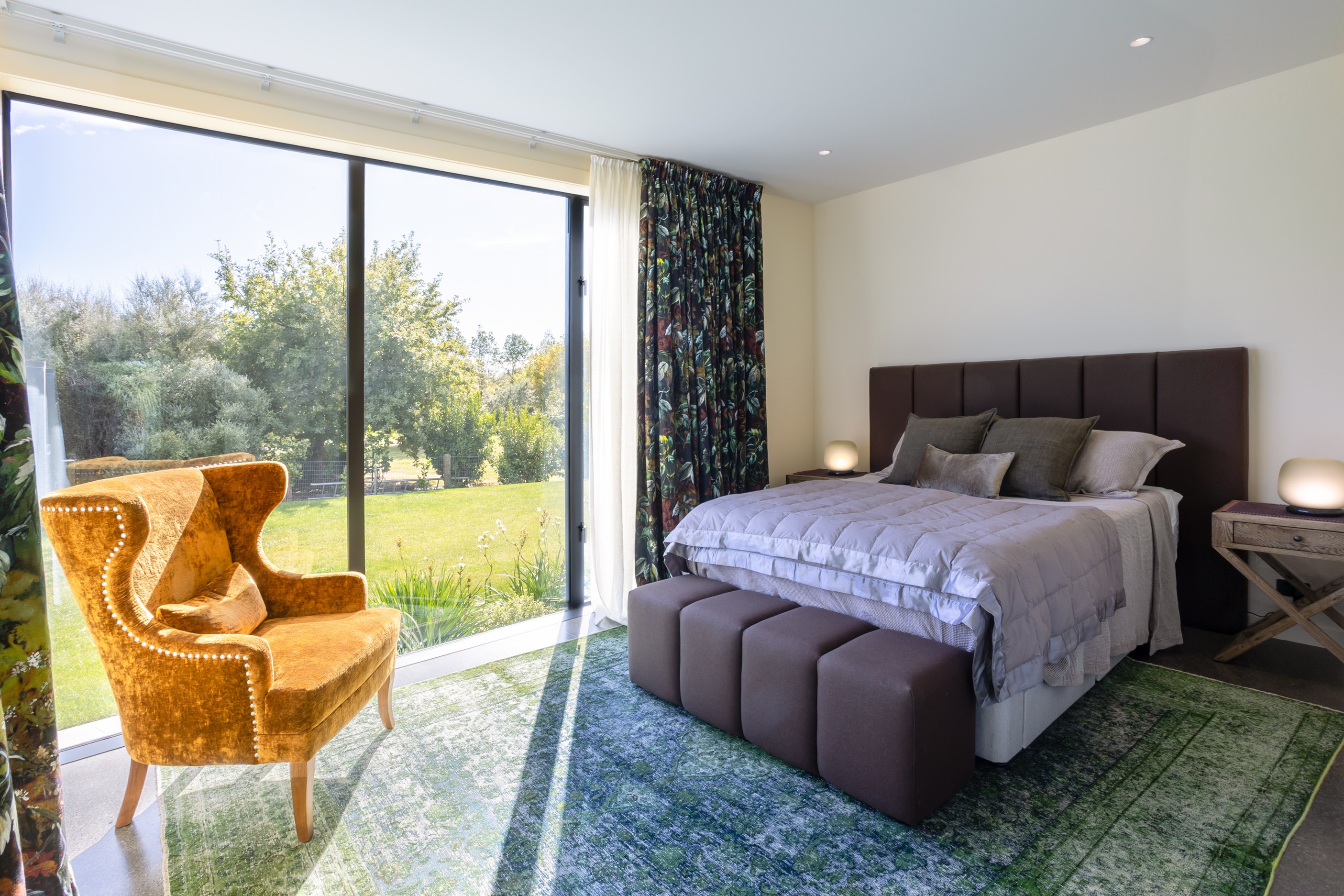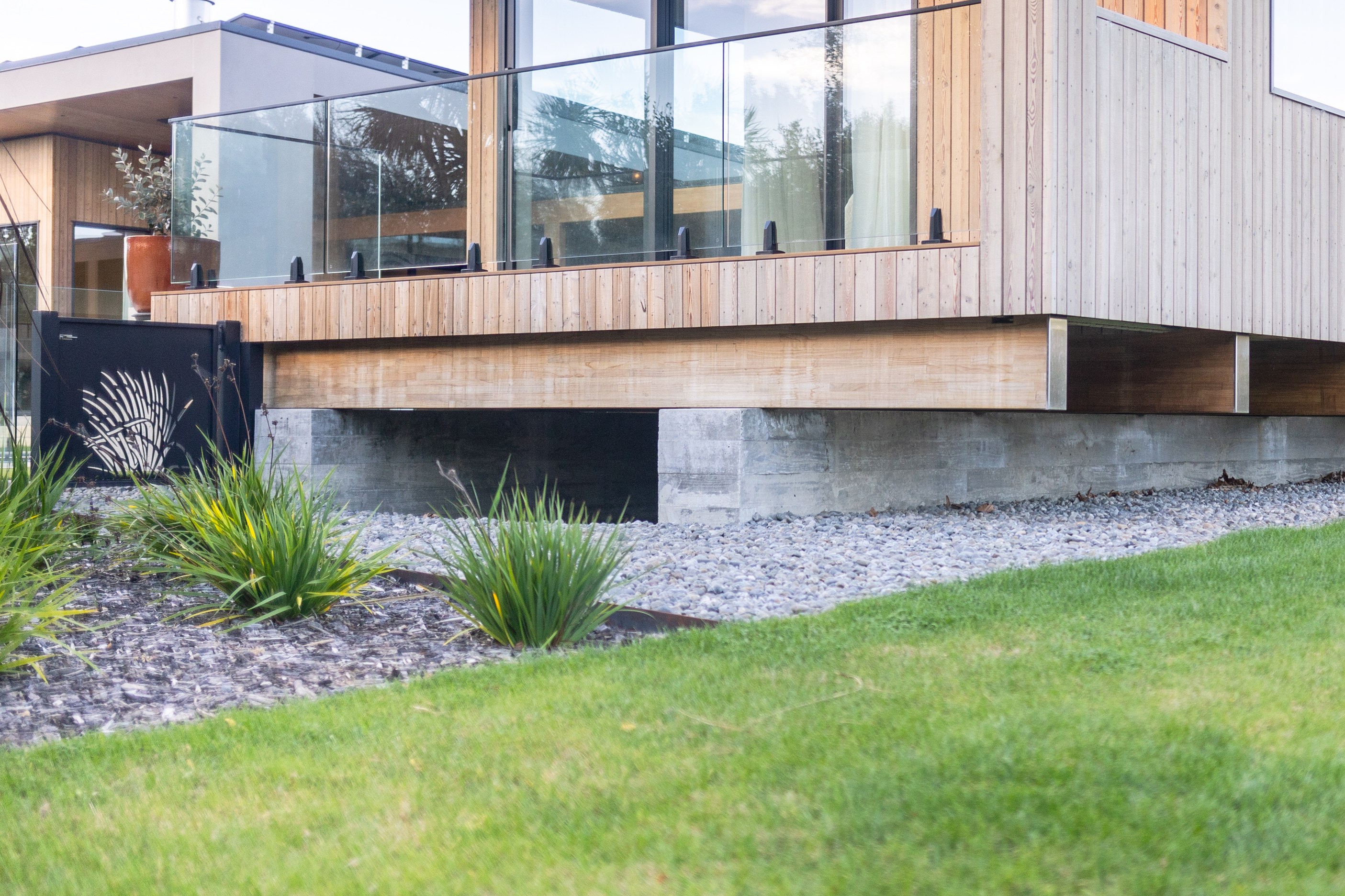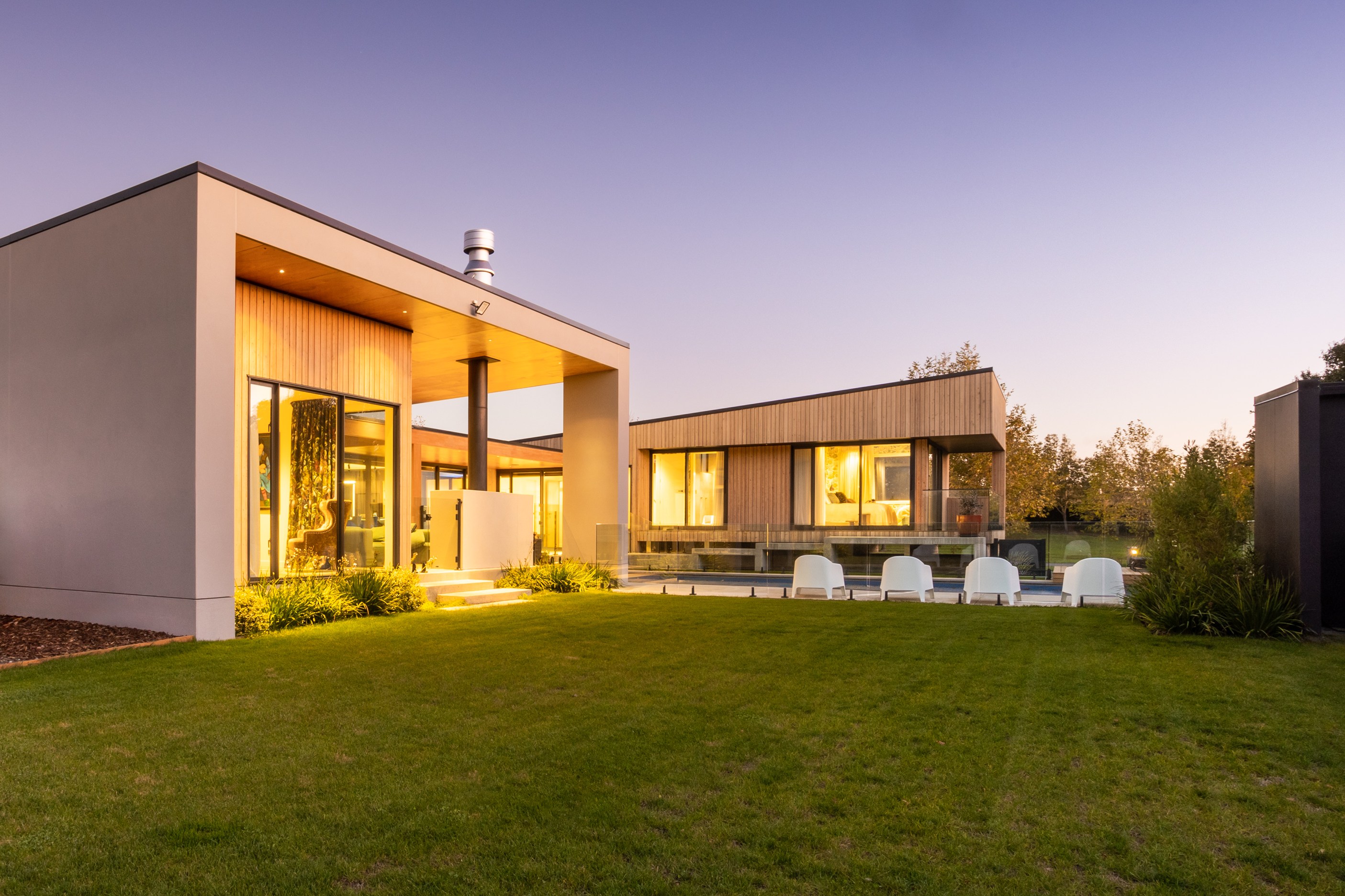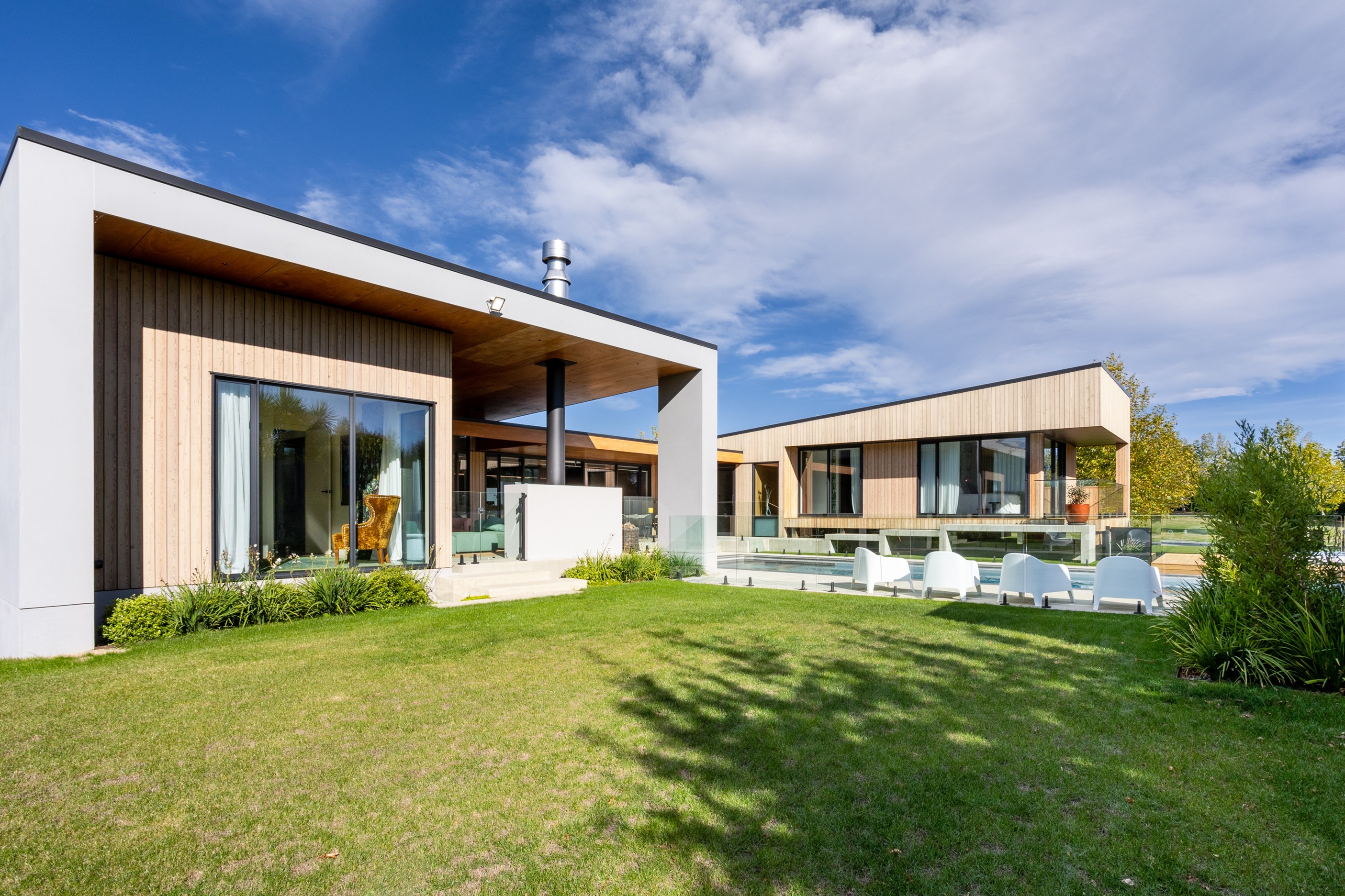 High style comes to a park-like Wairarapa estate in the form of this low-profile home. It’s one of those places that doesn’t shout its attributes from the rooftops, but nevertheless wows with its creativity and class. On approach, it presents as a simple ‘grey box’ with a drive-through opening that leads to the entrance on one side and a double garage on the other. Extending from and over the box is the main-bedroom wing on an elevated timber foundation and clad in vertical shiplap.