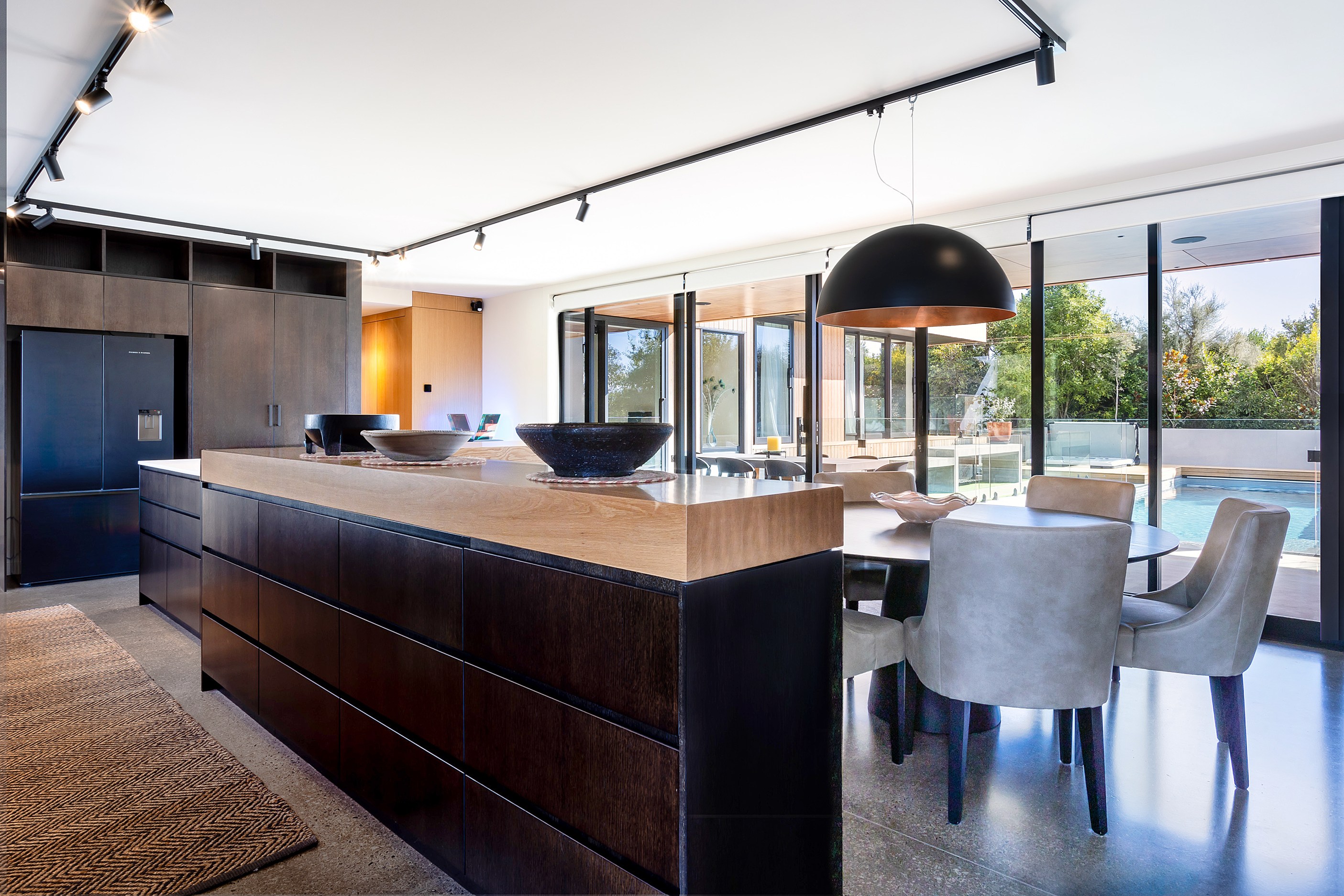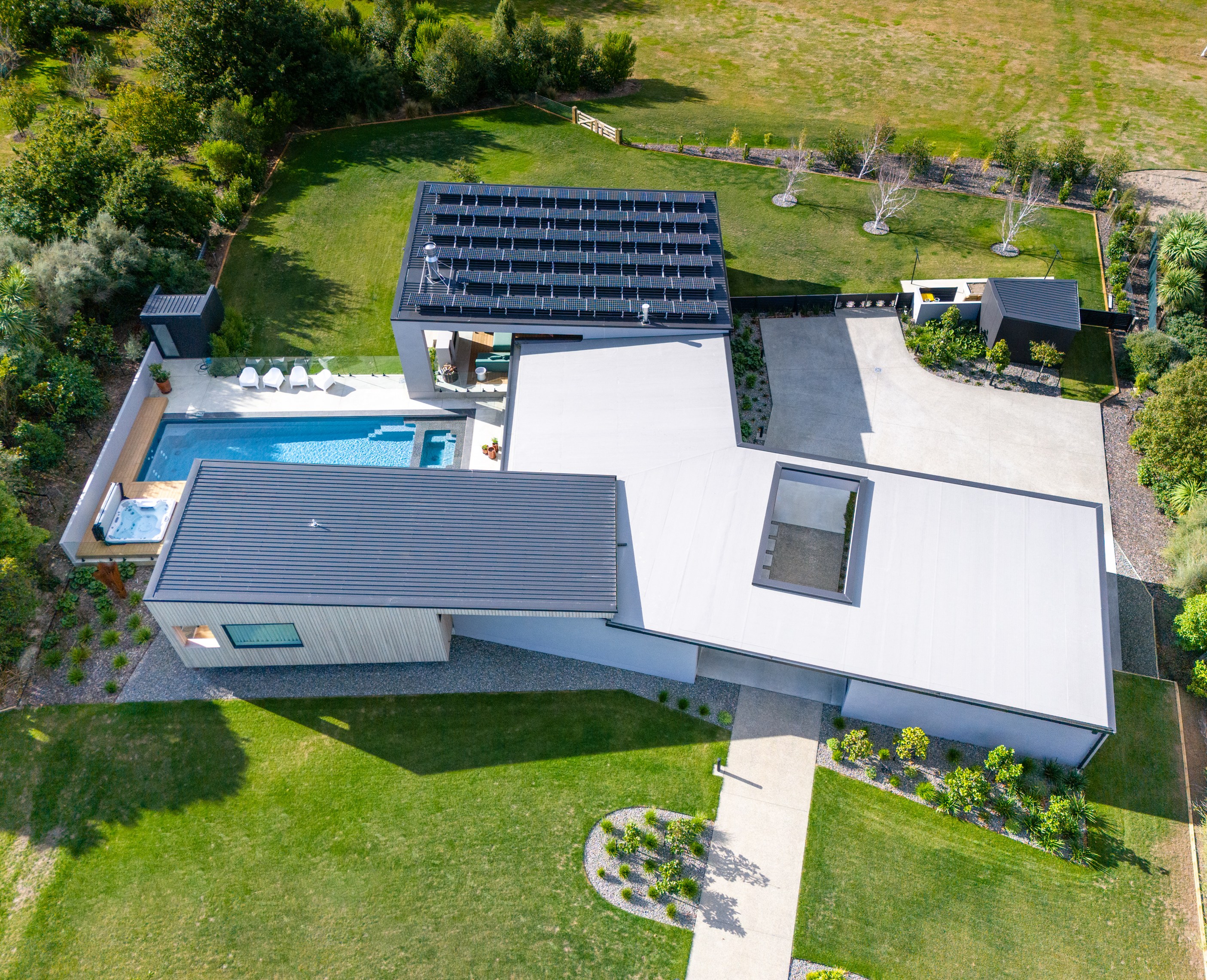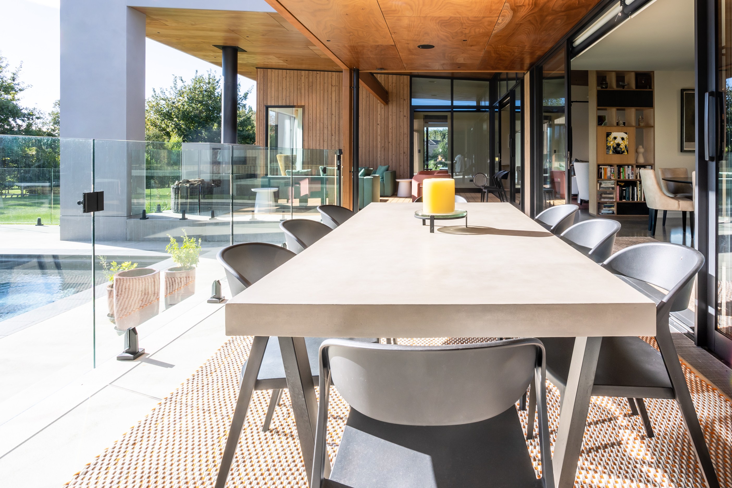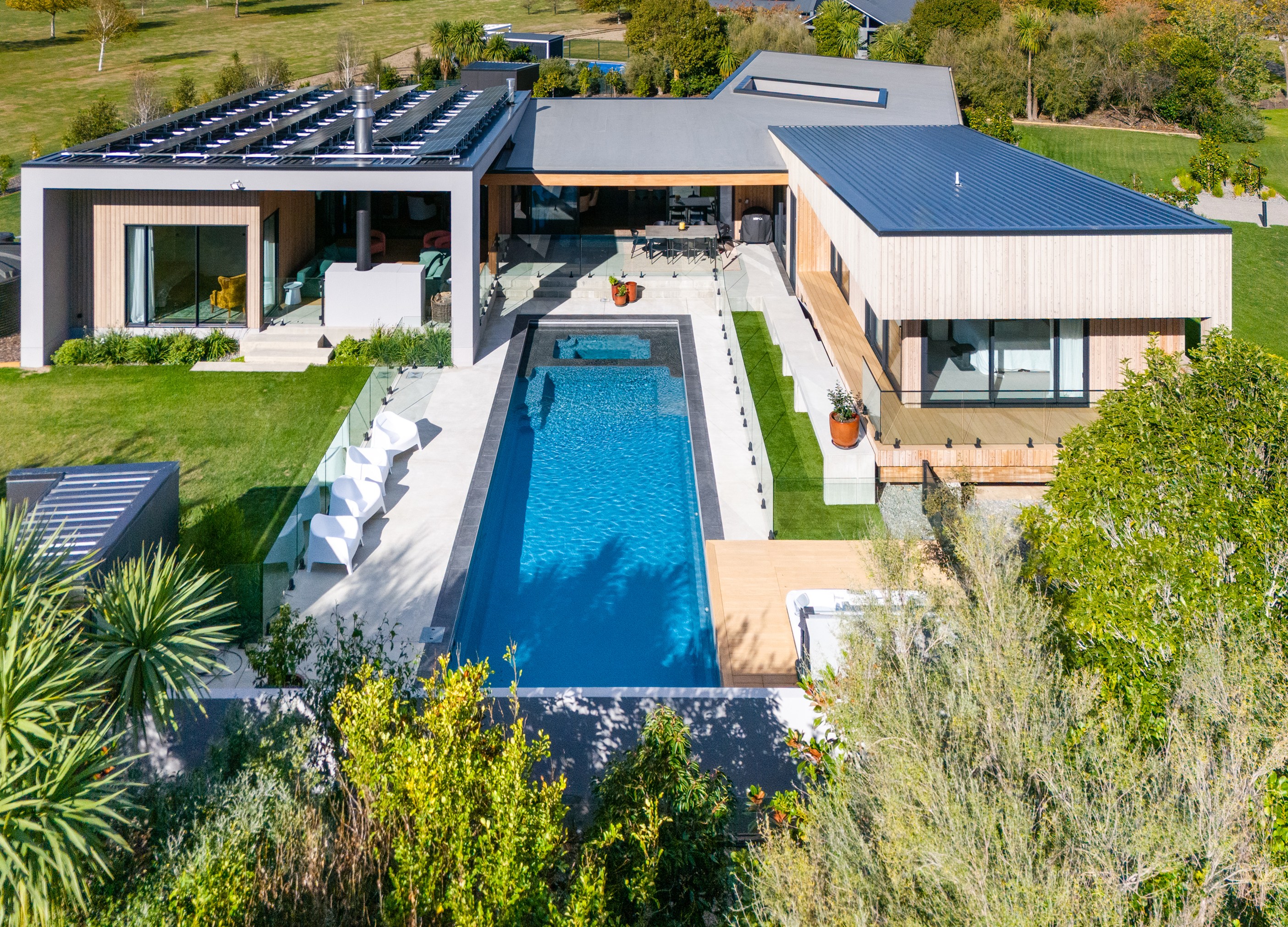 Step inside via a warm and tactile American white oak wall-panelled entryway. To the left, a passage leads to the elevated main bedroom suite and a serene, light-filled office. To the right, you’ll find the heart of the home — a space grounded in natural tones and polished concrete floors, anchored by an oversized, stone-topped kitchen island. This zone flows effortlessly into the dining and living areas, subtly divided by custom joinery that features a striking two-way gas fireplace. These open to covered patios, decking, an outdoor fire and the undisputed stars: a 15m lap pool and spa pool. It’s a heavenly space with lawn, landscaping and connections to every part of the U-shaped home. On the far side is the guest wing with two bedrooms and a bathroom, plus laundry. This 306sqm semi-rural home serves up tranquil living, privacy, flexibility and low-key luxe in perfect measure, as well as building artistry.