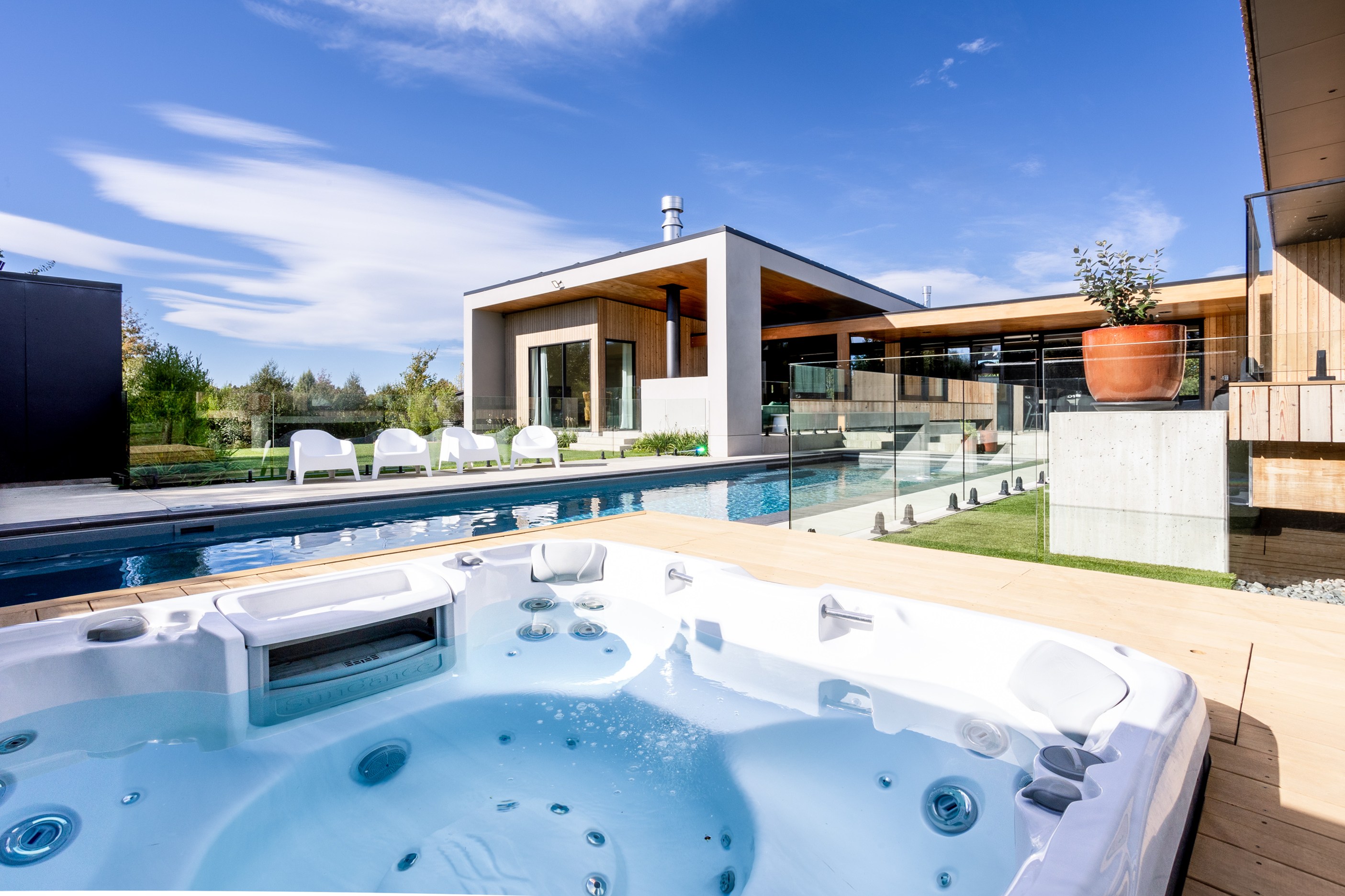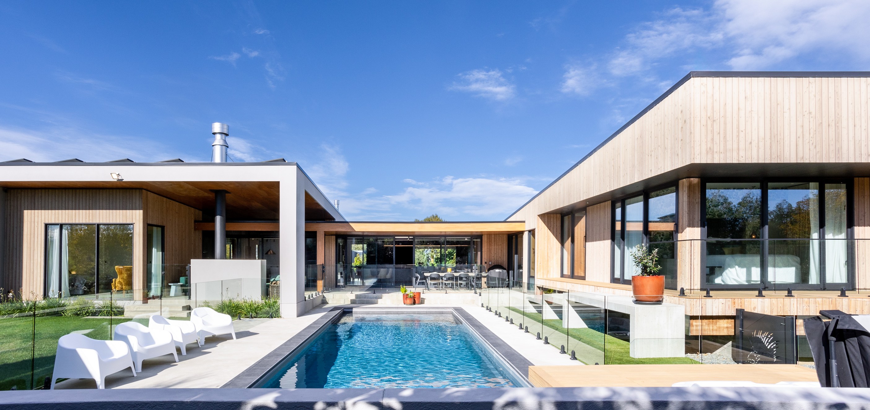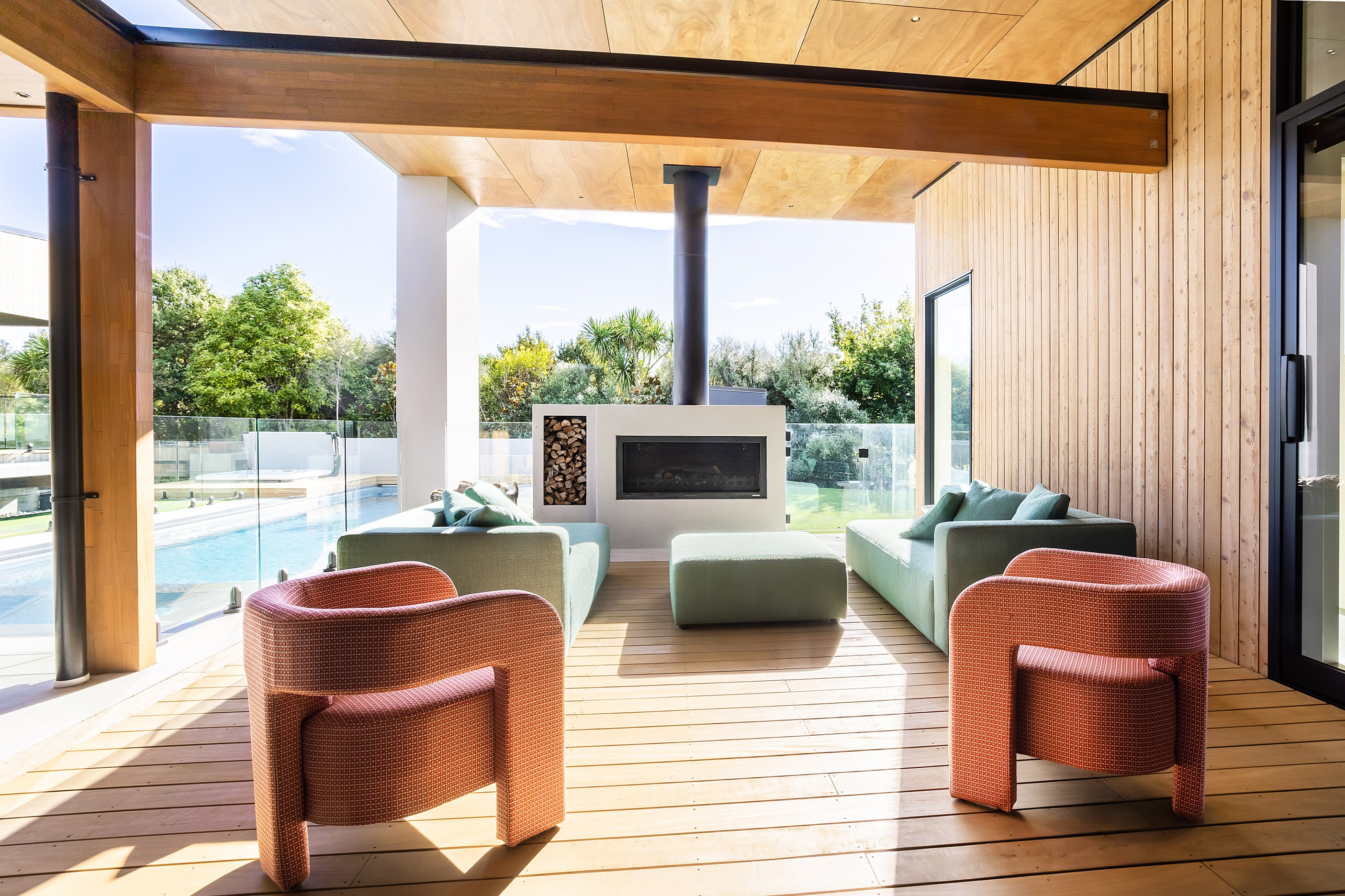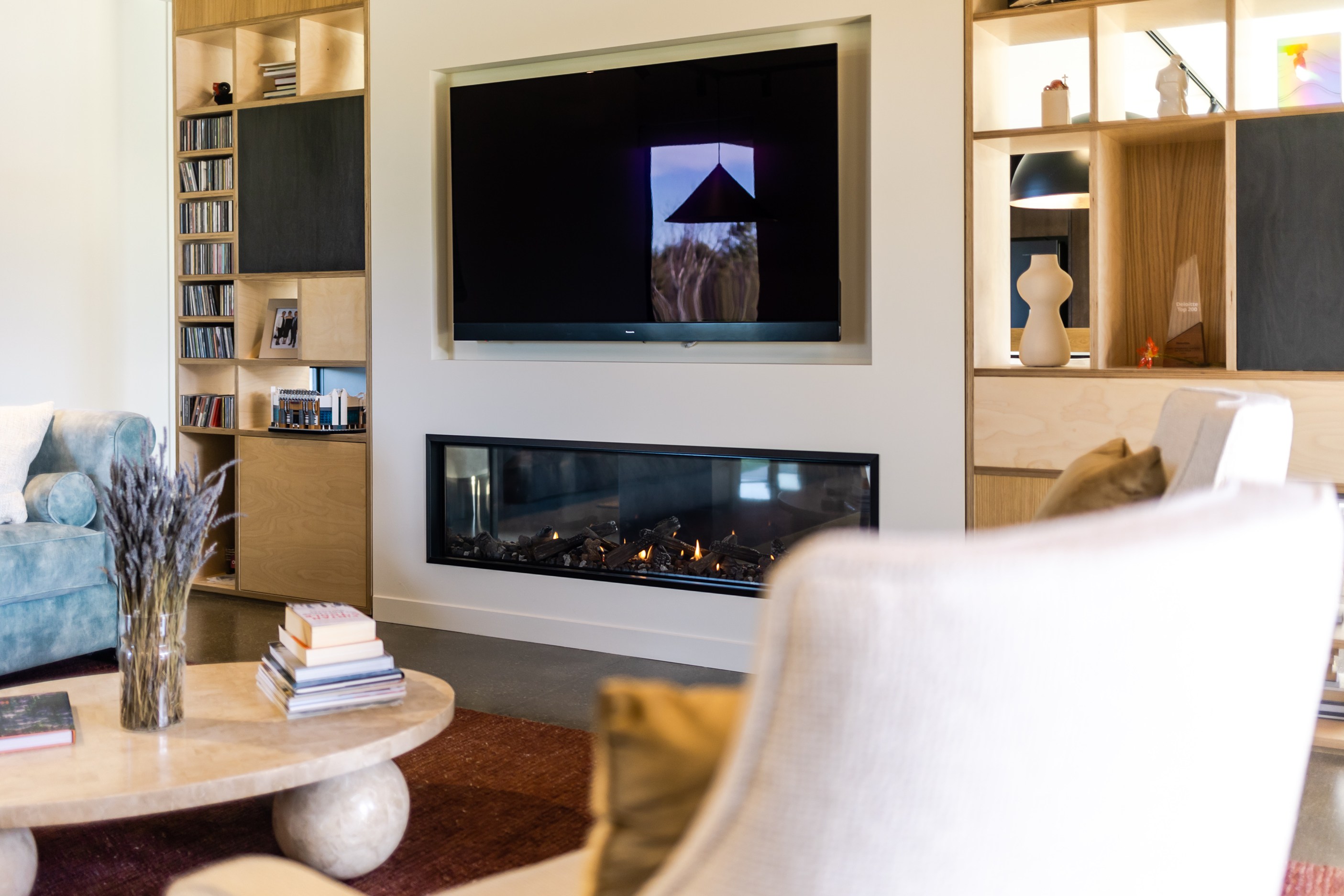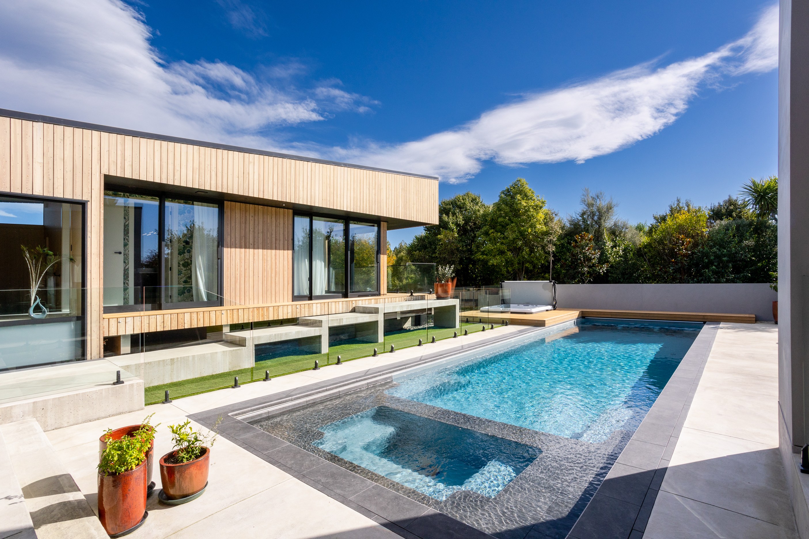 Step inside via a warm and tactile American white oak wall-panelled entryway. To the left, a passage leads to the elevated main bedroom suite and a serene, light-filled office. To the right, you’ll find the heart of the home — a space grounded in natural tones and polished concrete floors, anchored by an oversized, stone-topped kitchen island. This zone flows effortlessly into the dining and living areas, subtly divided by custom joinery that features a striking two-way gas fireplace. These open to covered patios, decking, an outdoor fire and the undisputed stars: a 15m lap pool and spa pool. It’s a heavenly space with lawn, landscaping and connections to every part of the U-shaped home. On the far side is the guest wing with two bedrooms and a bathroom, plus laundry. This 306sqm semi-rural home serves up tranquil living, privacy, flexibility and low-key luxe in perfect measure, as well as building artistry.