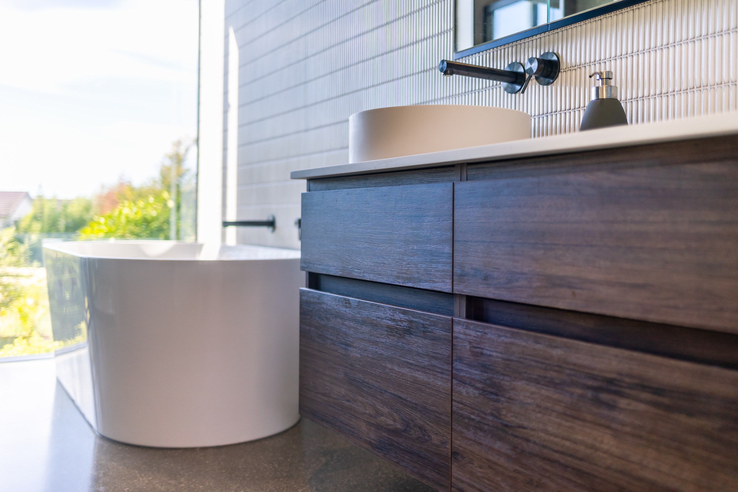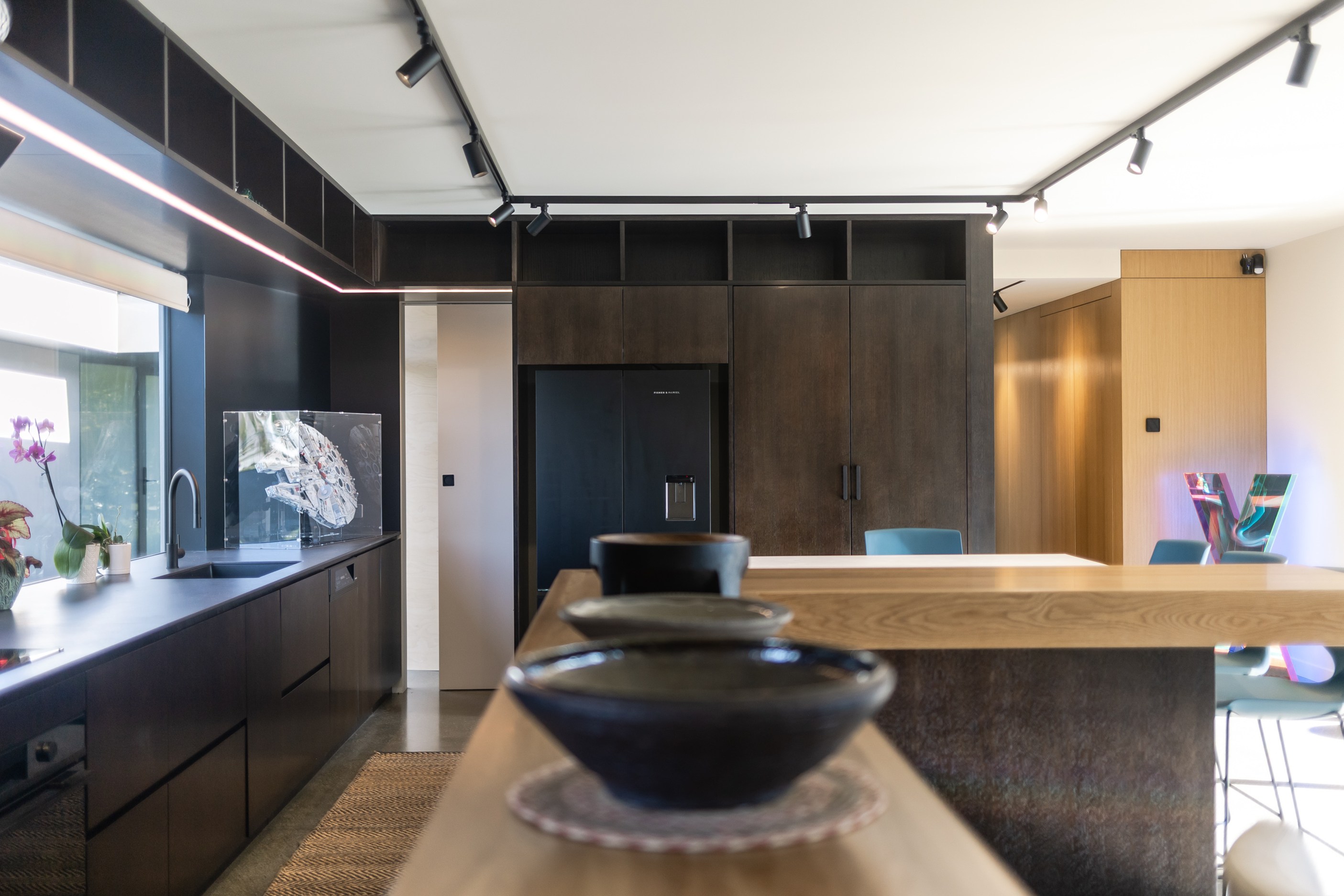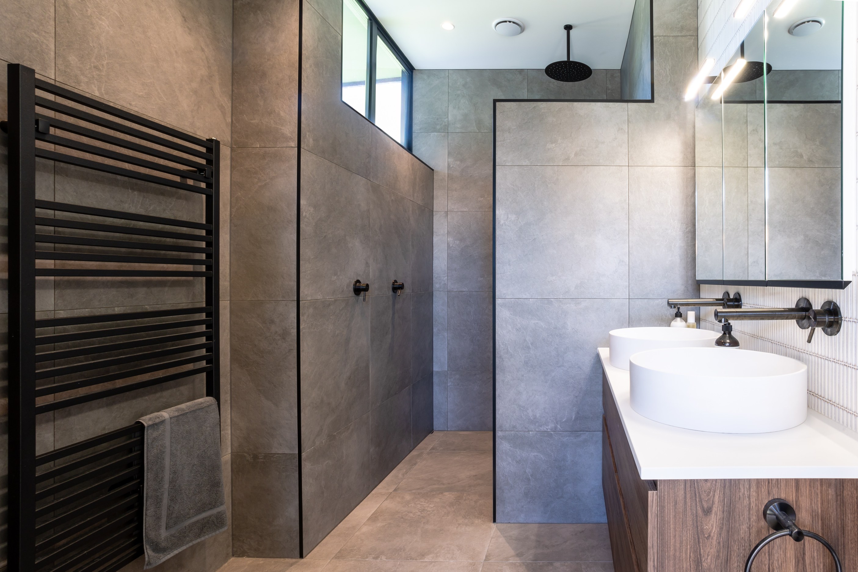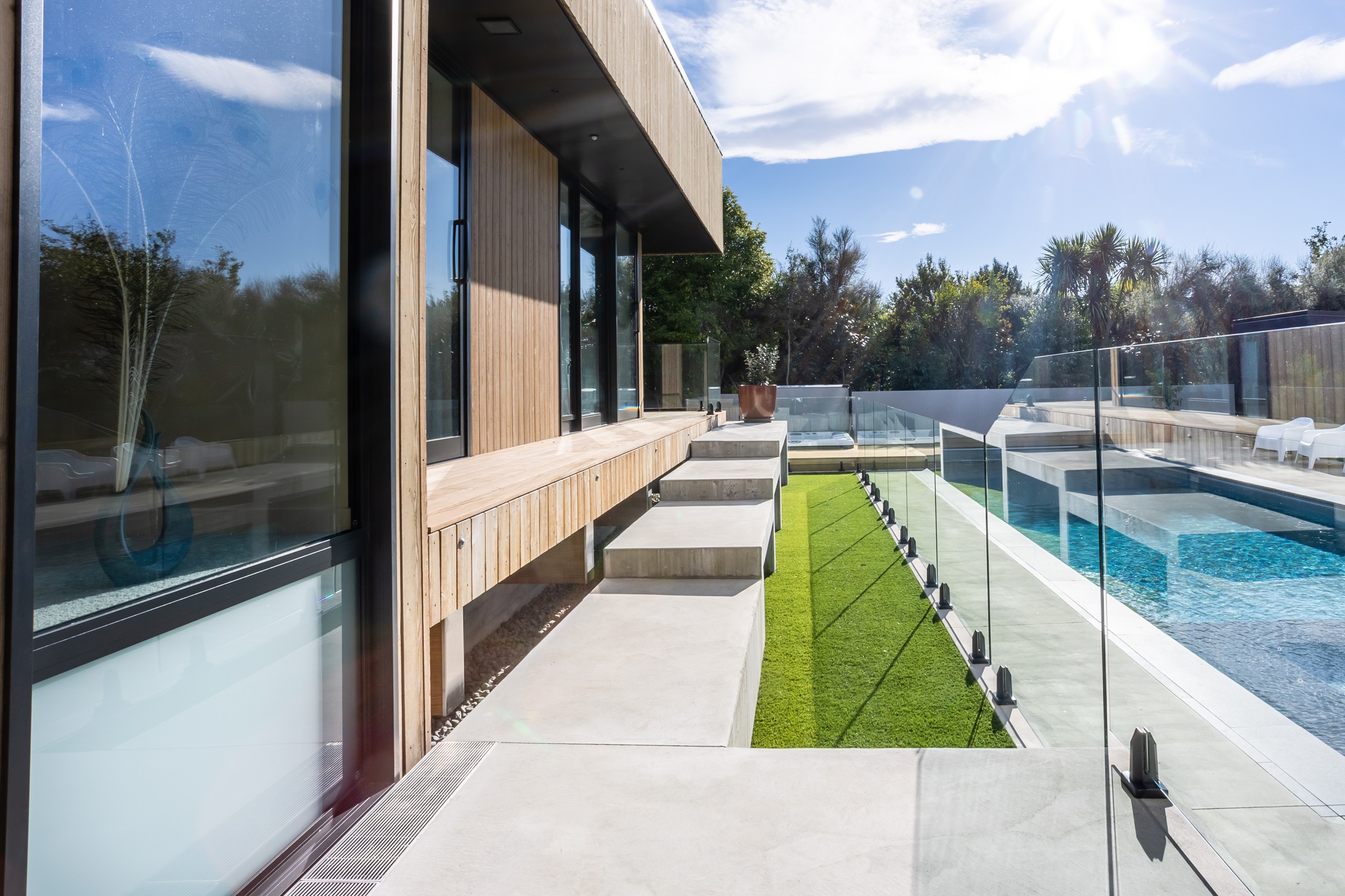 Step inside via a warm and tactile American white oak wall-panelled entryway. To the left, a passage leads to the elevated main bedroom suite and a serene, light-filled office. To the right, you’ll find the heart of the home — a space grounded in natural tones and polished concrete floors, anchored by an oversized, stone-topped kitchen island. This zone flows effortlessly into the dining and living areas, subtly divided by custom joinery that features a striking two-way gas fireplace. These open to covered patios, decking, an outdoor fire and the undisputed stars: a 15m lap pool and spa pool. It’s a heavenly space with lawn, landscaping and connections to every part of the U-shaped home. On the far side is the guest wing with two bedrooms and a bathroom, plus laundry. This 306sqm semi-rural home serves up tranquil living, privacy, flexibility and low-key luxe in perfect measure, as well as building artistry.