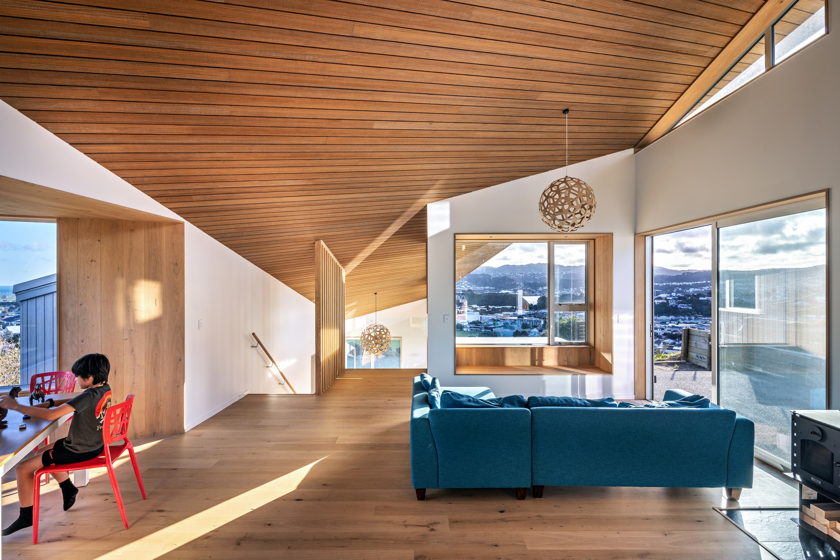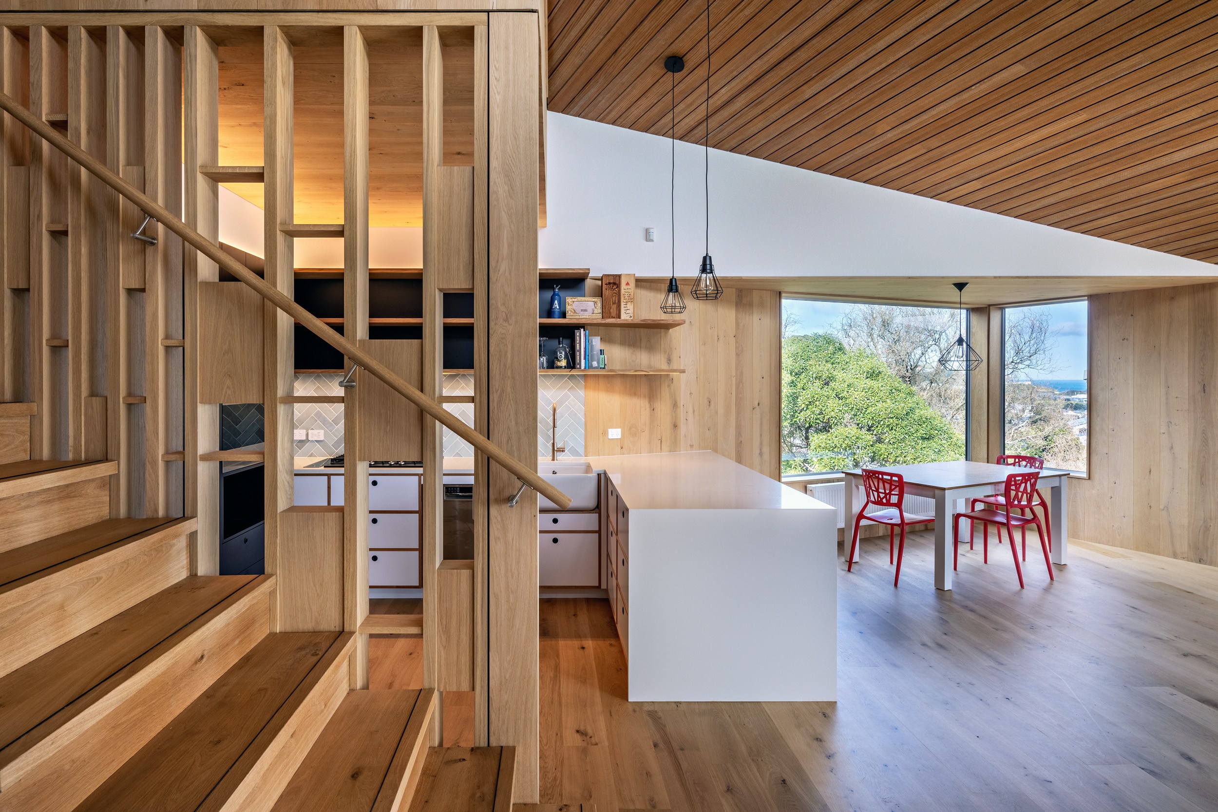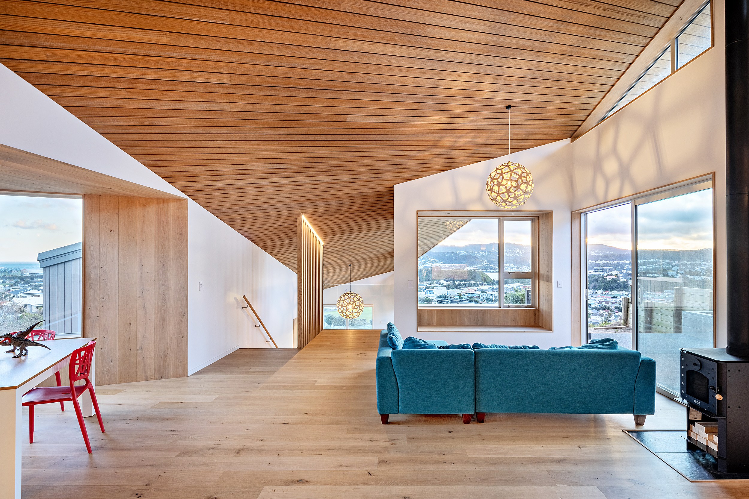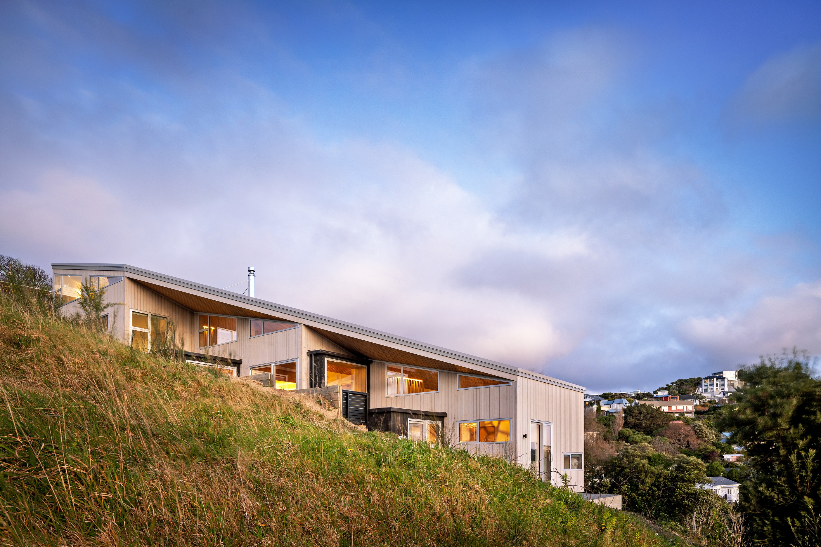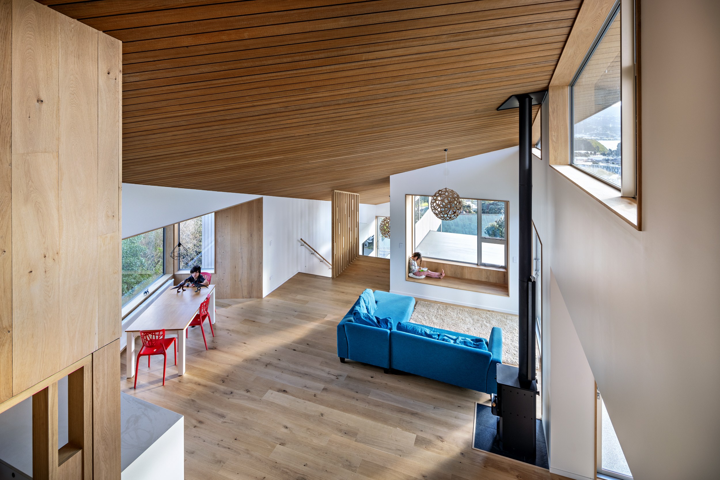 Seldom are homes with stellar views so in tune with their landscape. This 164sqm house offers vistas to Cook Strait and the Kaikōura Ranges, yet anchors itself to its environs by hugging the contours of Wellington’s eastern hills. Although a split-level home with myriad angles, a single roof plane engenders the sense of cohesion, as does vertical timber cladding and timber-lined soffits. Inside, this brilliantly executed four-bedroom house is just as flawless. A single-plane timber ceiling ties the three levels together and clerestory windows help to usher the outside in. Transitions between the levels and spaces are smooth and intuitive.