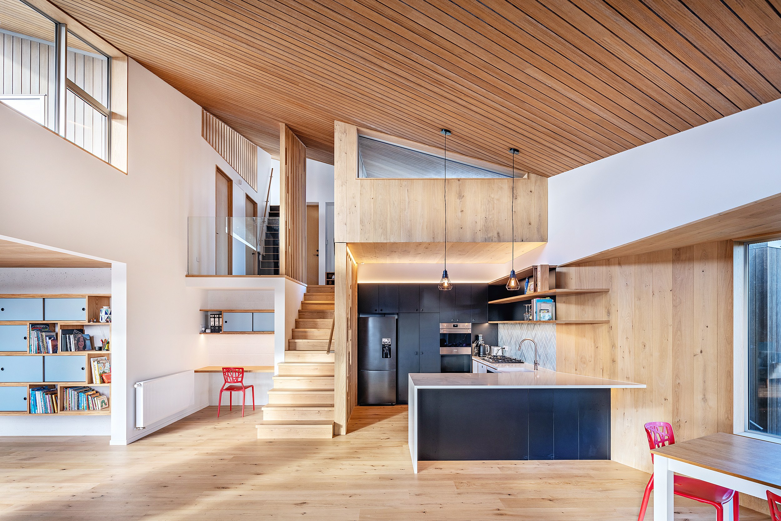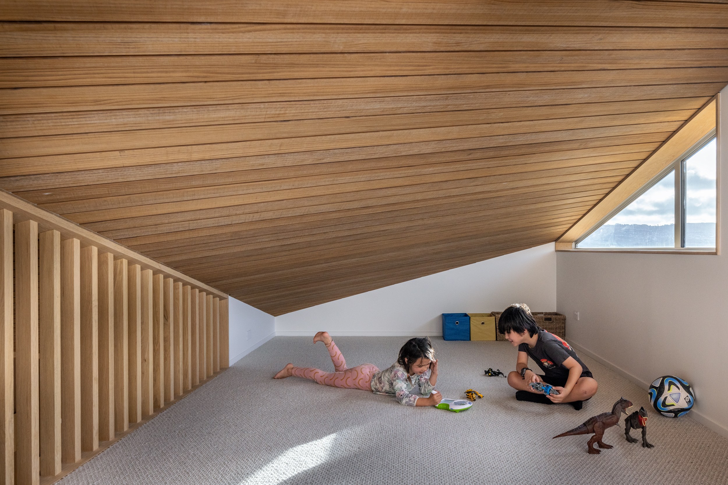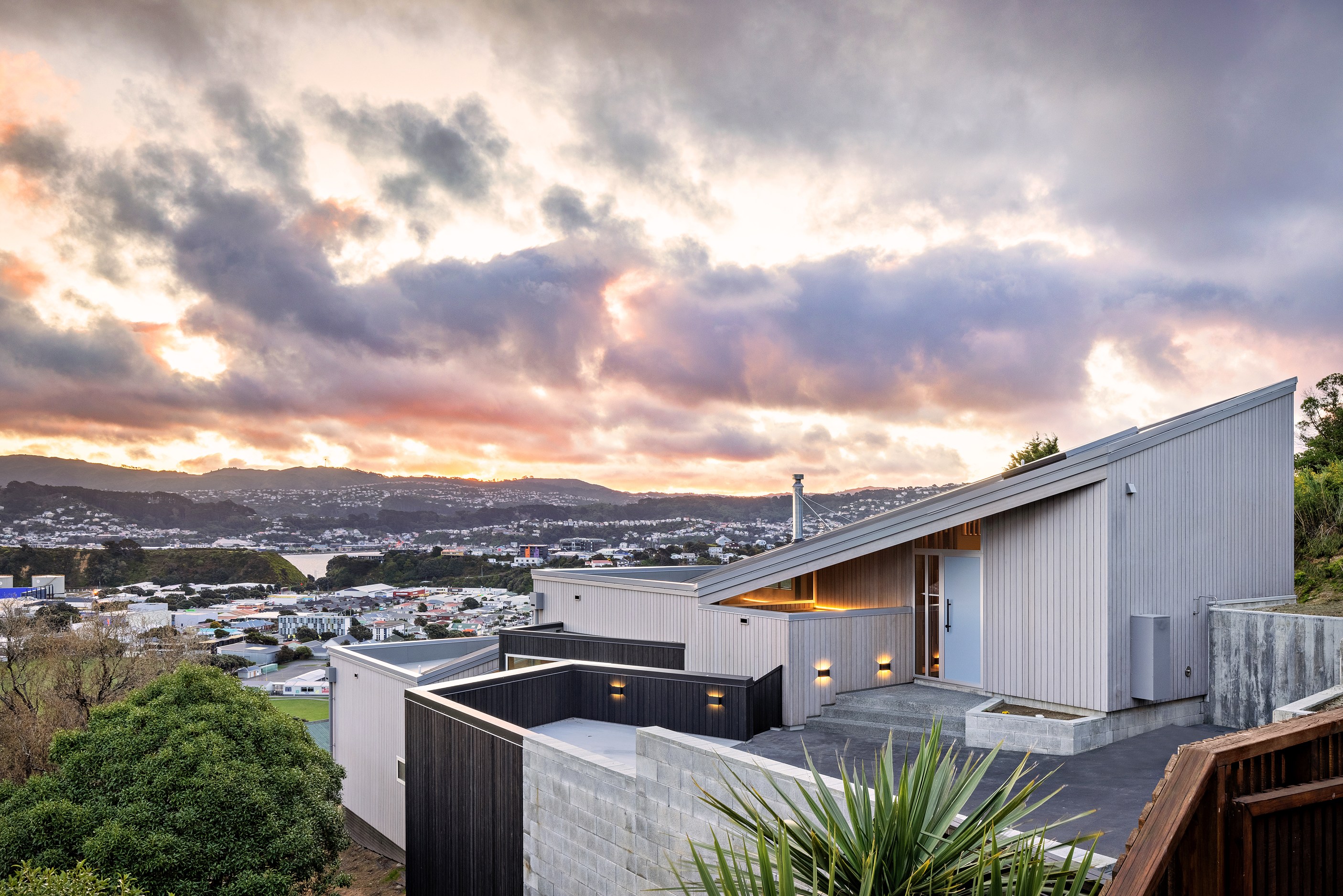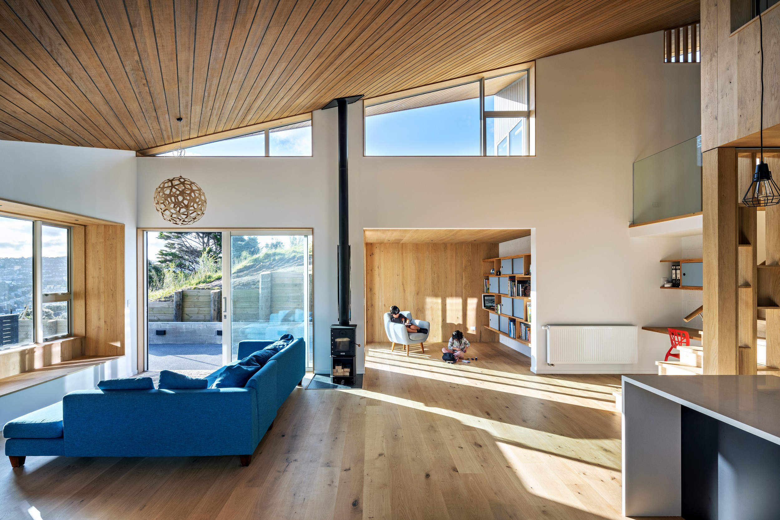 Seldom are homes with stellar views so in tune with their landscape. This 164sqm house offers vistas to Cook Strait and the Kaikōura Ranges, yet anchors itself to its environs by hugging the contours of Wellington’s eastern hills. Although a split-level home with myriad angles, a single roof plane engenders the sense of cohesion, as does vertical timber cladding and timber-lined soffits. Inside, this brilliantly executed four-bedroom house is just as flawless. A single-plane timber ceiling ties the three levels together and clerestory windows help to usher the outside in. Transitions between the levels and spaces are smooth and intuitive.