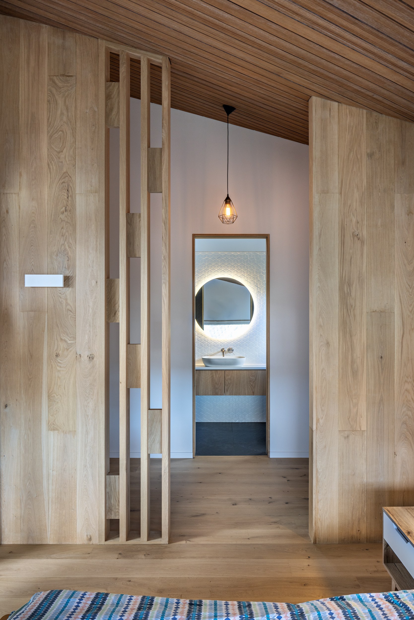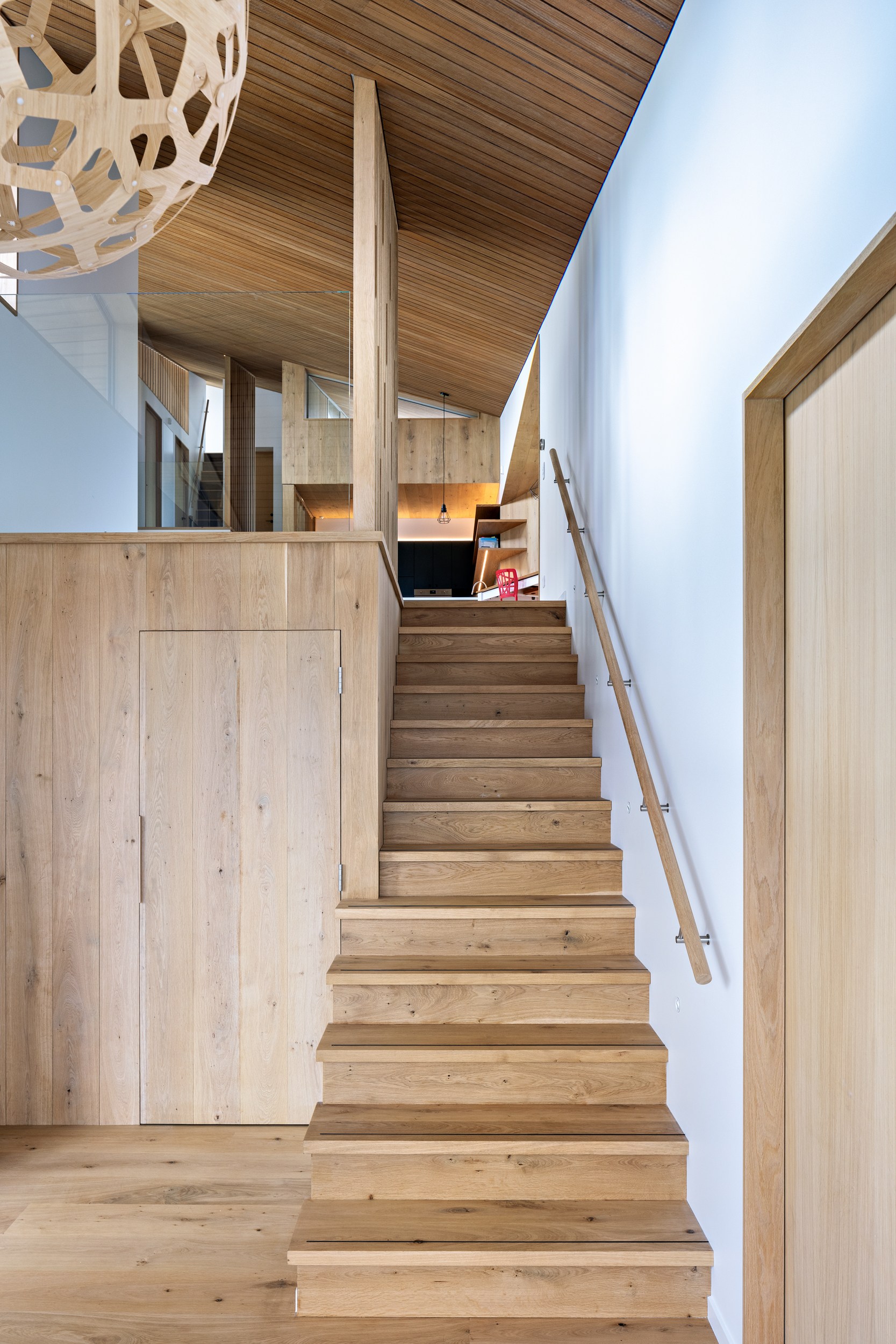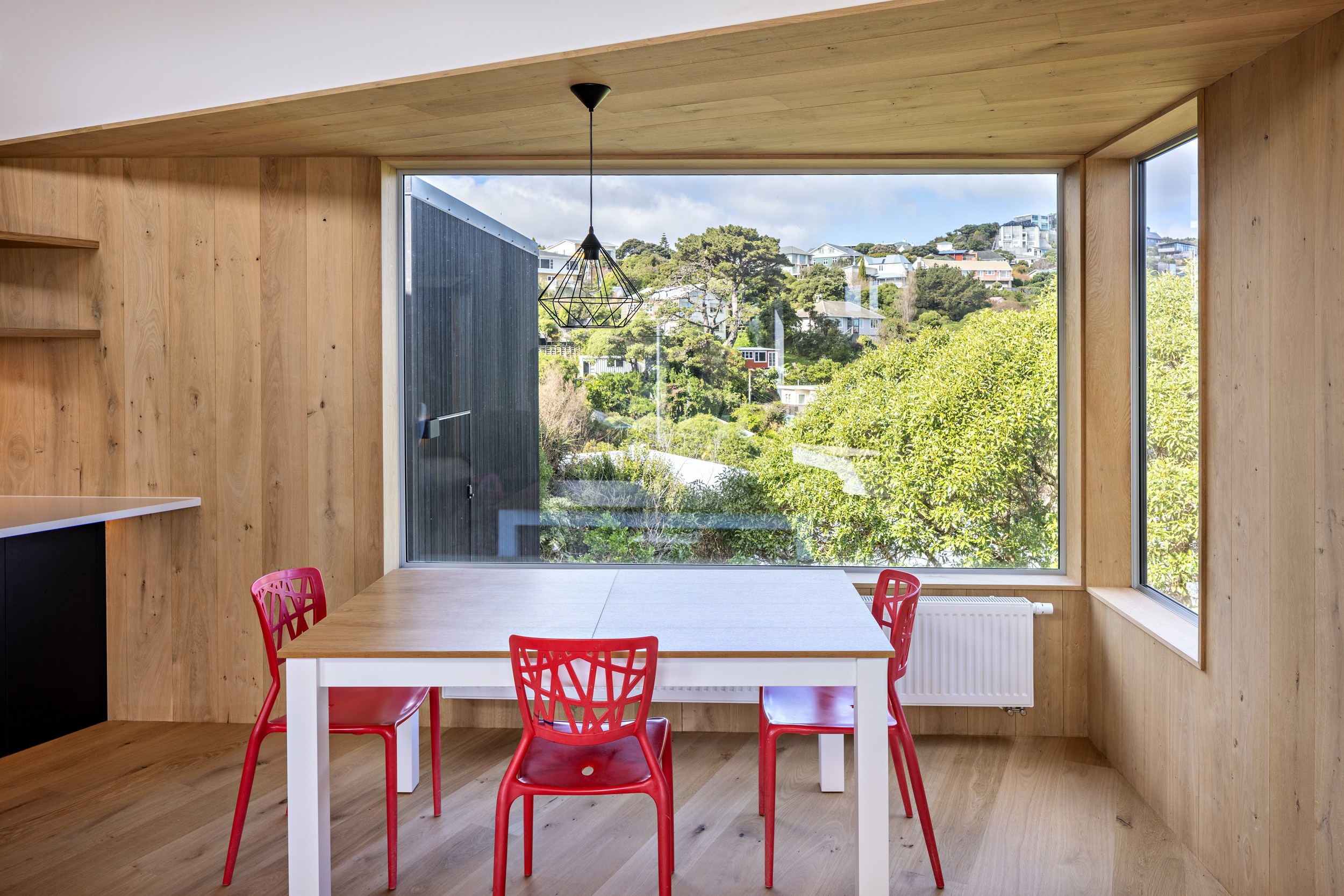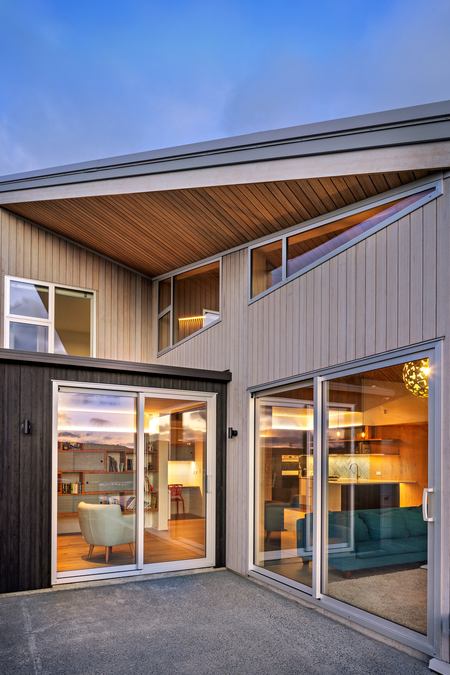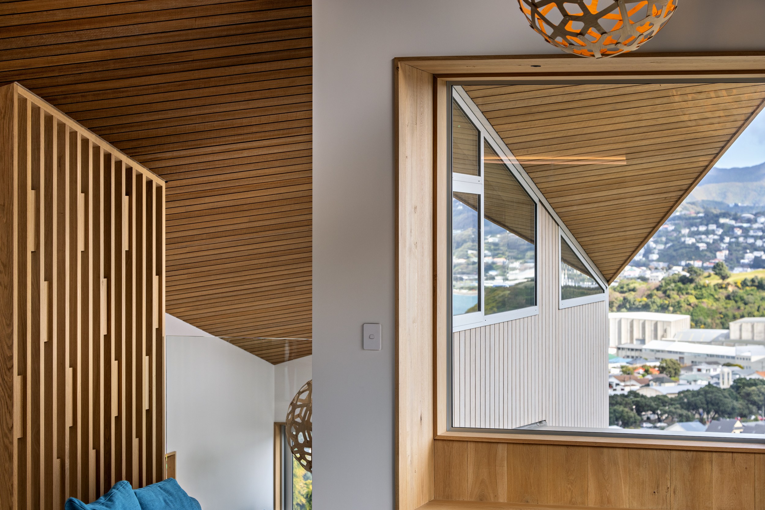 Seldom are homes with stellar views so in tune with their landscape. This 164sqm house offers vistas to Cook Strait and the Kaikōura Ranges, yet anchors itself to its environs by hugging the contours of Wellington’s eastern hills. Although a split-level home with myriad angles, a single roof plane engenders the sense of cohesion, as does vertical timber cladding and timber-lined soffits. Inside, this brilliantly executed four-bedroom house is just as flawless. A single-plane timber ceiling ties the three levels together and clerestory windows help to usher the outside in. Transitions between the levels and spaces are smooth and intuitive.