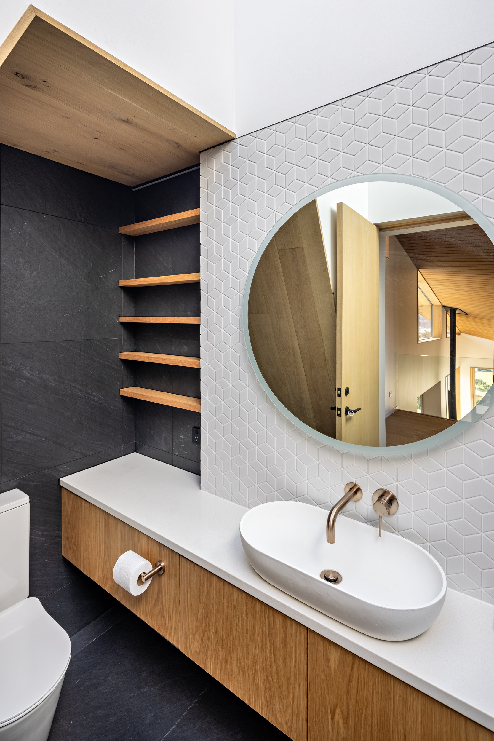 Timber is a constant: you’ll see it on the floors, stairs, balustrades, feature screening, window linings, a window seat and other built-in furniture. It’s the ideal backdrop for the framed views of sea, sky and greenery. It’s also further evidence of the builders’ skills and attention to detail. Given the complexity of the project, every detail had to be thoroughly thought through, and this is where teamwork came in. A close working relationship between the client, architect and builders involved fostering an environment in which details, methods and ideas could be shared and issues resolved. This was just as important as the top-drawer craftsmanship, and has resulted in a stunning outcome for the clients.