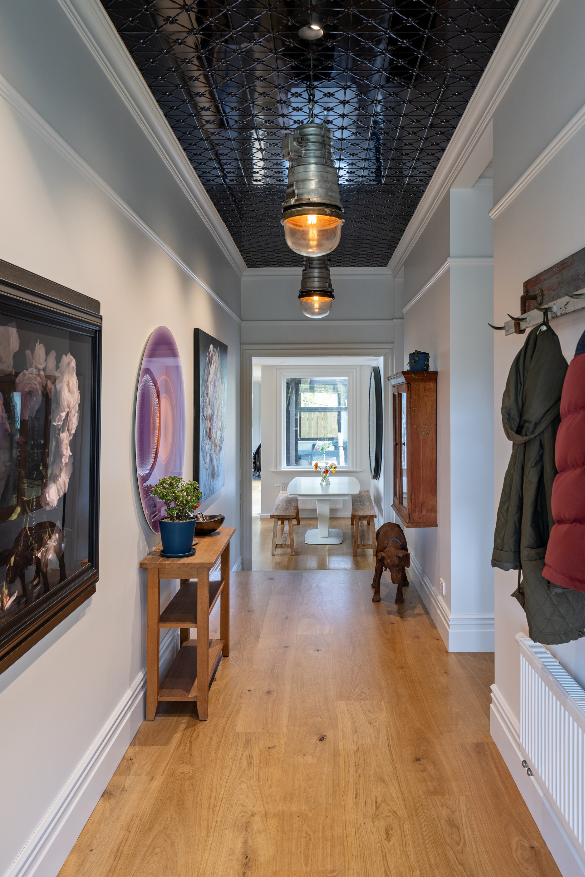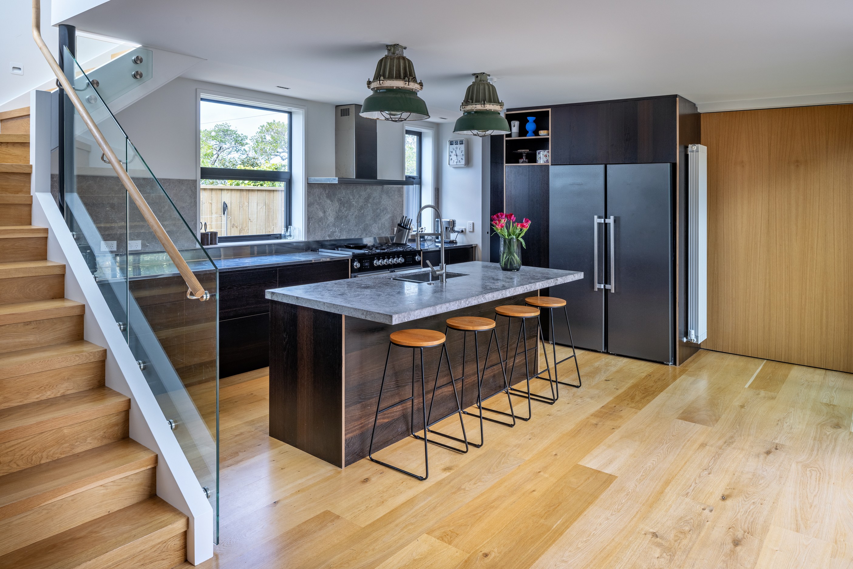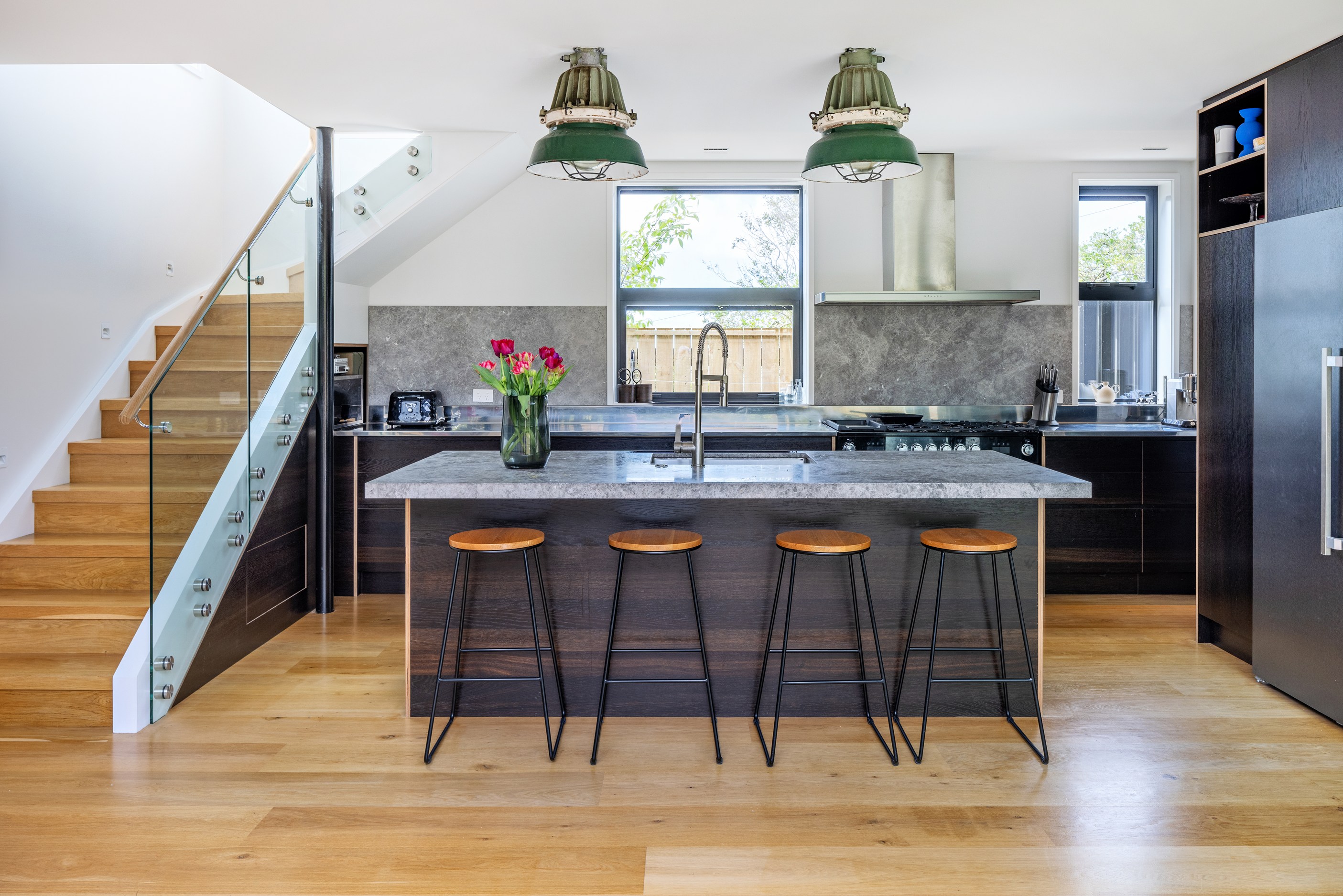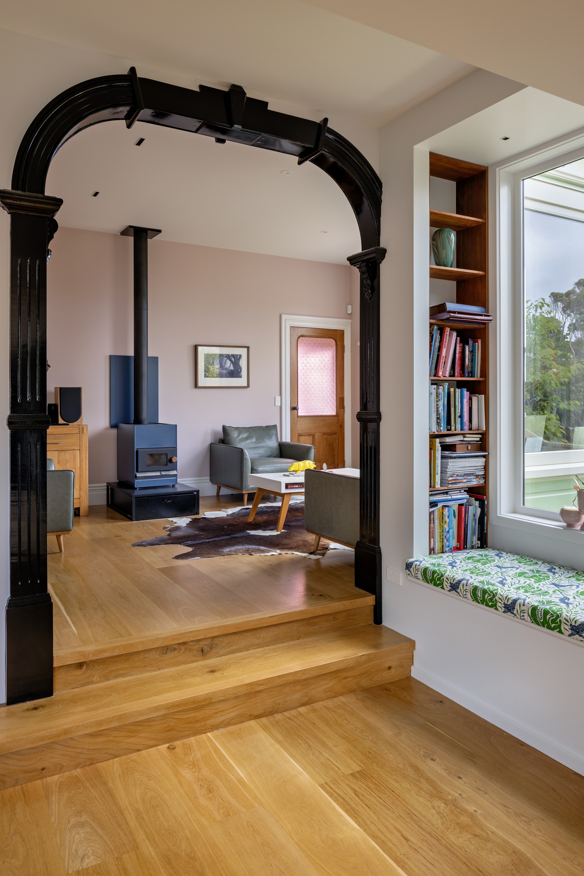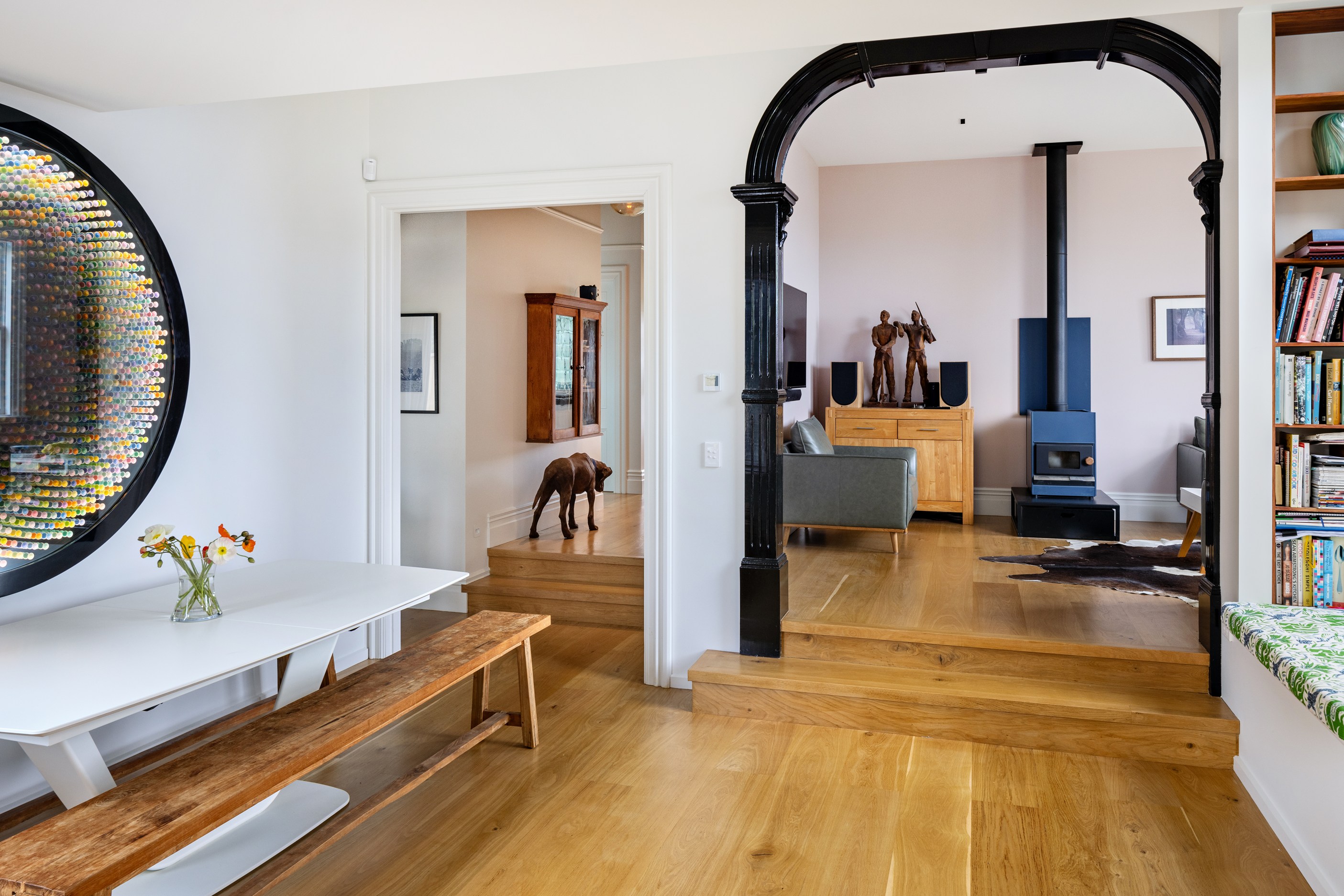 At the back of the historical weatherboard house is a tall, dark and handsome wing clad in standing-seam vertical metal. The house now has the best of modern amenities and conveniences as well as five bedrooms, three bathrooms and three living areas. The existing house is devoted to bedrooms, living spaces and a dining room that links to the extension. The connection is seamless. On the ground floor is the sleek moody-hued kitchen with a scullery. This and a family room spill out to a sheltered patio. Take the timber stairs to the upper floor to find the main-bedroom suite, plus another with an ensuite. Here, family comes first.