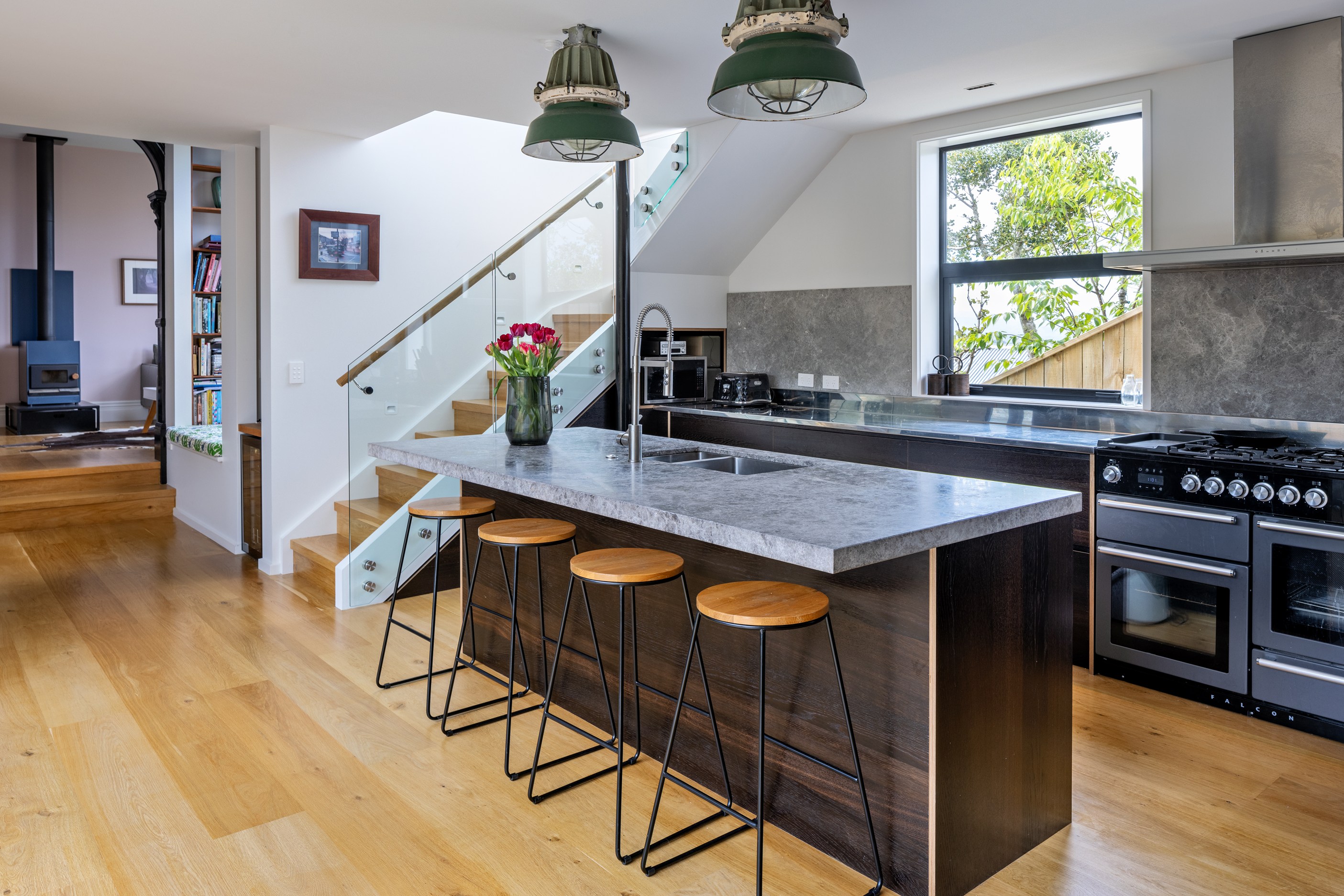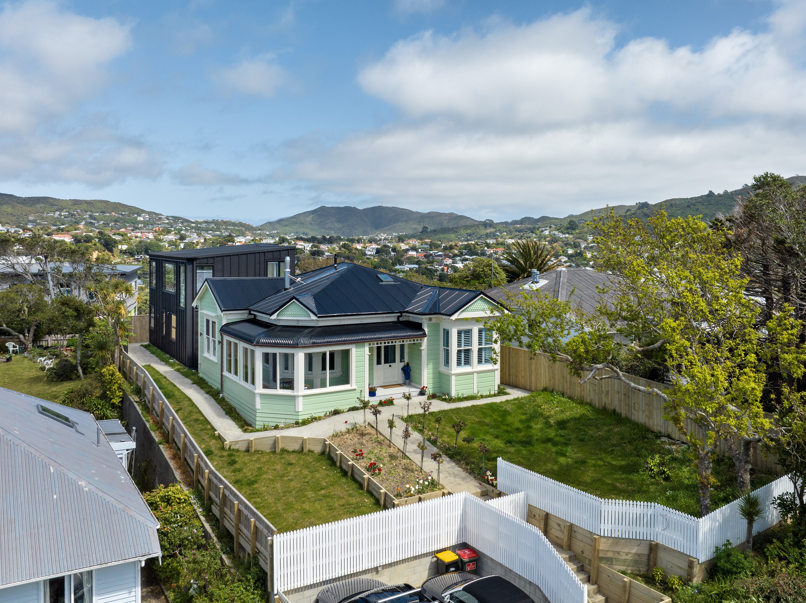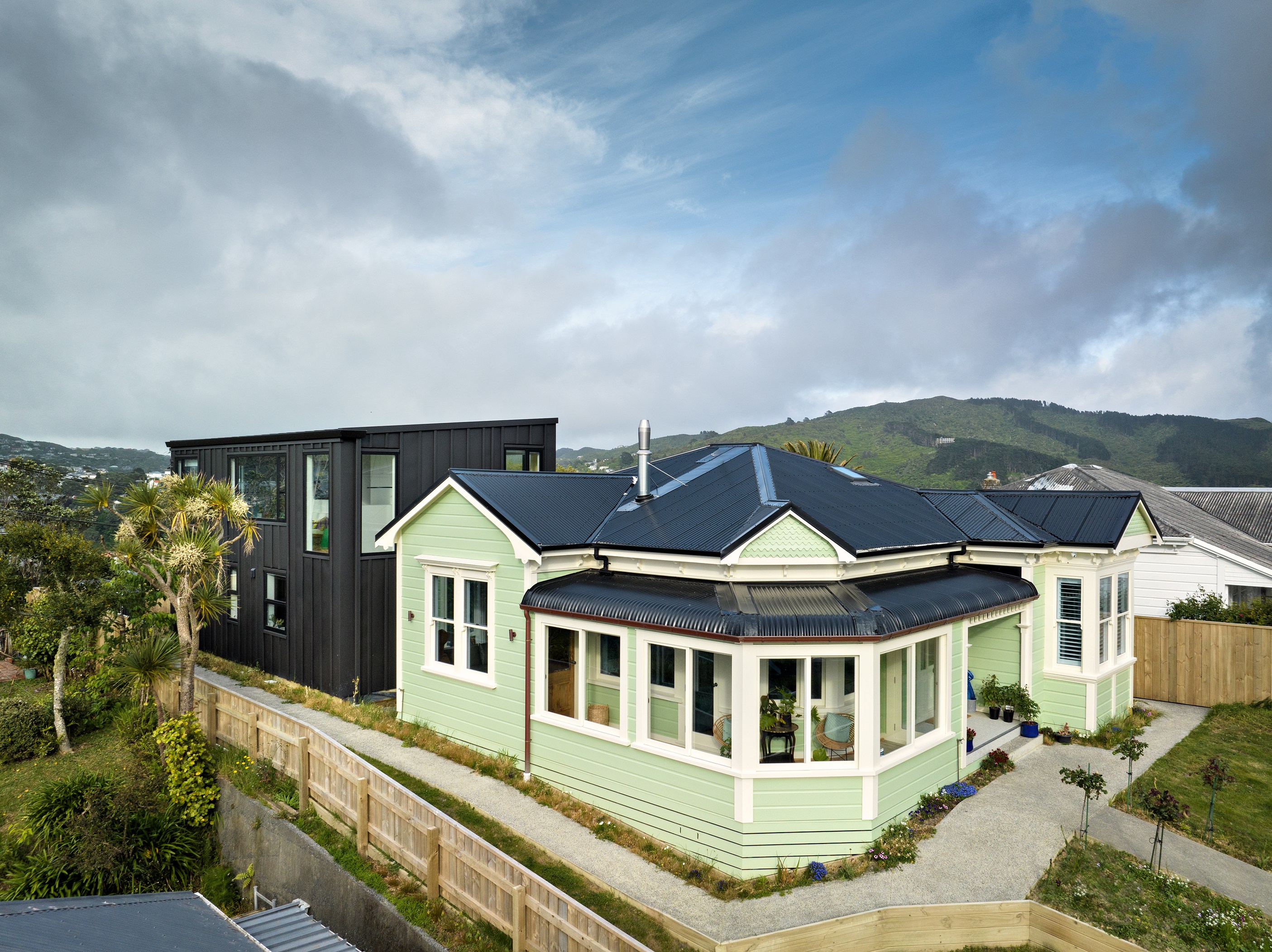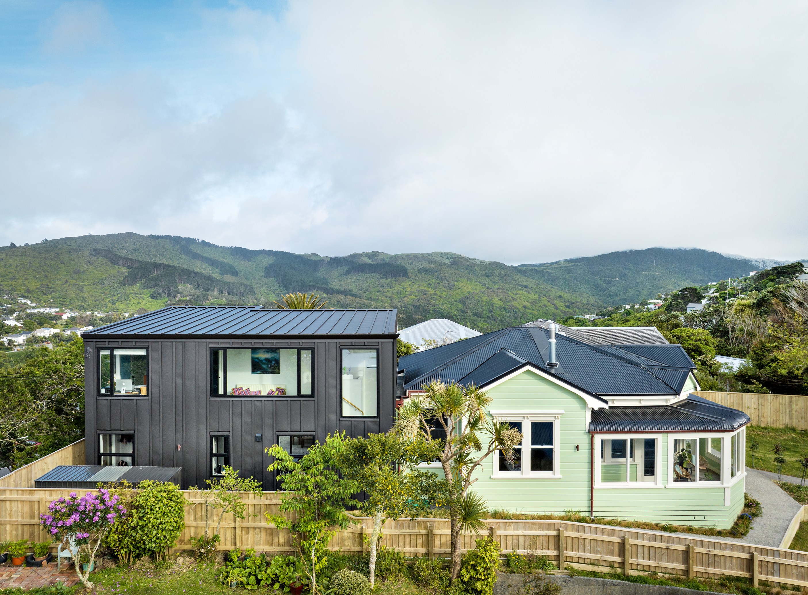 This renovation and extension project covers every base for the people who live here. The family now has a new place to gather, a revamped formal lounge, a sheltered courtyard and upstairs bedroom suites. There’s plenty of hang-out space for both adults and teenagers, and from upstairs they can enjoy sweeping views that include the Hutt Valley and Wellington’s harbour and heads. The project started with a Queen Anne-style villa on an elevated site. An extension was required to cater for everyone and their interests. How best, then, to achieve it? An addition in keeping with the style, or something completely different? The owners went with the latter, an architecturally distinct form that’s as intriguing as it is striking.